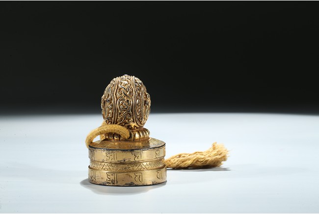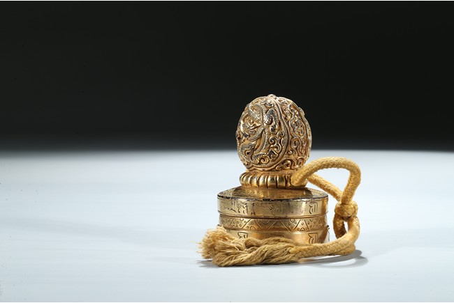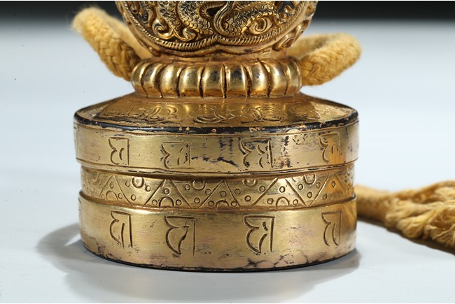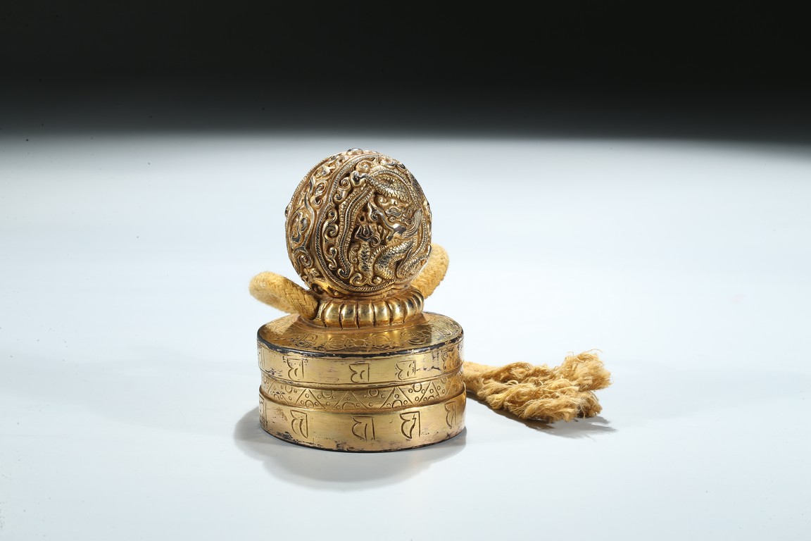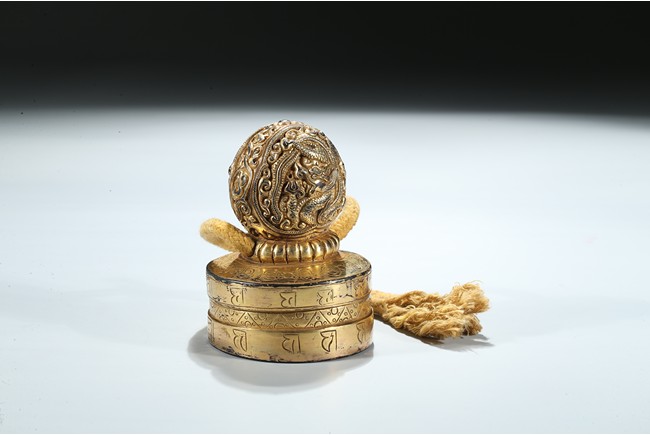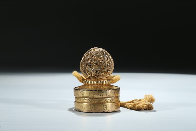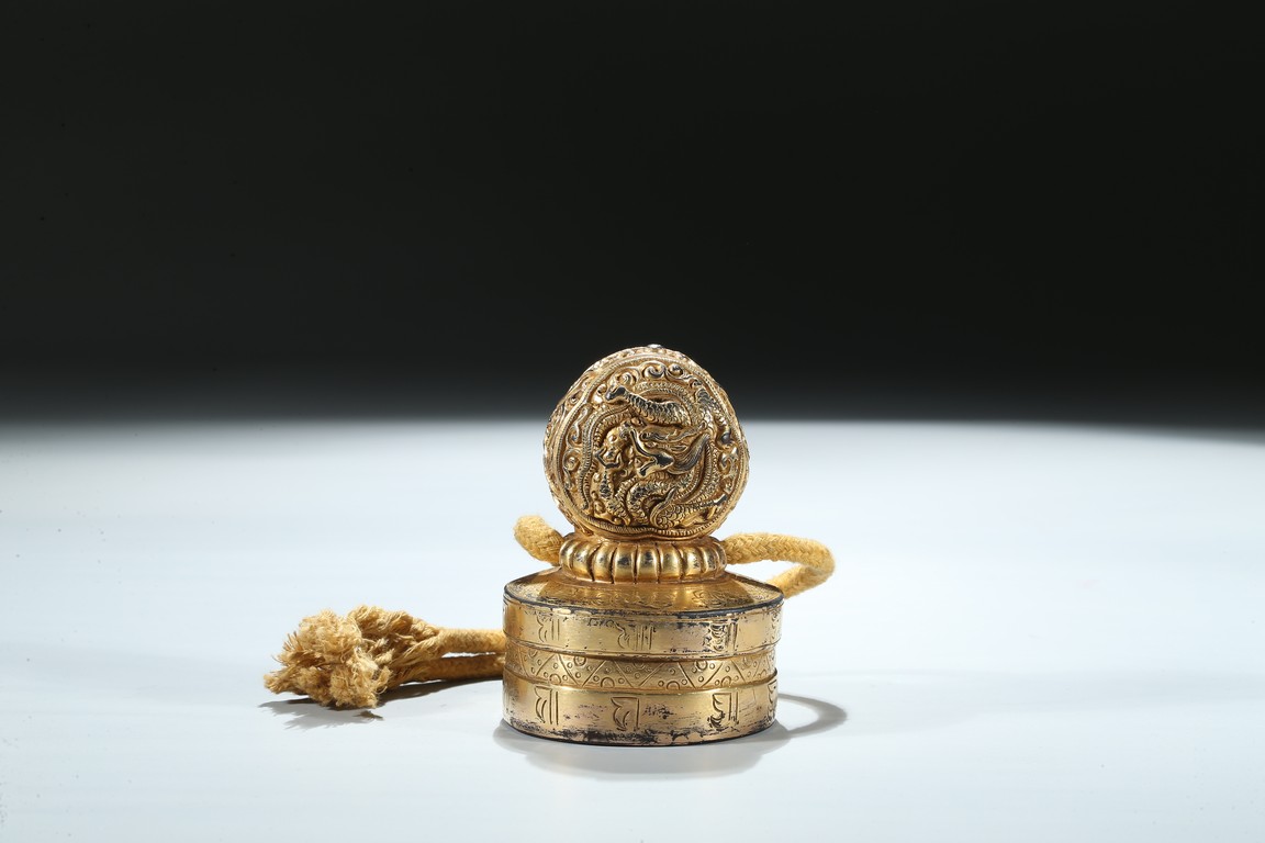 Of circular section, the seal is surmounted with a bud-shaped finial modelled as a ferocious twisting dragon emerging from cloud scrolls, the side of the seal incised with a band of Tibetan scripts and geometric pattern, the seal face carved with three columns of inscription in Tibetan, Manchu, and Chinese script. Qing Dynasty period.