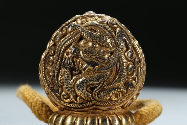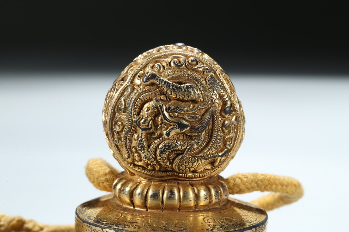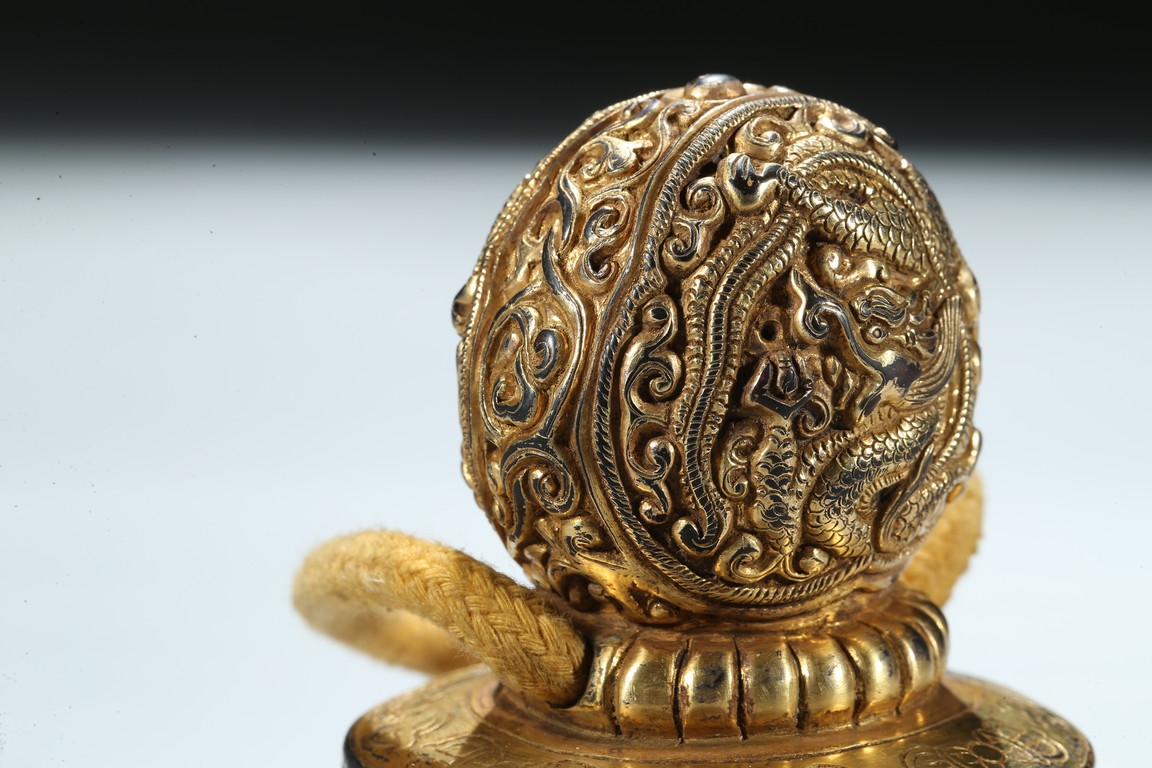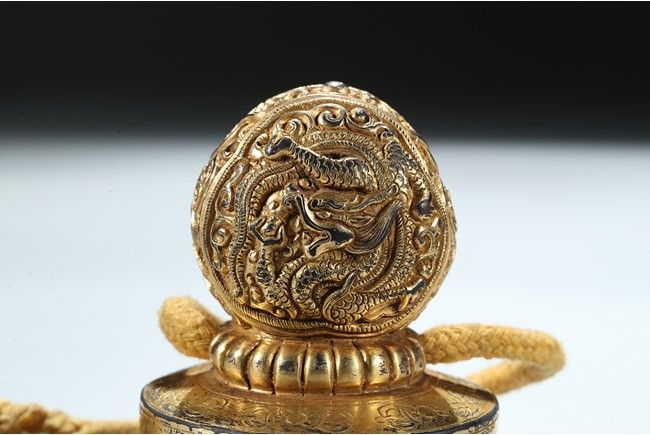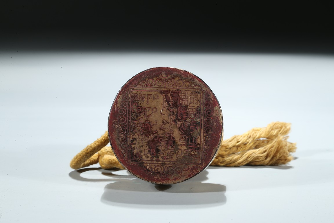 Of circular section, the seal is surmounted with a bud-shaped finial modelled as a ferocious twisting dragon emerging from cloud scrolls, the side of the seal incised with a band of Tibetan scripts and geometric pattern, the seal face carved with three columns of inscription in Tibetan, Manchu, and Chinese script. Qing Dynasty period.