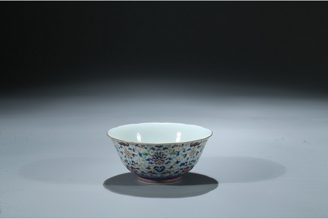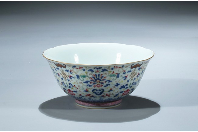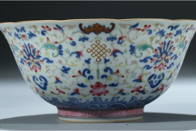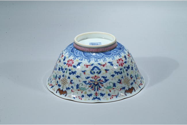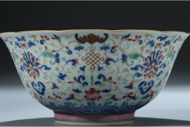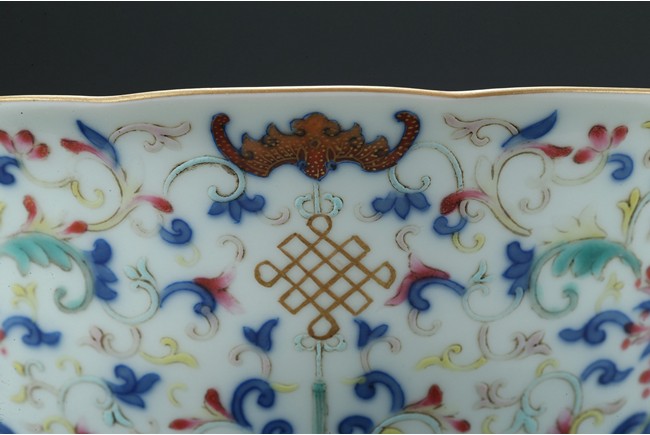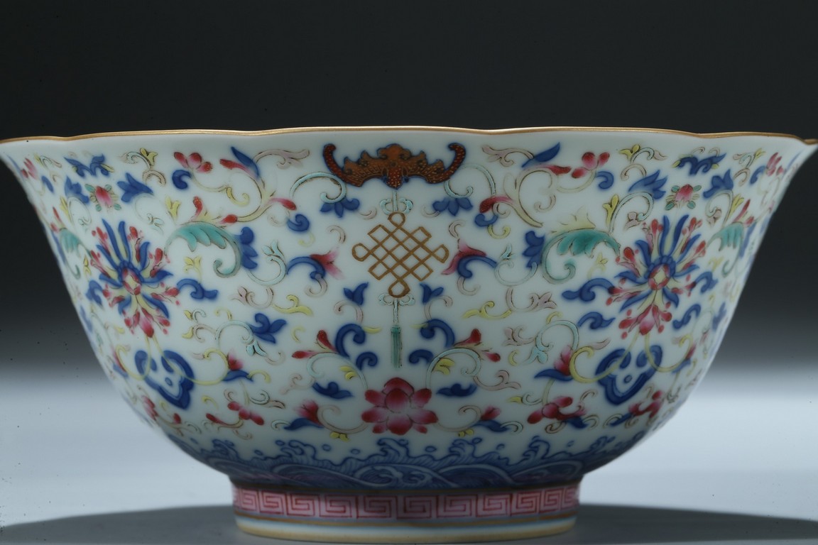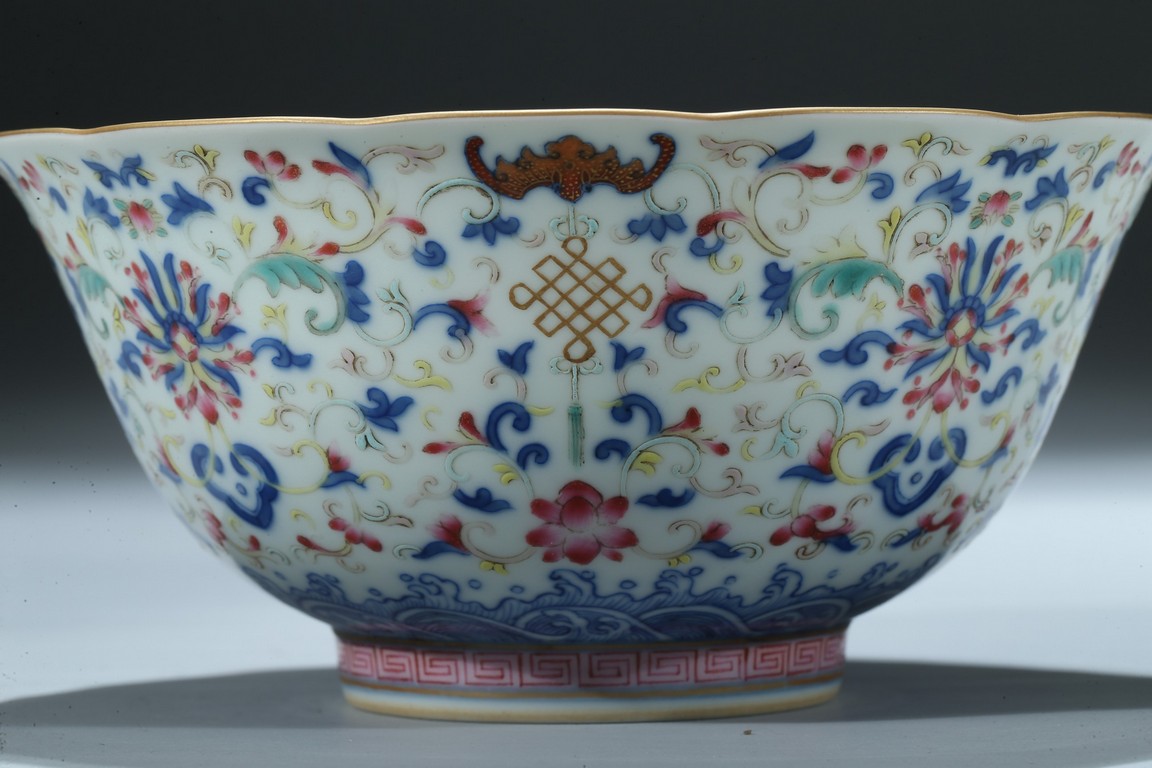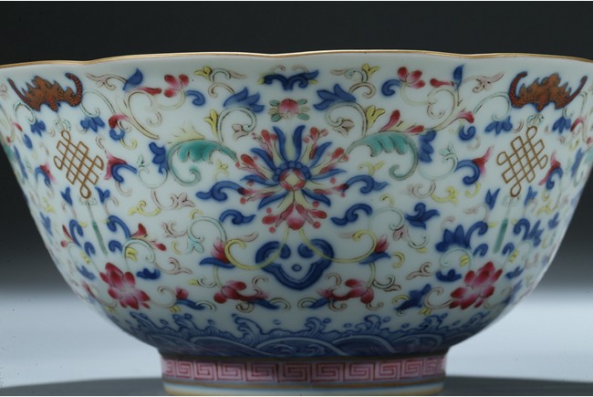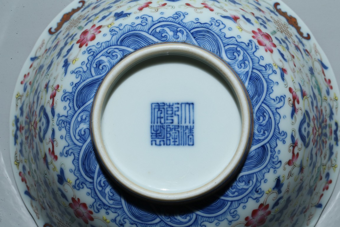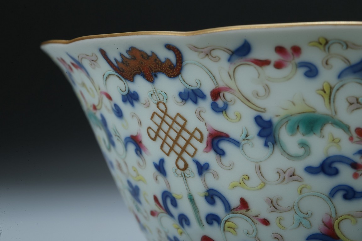 Of rounded sides and rising to a slightly lobed rim, the body finely enamelled with lotus flower borne on meandering scrolls and bat grasping a knot motif, all above underglaze blue glazed crashing waves to the base rim, the underside inscribed with six character Qianlong mark. Qing Dynasty period.