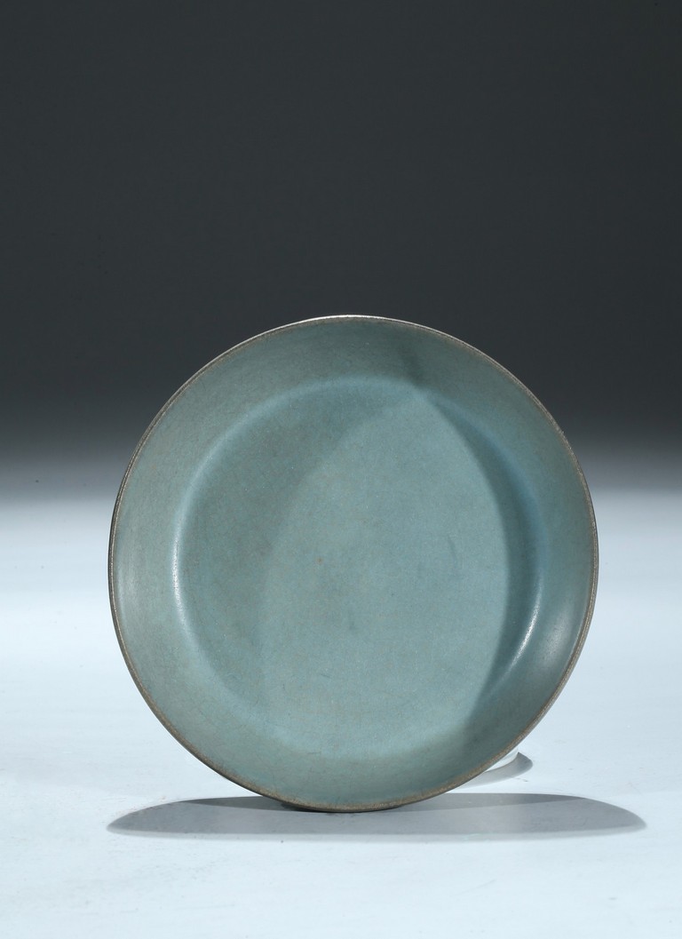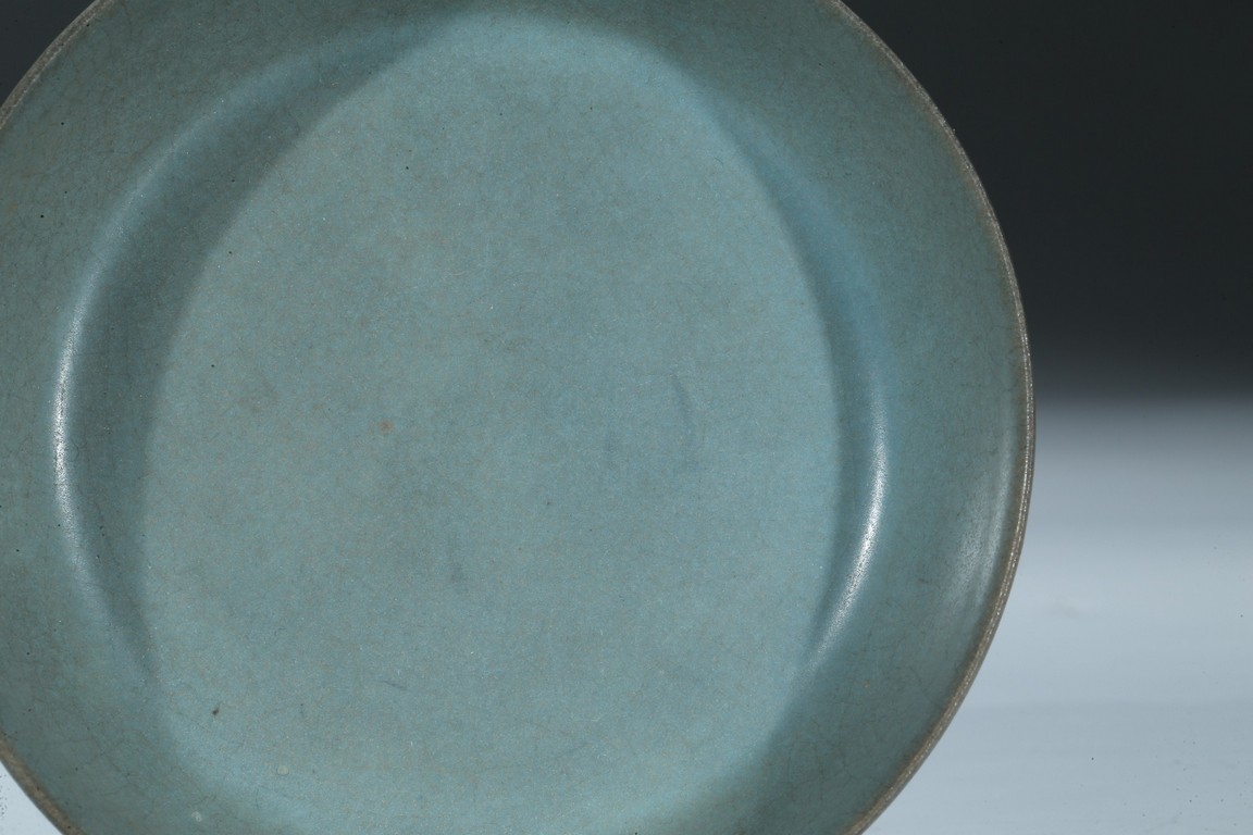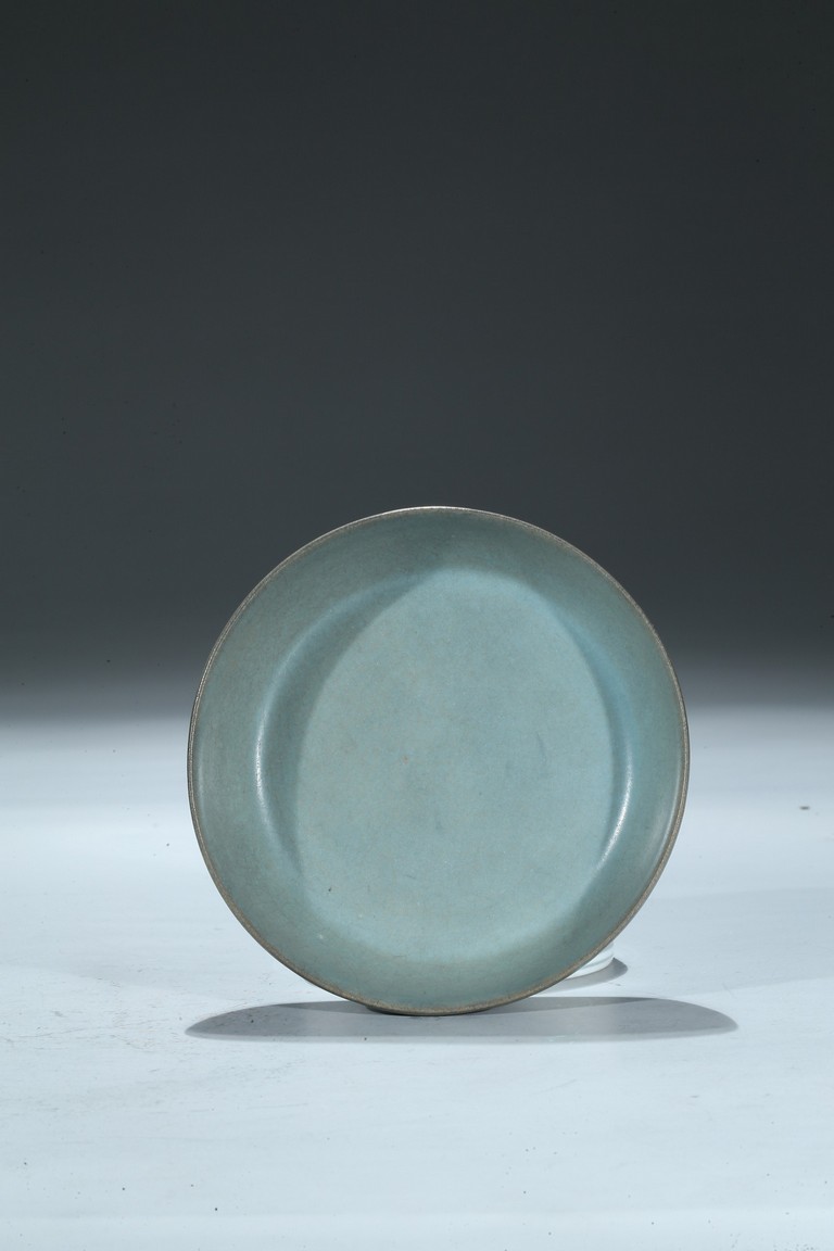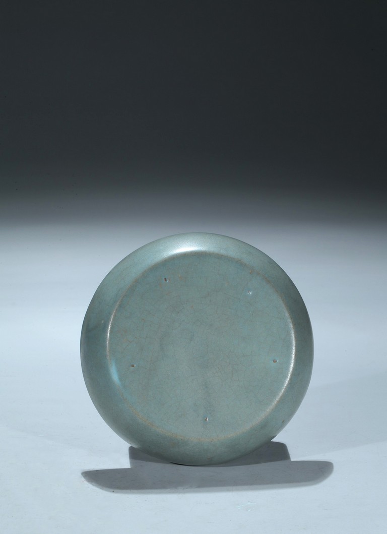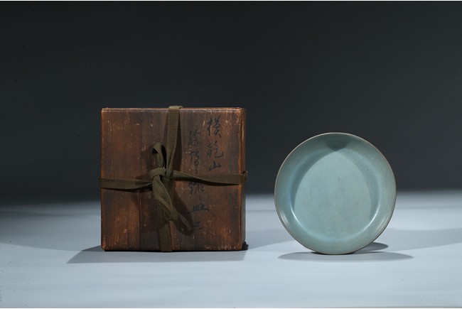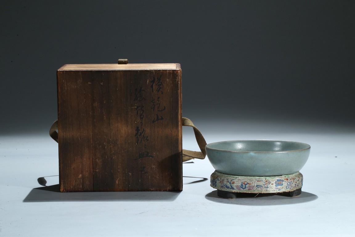 此洗口微敞,裡外施釉,平底無足,釉色呈天青色,猶如雨過放晴的天空呈現出的淡雅自然青色,正如宋徽宗之名句: “雨過天晴雲破處,者般顏色作將來”。底部有五細小支釘痕,釉汁厚潤細膩,平滑猶如堆脂,滋潤柔和,撫之如玉如絹。更為難得的是整器品相完整,此洗之珍貴不言而喻。配原裝日本木盒。來源:南加州聖地亞哥家族收藏,上世紀70-80年代購於日本 Provenance: Private collection, San Diego, California. Acquired between 1970s - 1980s in Japan.