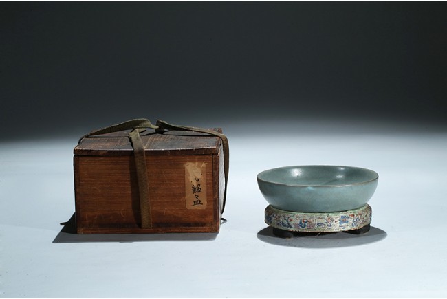 Of shallow rounded sides, the finely potted washer is covered overall with an attractive blueish green glaze suffused with network of light ice crackles, the washer base with five spur marks, accompanied with a stand and a Japanese wood box. Song Dynasty period.