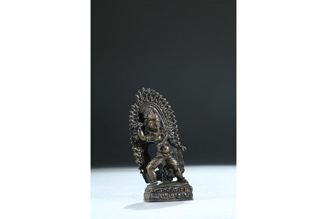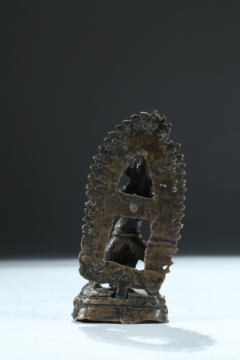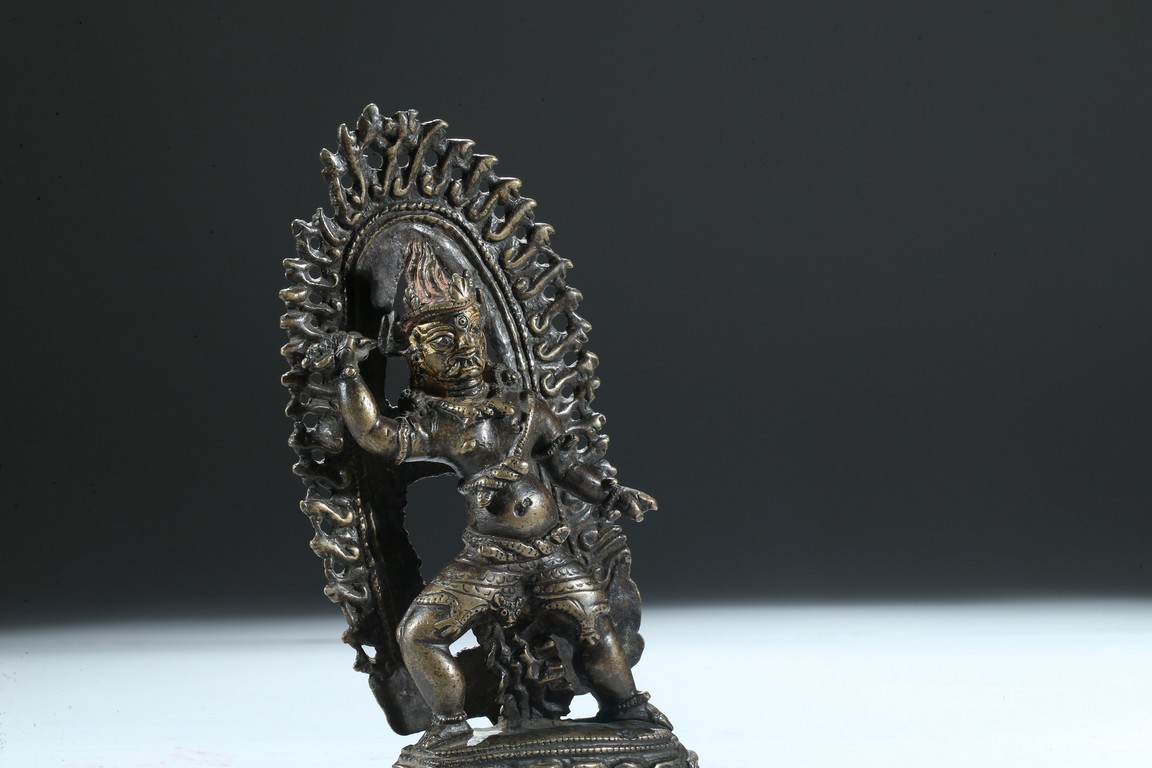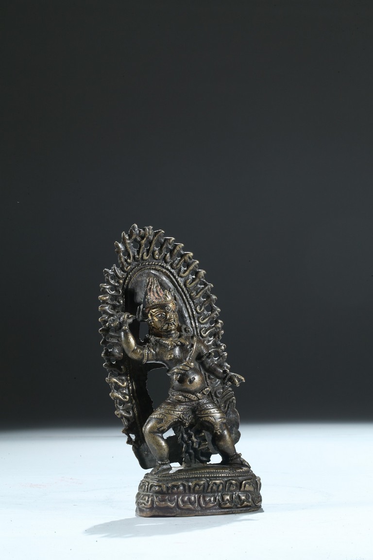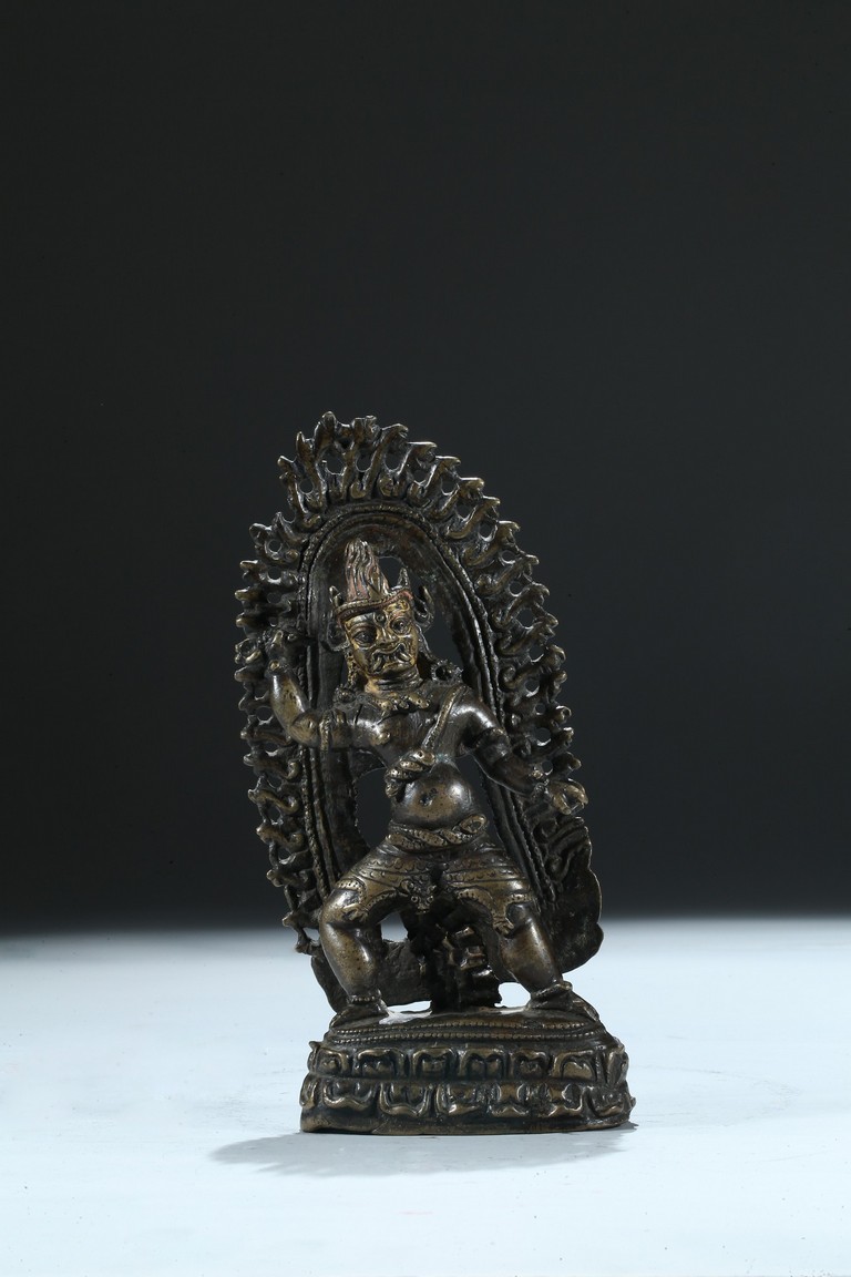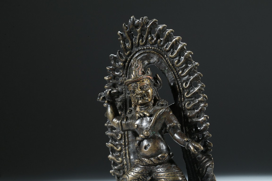 Cast standing over a double lotus throne, the right arm raised clutching a vajra, the ferocious face with bulging eyes and an opened mouth revealing bared fangs, backed by a large flame form mandorla. 13th century.