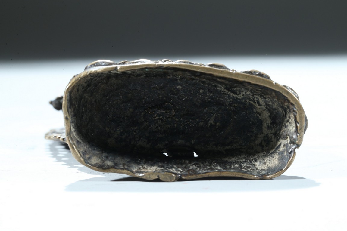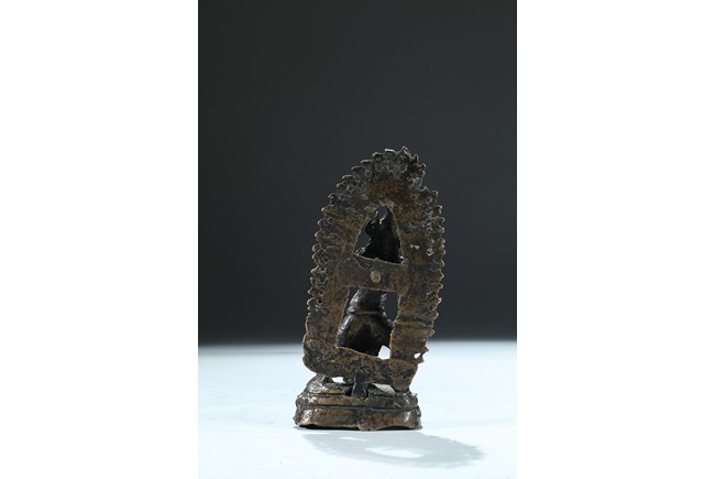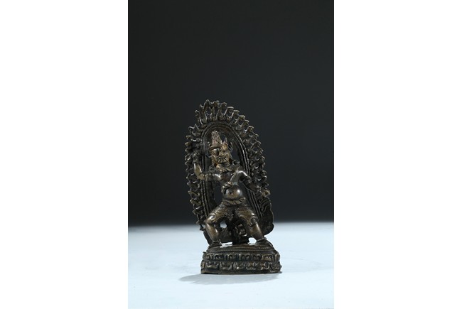 金剛手菩薩,因手執金剛杵,常侍衛於佛,故稱之為金剛手菩薩,具有除惡降魔的廣大神力。也為八大菩薩(觀音、彌勒、虛空藏、普賢、金剛手、文殊、地藏、除蓋障)之一。此尊焰發豎立,頭戴五葉冠飾。面龐豐肥,眉似卷草,雙目圓睜,呲牙捲舌,呈現大忿怒形象。上身軀體短粗,肚腹圓鼓,右手上揚握金剛杵,左手結忿怒拳印,持金剛鈎繩當胸,以骨飾與蛇飾為莊嚴,以虎皮為裙,雙足右屈左伸,展立於蓮花日輪座上,主尊背後有舟形火焰背光。整像銅質瑩潤,工藝細膩,與白居寺壁畫中的護法形象十分類似,尤為難得的是,此尊保存完好,背光、台座均完整無缺,甚值收藏供奉。來源:北加州藏傳佛教學者提供 Provenance: Private collection of a Tibetan buddhism scholar, Northern California