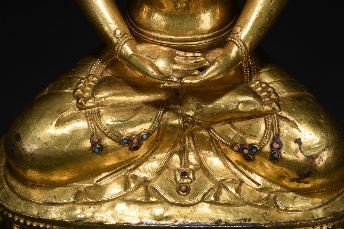 The bodhisattva is shown seated upon a double lotus throne in dhyanasana,hands in dhyana mudra,wearing loose robe and revealing the adorned chest,face with benevolent expression and topped tall ushnisha. Overall richly gilt except face. Early Qing Dynasty period.