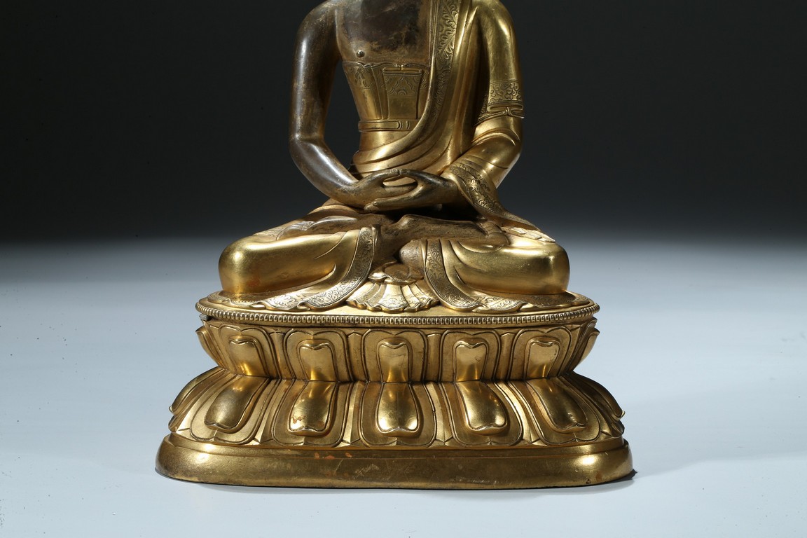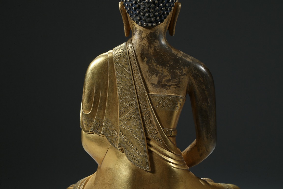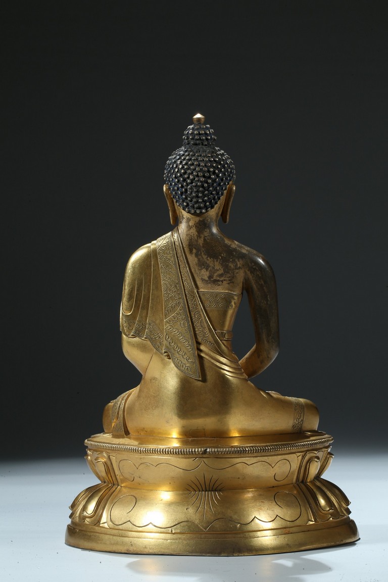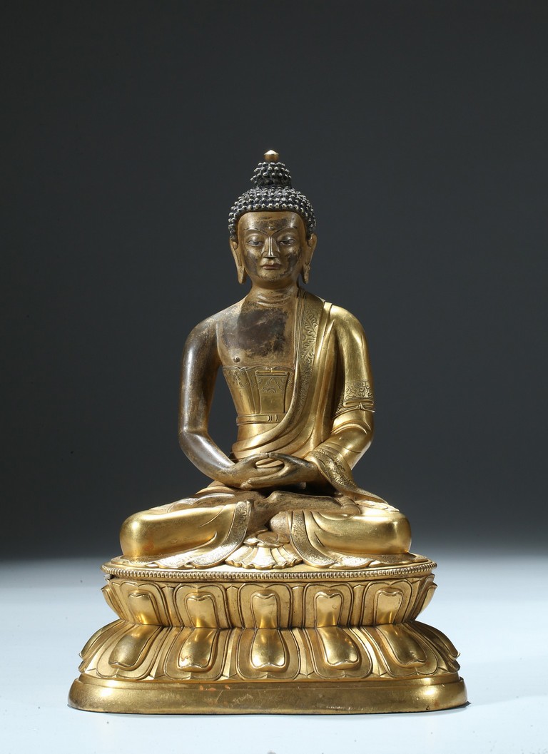 Seated in dhyanasana on a round double-lotus base, his hands resting in dhyana mudra, clad in a robe incised with a floral decoration, with sloping shoulders and a compassionate expression, the hair arranged in tight knots over a pronounced ushnisha, the base sealed and incised with an elaborate double-vajra. 18th century Qing Dynasty period.