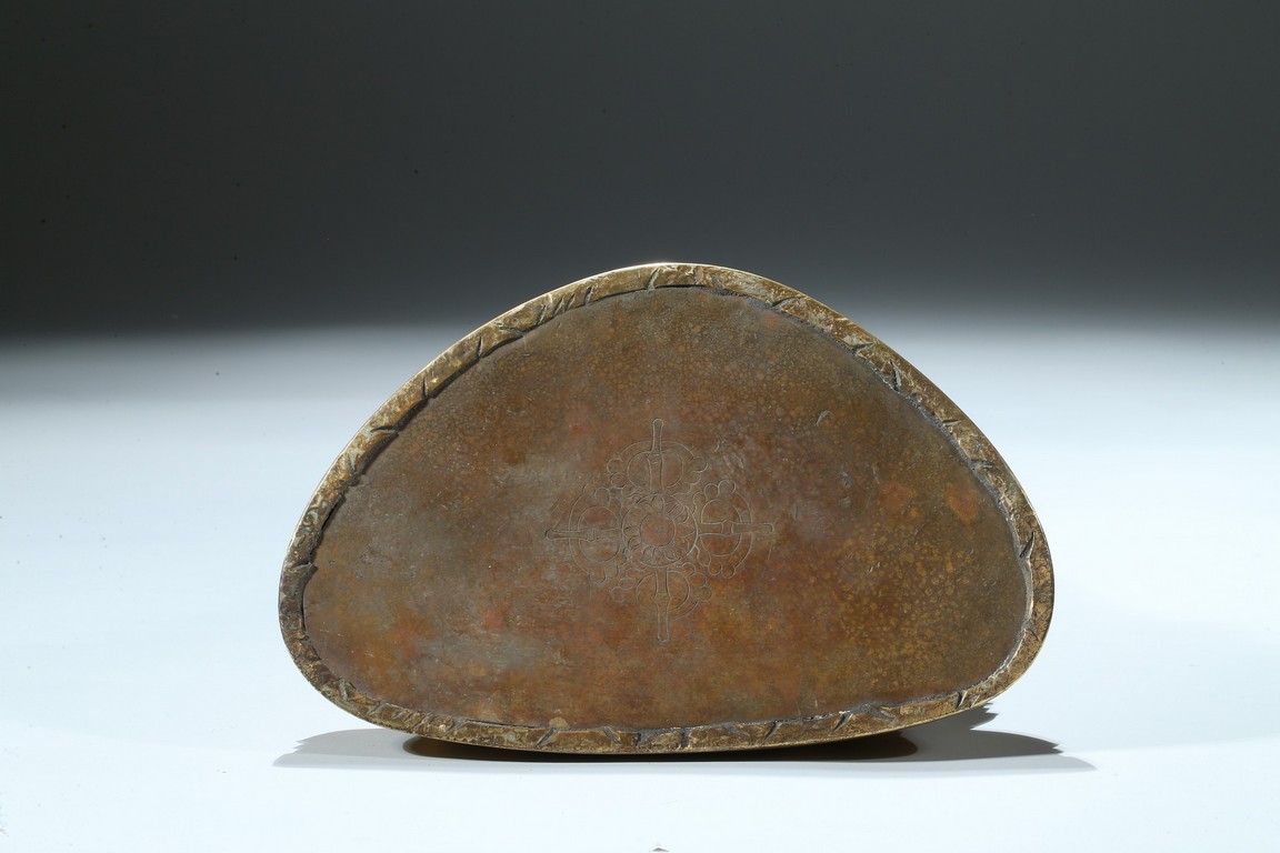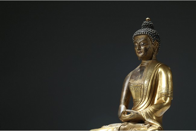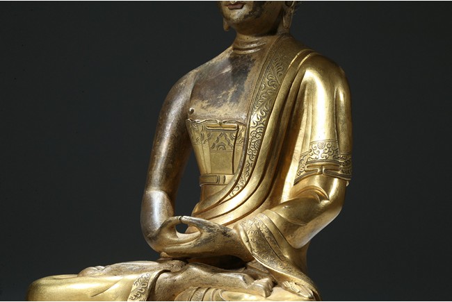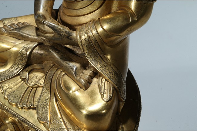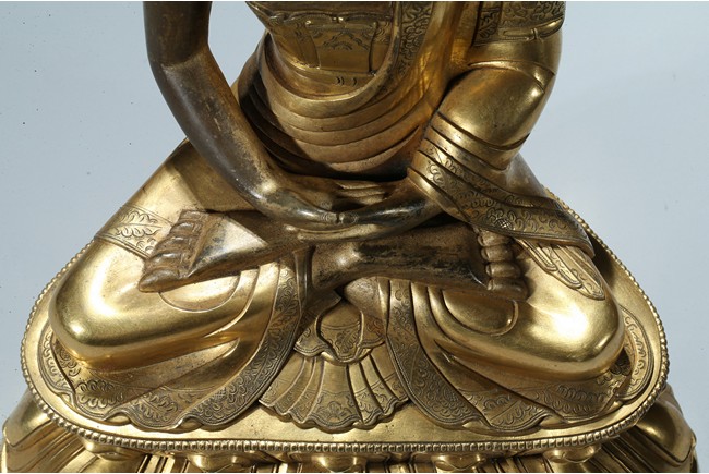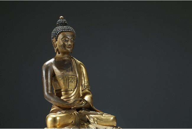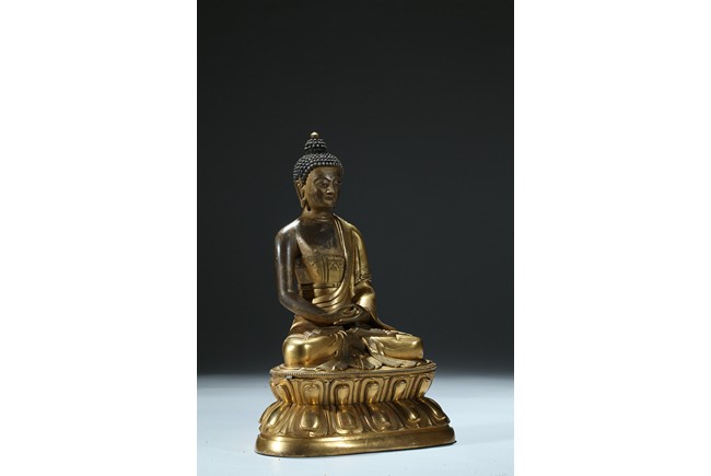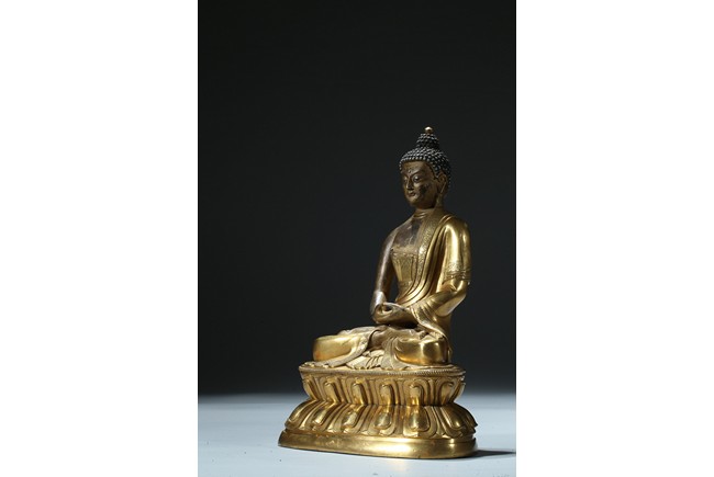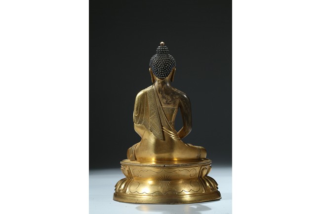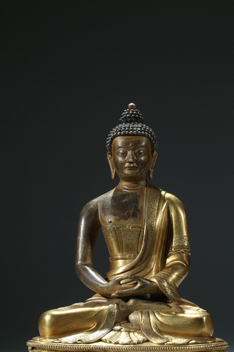 Seated in dhyanasana on a round double-lotus base, his hands resting in dhyana mudra, clad in a robe incised with a floral decoration, with sloping shoulders and a compassionate expression, the hair arranged in tight knots over a pronounced ushnisha, the base sealed and incised with an elaborate double-vajra. 18th century Qing Dynasty period.
