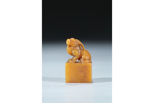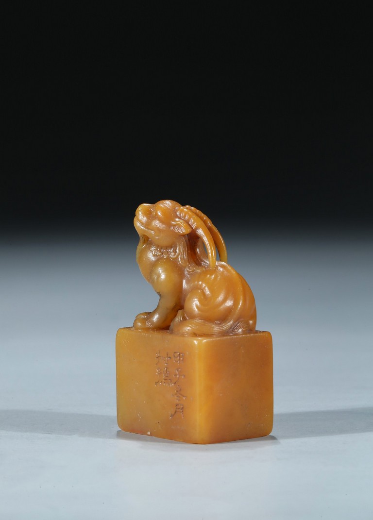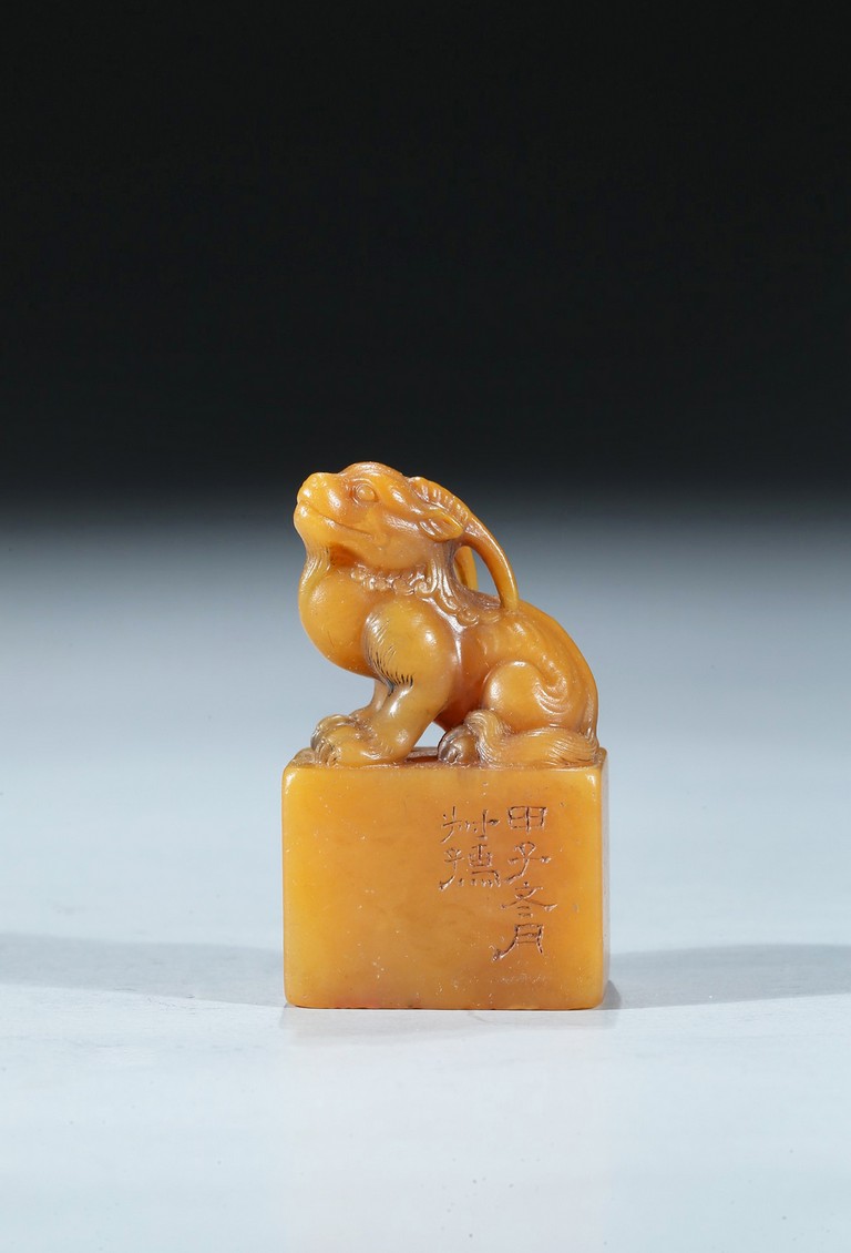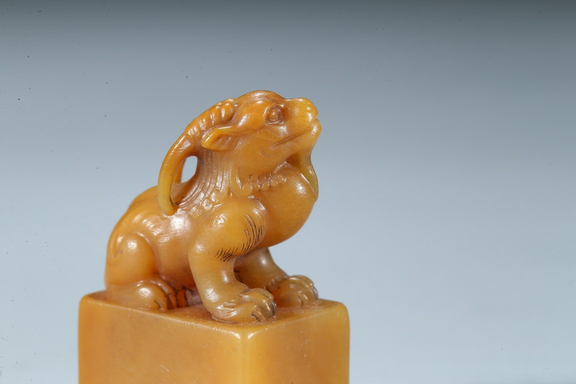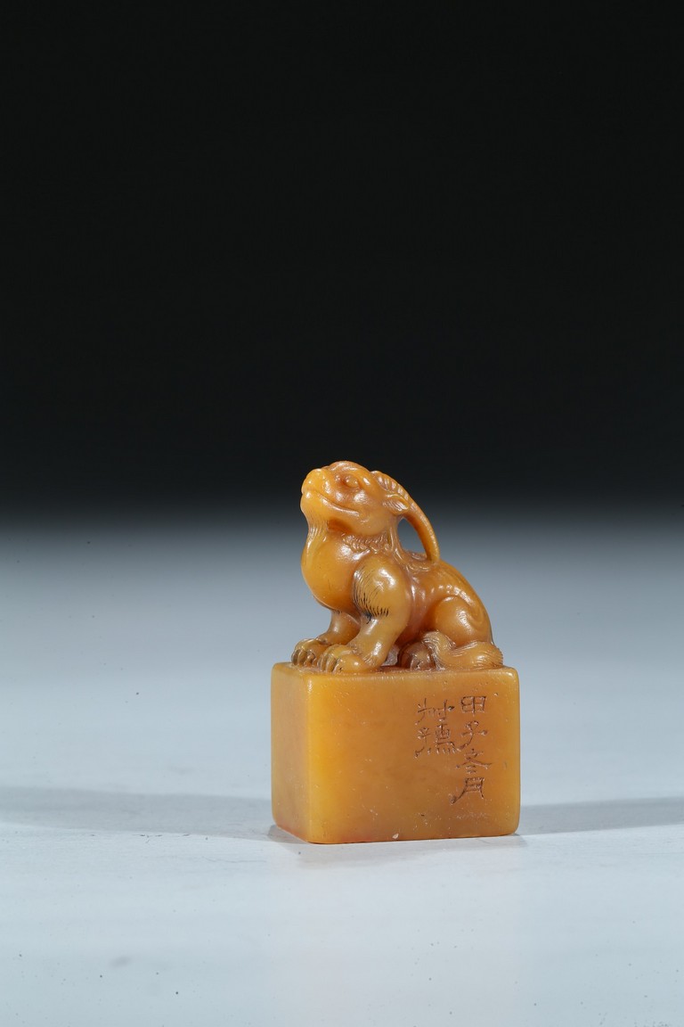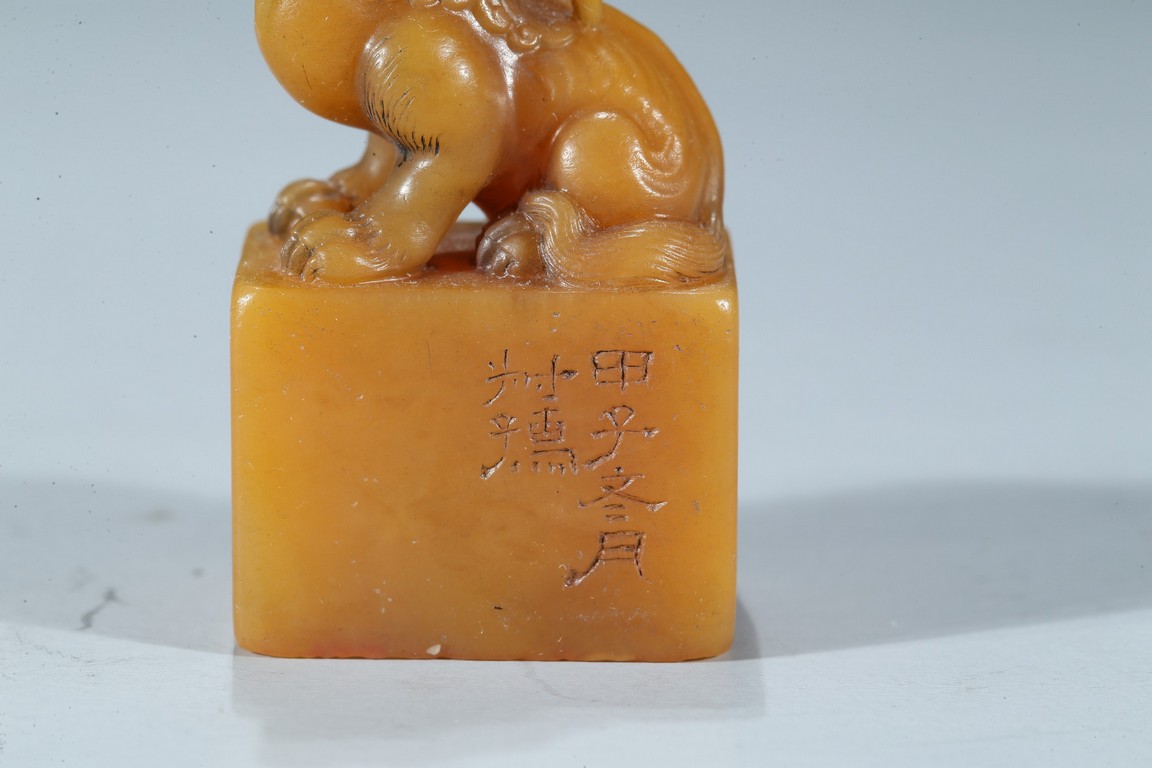The rectangular columnar seal is surmounted by a recumbent mythical beast poised on muscular haunches, highly detailed with incised mane and curved horns, with a signature and date incised on one vertical side. The seal face is carved with a six-character poetic inscription. The stone of an attractive warm golden honey tone. Mid-Qing Dynasty period.