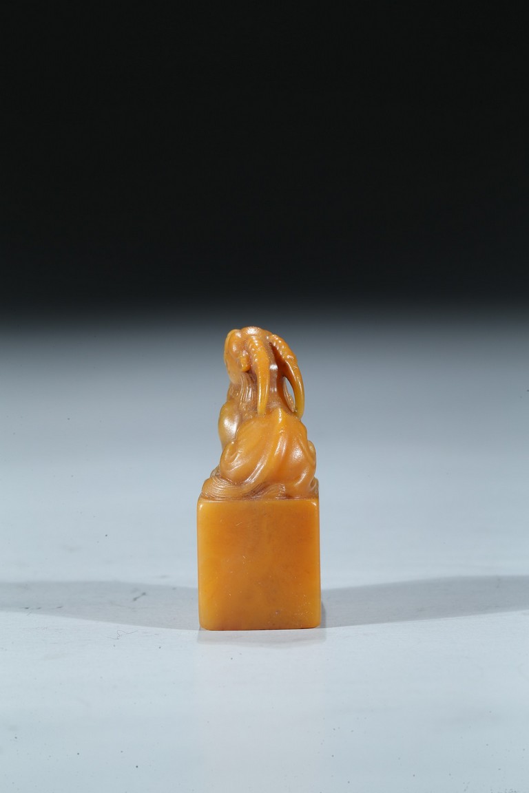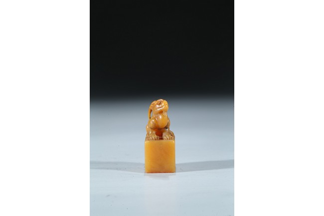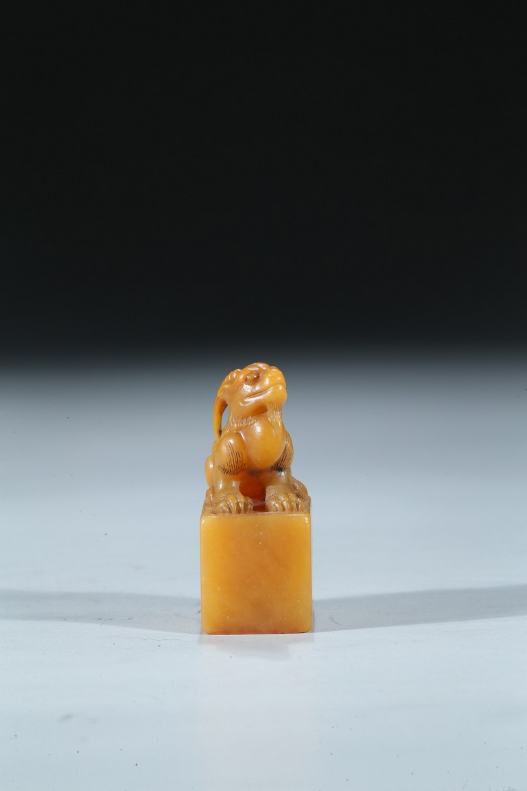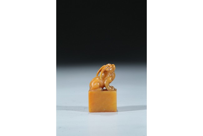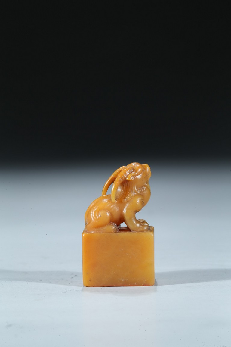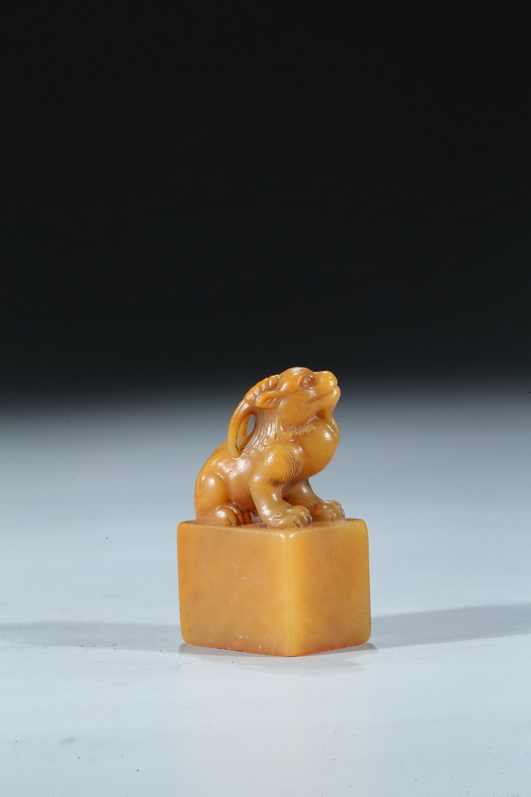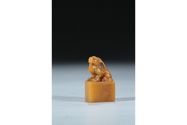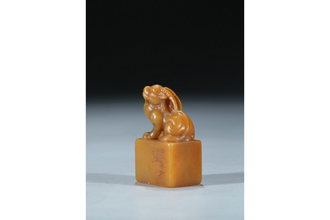 The rectangular columnar seal is surmounted by a recumbent mythical beast poised on muscular haunches, highly detailed with incised mane and curved horns, with a signature and date incised on one vertical side. The seal face is carved with a six-character poetic inscription. The stone of an attractive warm golden honey tone. Mid-Qing Dynasty period.