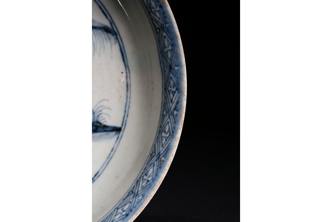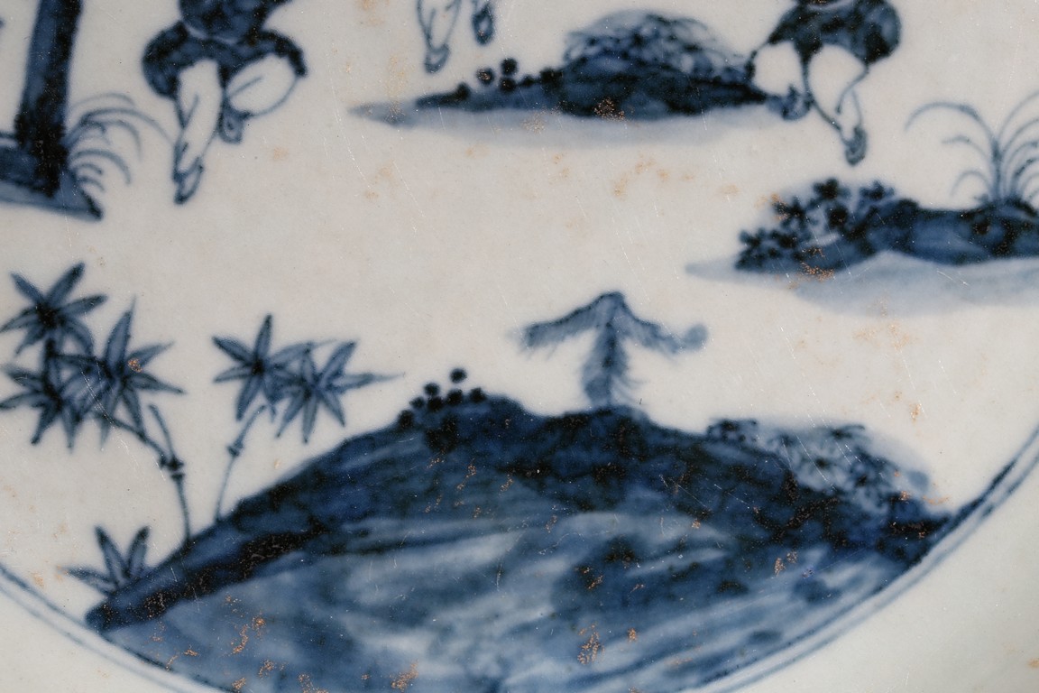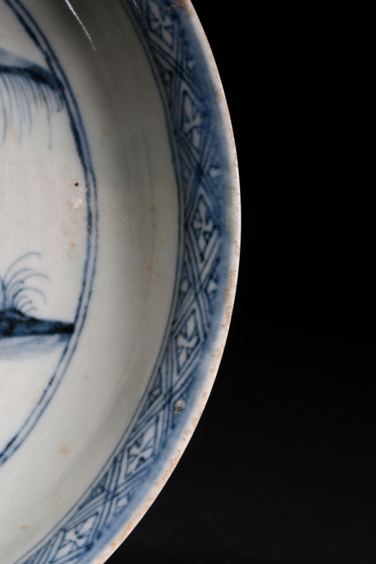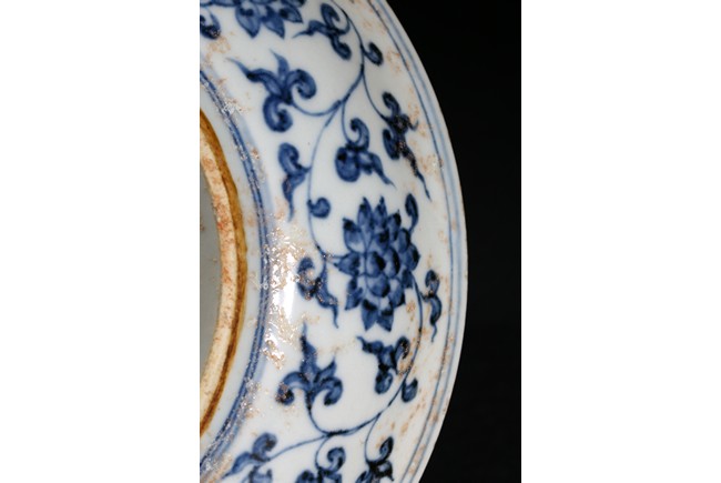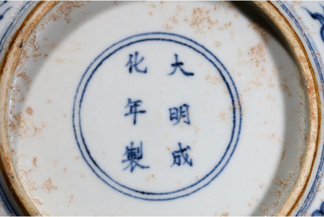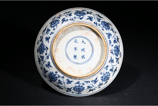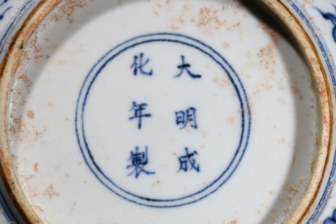 此盤敞口弧腹,下承圈足,造型工整規制,內外壁皆以青花為飾,盤心青花雙圈童子嬰戲圖紋飾,外壁裝飾八朵纏枝蓮紋,碗底青花“大明成化年制”六字楷書款,所繪紋樣俯仰有秩,線條流暢自如。青花呈色藍中帶灰,含蓄幽靜,為産於江西省樂平縣的國產青料,由於這種青料中氧化鐵含量較低,因而形成不同於宣德青花,濃妍似墨、深入胎骨的藝術效果。其胎質細膩純潔,白釉瑩潤如脂,光澤柔和,與國產「平等青」融為最佳結合,堪稱完美。來源:洛杉磯台籍藏家舊藏 Provenance: Private collection, Los Angeles