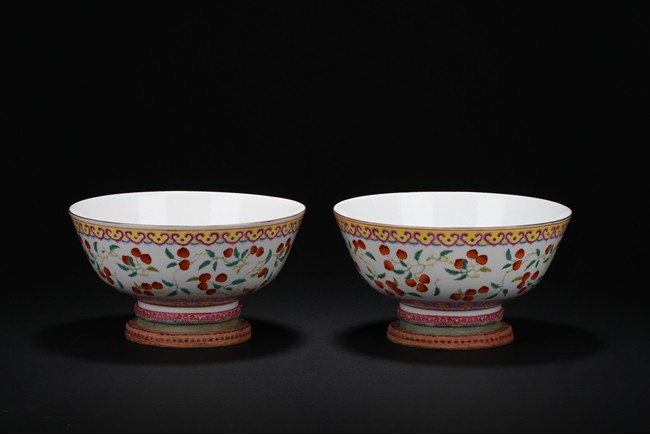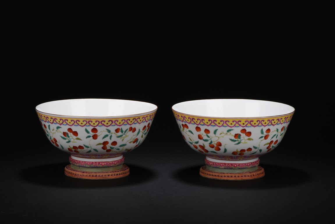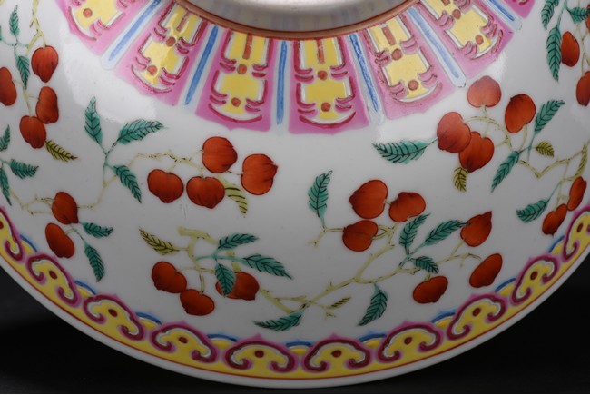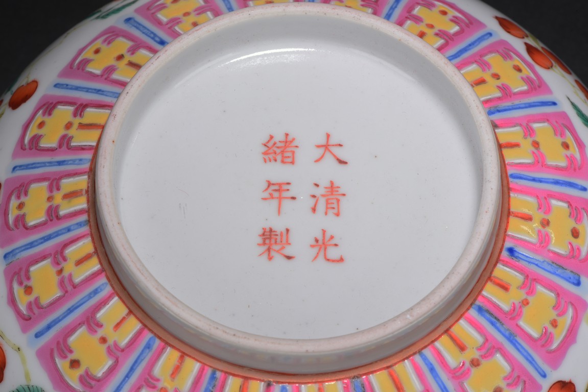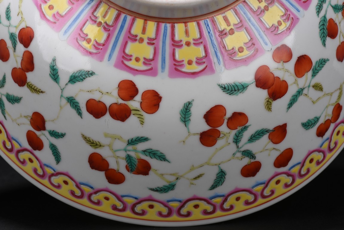 Well potted,the body painted with a continuous scene of leafy peach sprigs,below a ruyi-head lappet bands encircled the mouth rim,the base bears six character 'GUANGXU' mark. Republic period.