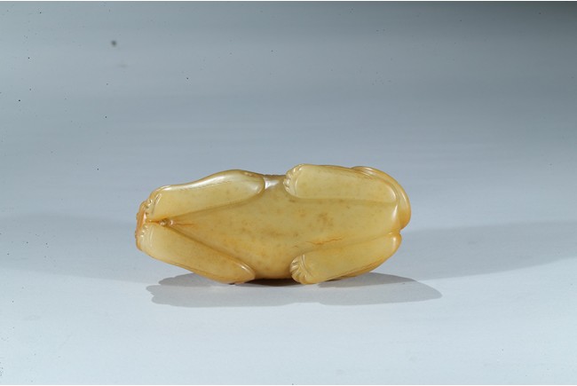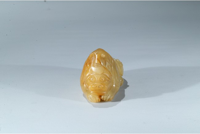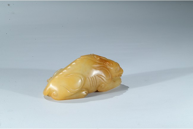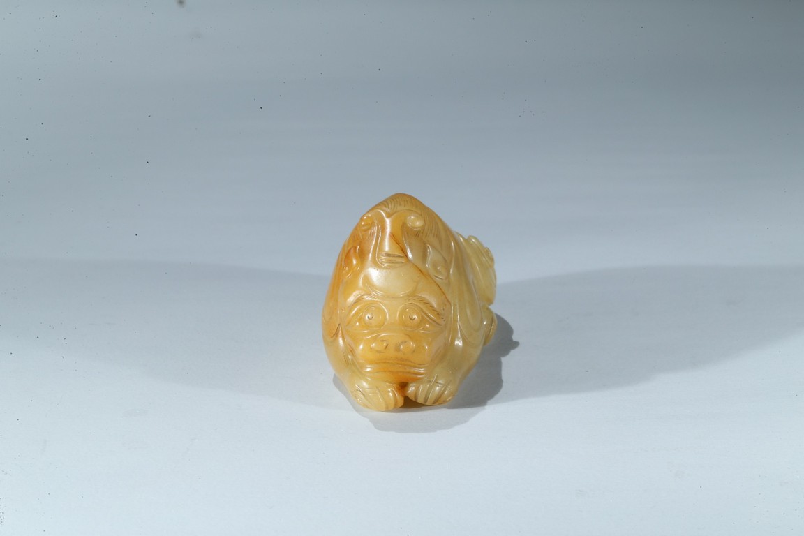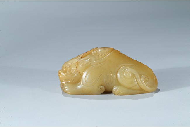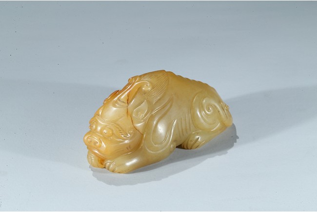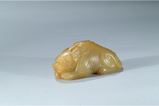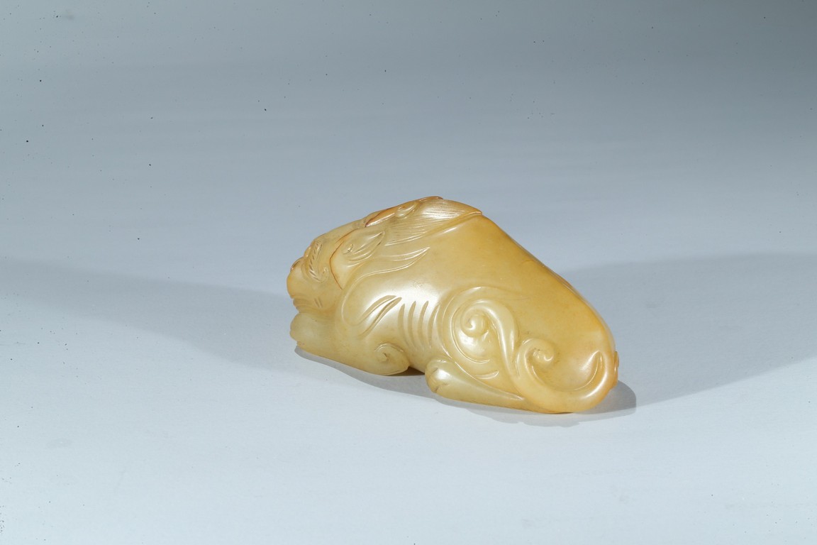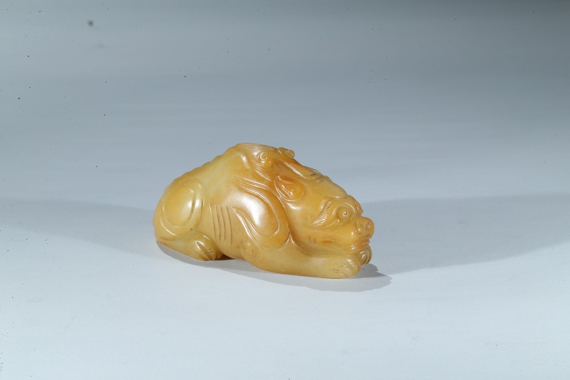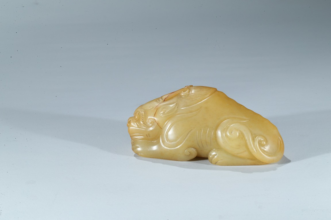 Carved in the form of a recumbent mythical beast with head resting on front paws, the face with bulging rounded eyes and powerful nose, with characteristic one horn, the mane finely detailed with incised lines, tail curled to one side. Qing Dynasty period.