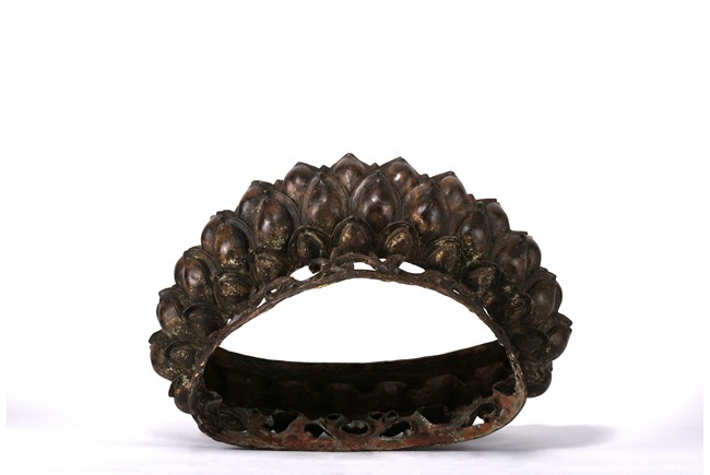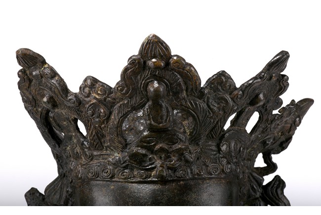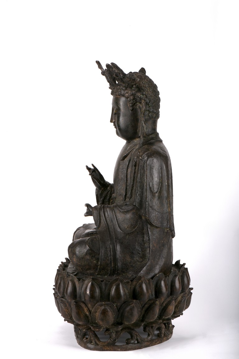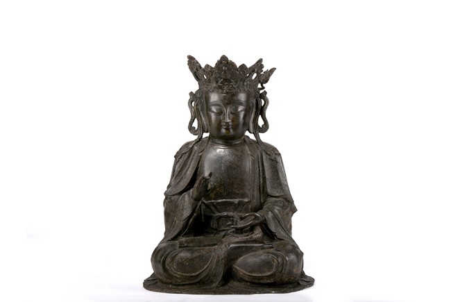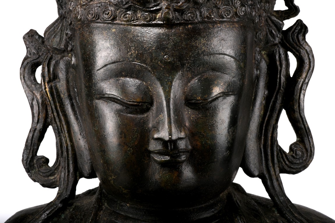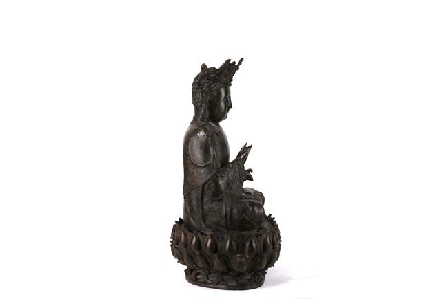 The bodhisattva is shown seated on an double-lotus base with hands in karana mudra. Shown wearing long and loose robe. His face is shown with benevolent expression, flanked by pendulous earlobes and wearing an high tiara enclosing an small figure of Buddha. Ming Dynasty period.