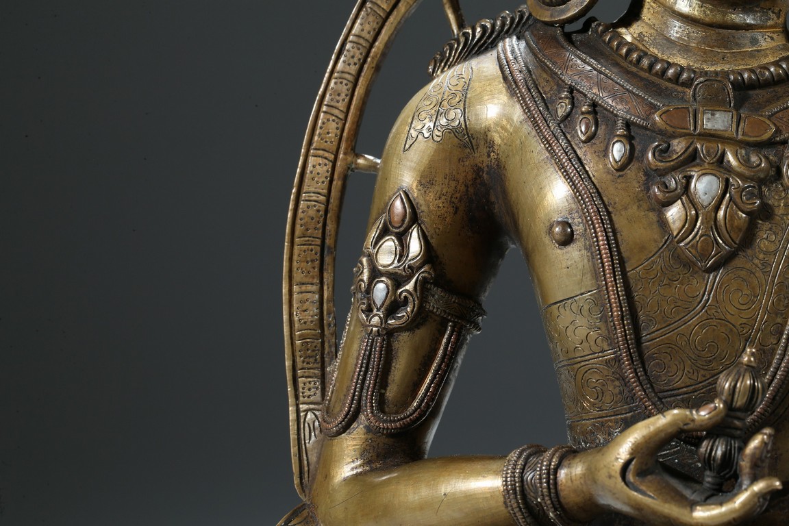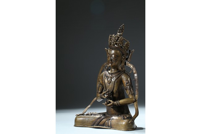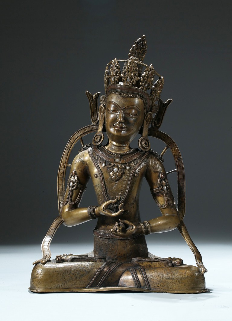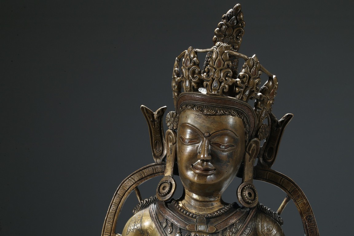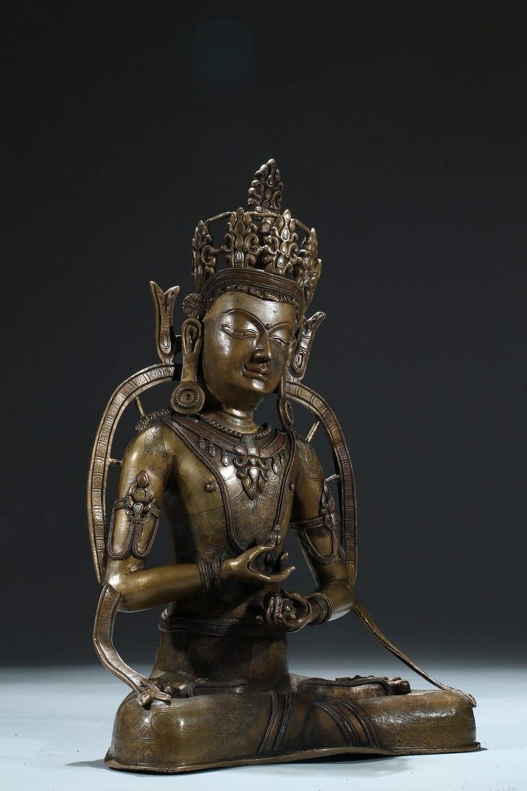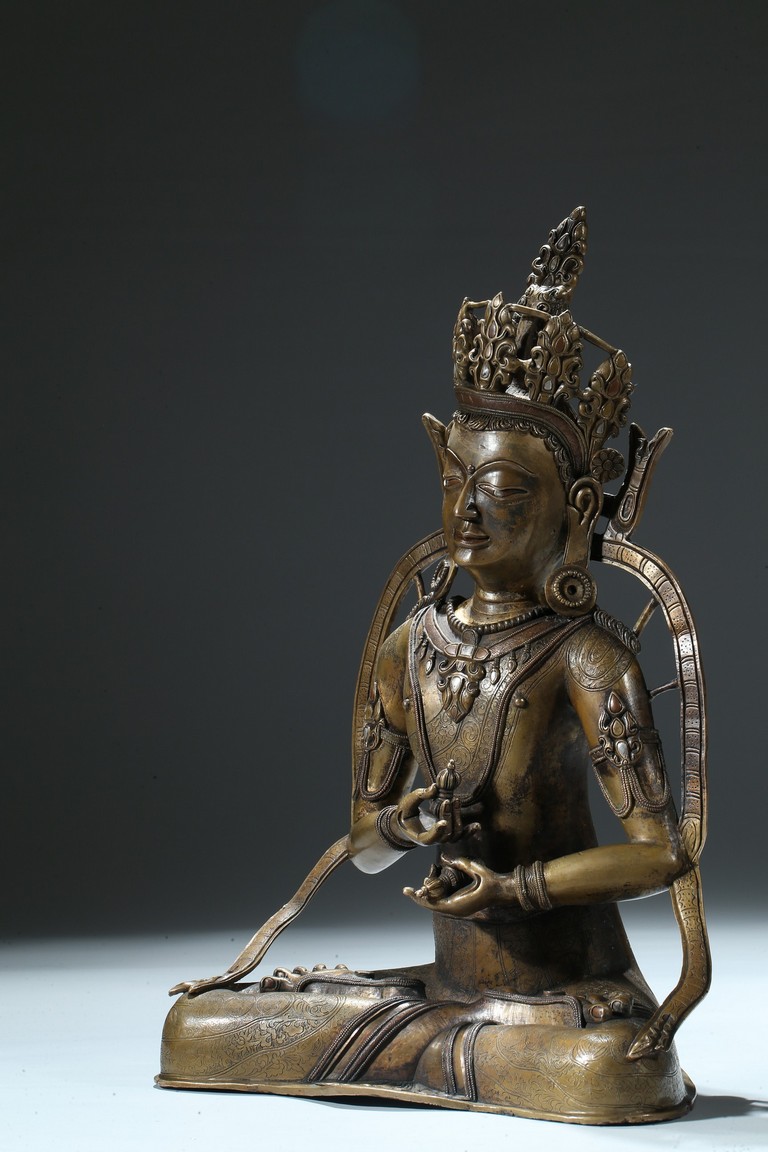 金剛薩埵源自印度,大乘佛教中,金剛薩埵意為“金剛心”或“雷電心”,是密宗佛教儀軌中最重要的法器和象徵——金剛杵的化現,代表著權力與堅不可催的開悟之心。金剛薩埵是本初佛金剛總持的內在形式,然而常以佩戴頭冠並且裝飾華麗的菩薩形象出現在藝術作品中。在尼泊爾地區,金剛薩埵還擁有獨立的神龕。本尊金剛薩埵上身微微左傾,而胯部向右施力,不失平衡而又極盡優雅之姿態。此尊金剛薩埵頭頂髮髻格外高聳,五葉寶冠葉冠間以小銅柱連接,天衣飄帶也以小銅柱與主尊相連,彷彿迎風擺動,增加了整尊造像的動勢。其中間髮冠鑲嵌銀,與合金的光芒相互輝映。長耳垂掛耳飾,穗尾垂落雙肩搖晃,耳邊彷彿傳來清脆的碰撞聲。其眼簾微垂,目光柔和而堅定,雙眉細長直入高鼻,嘴角微升,面容沉靜安詳。其右手持金剛杵於胸前,左手握金剛鈴於腰間,比例協調,動勢婀娜,整體典雅高貴。來源:波士頓藏家多年收藏 家族於1960年代購於法國 Provenance: Private collection, Boston, acquired in France in 1960s.