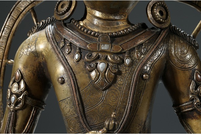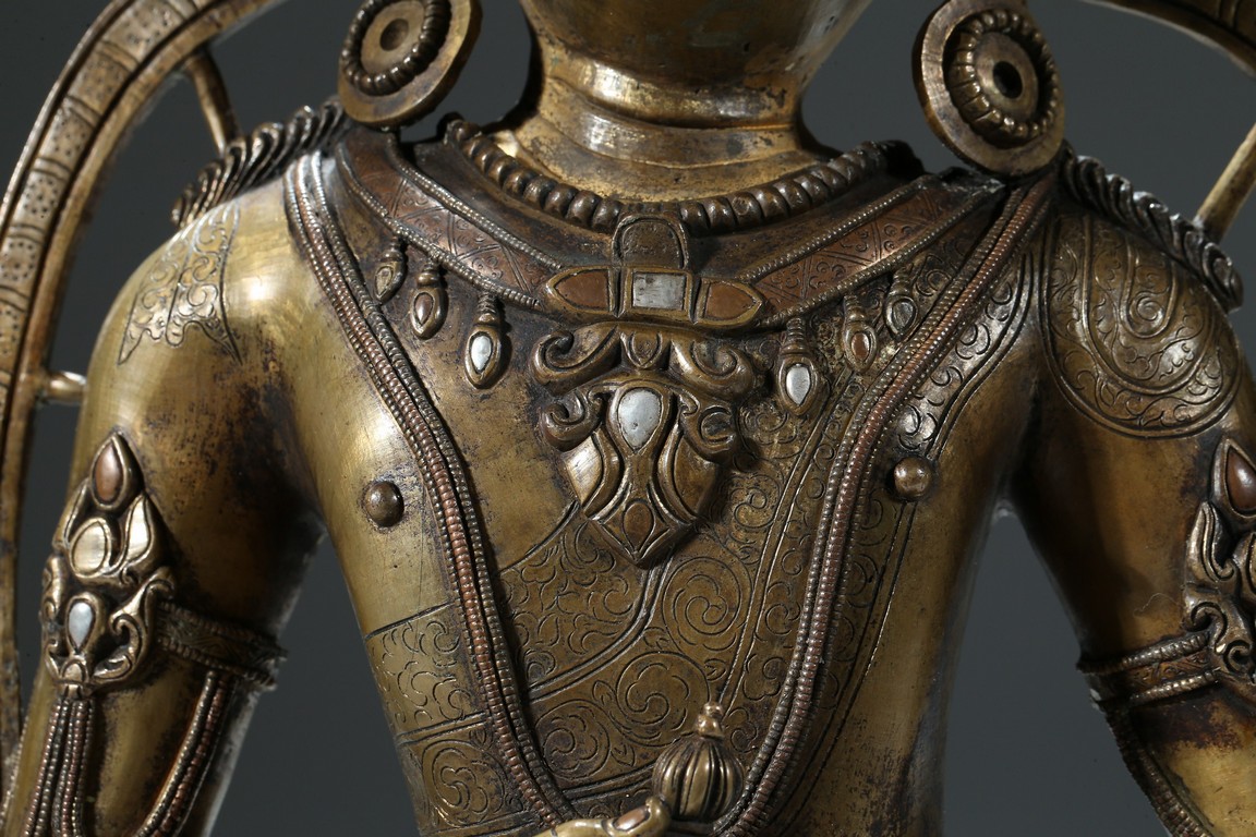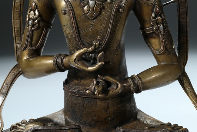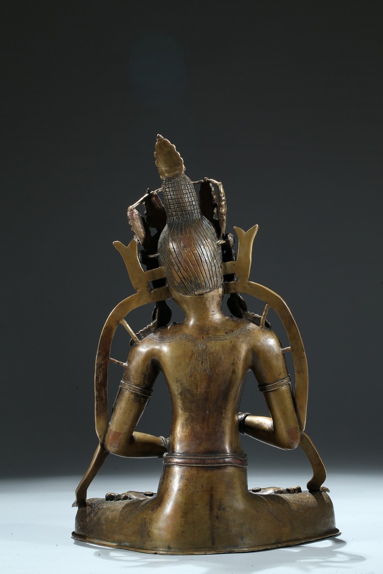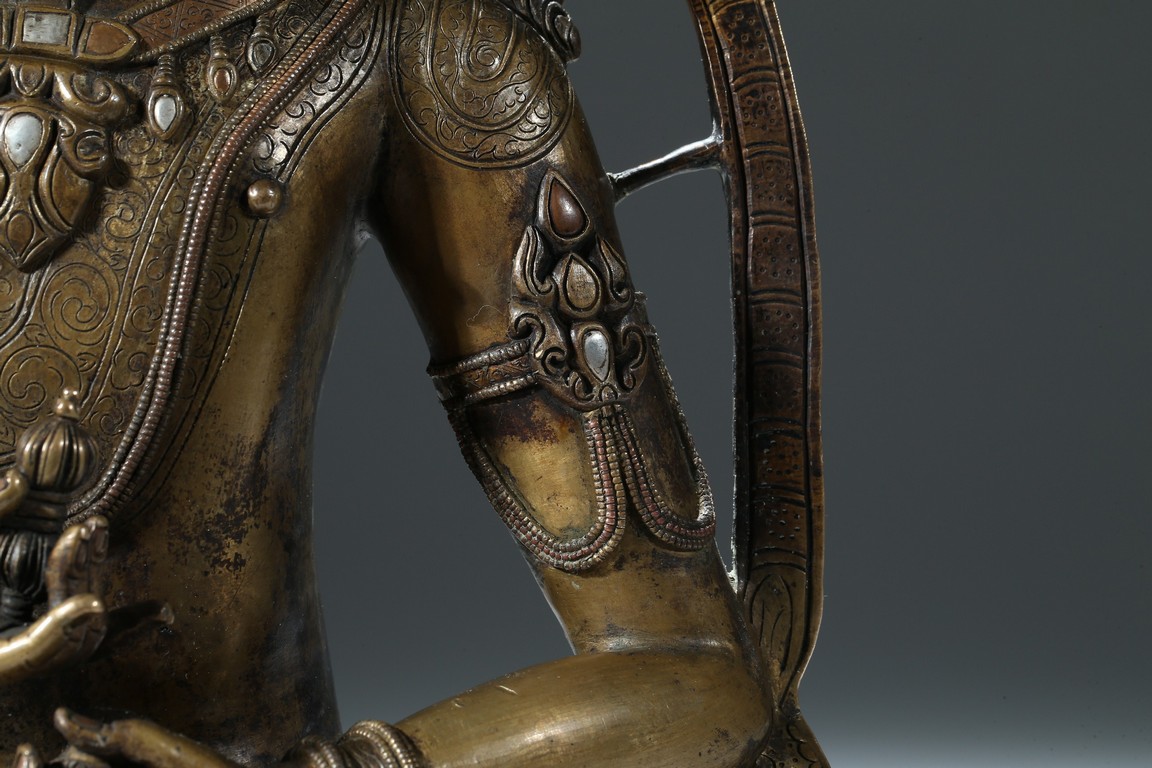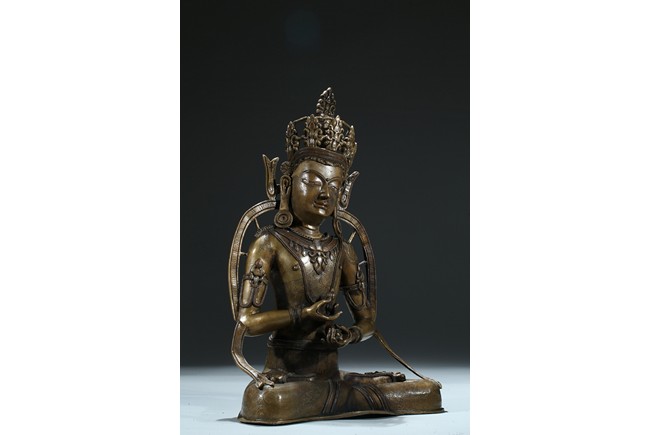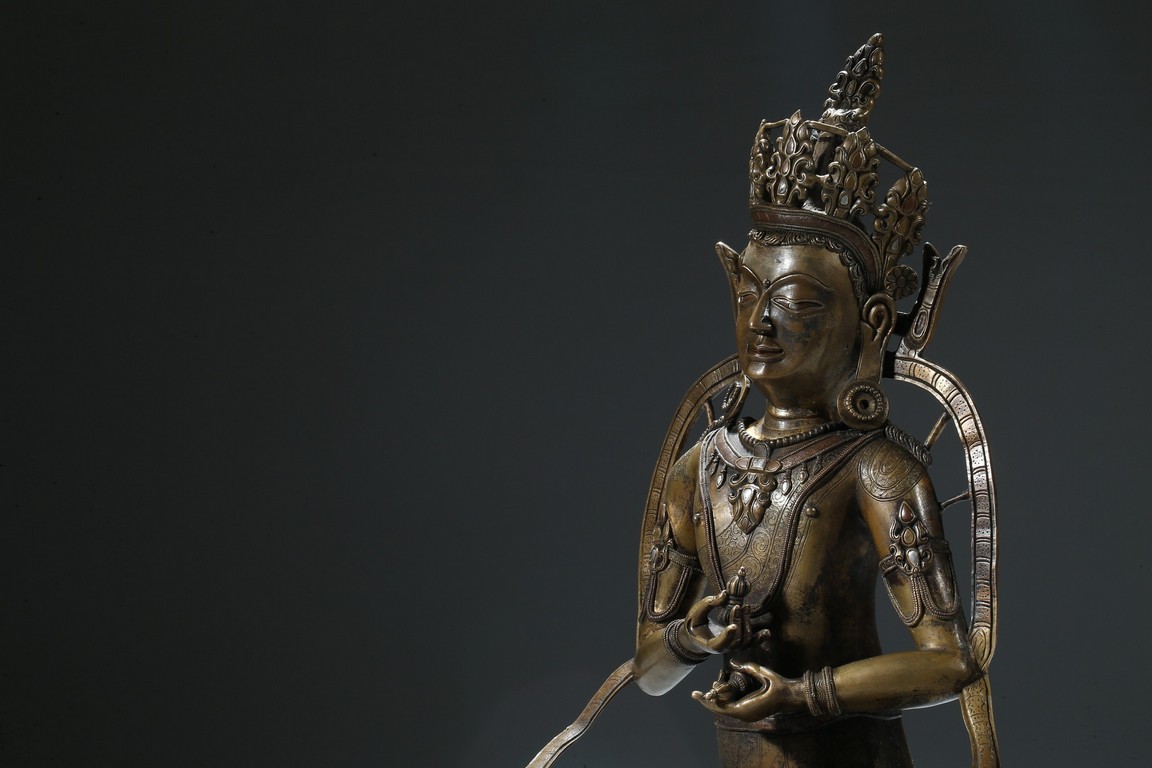 金剛薩埵源自印度,大乘佛教中,金剛薩埵意為“金剛心”或“雷電心”,是密宗佛教儀軌中最重要的法器和象徵——金剛杵的化現,代表著權力與堅不可催的開悟之心。金剛薩埵是本初佛金剛總持的內在形式,然而常以佩戴頭冠並且裝飾華麗的菩薩形象出現在藝術作品中。在尼泊爾地區,金剛薩埵還擁有獨立的神龕。本尊金剛薩埵上身微微左傾,而胯部向右施力,不失平衡而又極盡優雅之姿態。此尊金剛薩埵頭頂髮髻格外高聳,五葉寶冠葉冠間以小銅柱連接,天衣飄帶也以小銅柱與主尊相連,彷彿迎風擺動,增加了整尊造像的動勢。其中間髮冠鑲嵌銀,與合金的光芒相互輝映。長耳垂掛耳飾,穗尾垂落雙肩搖晃,耳邊彷彿傳來清脆的碰撞聲。其眼簾微垂,目光柔和而堅定,雙眉細長直入高鼻,嘴角微升,面容沉靜安詳。其右手持金剛杵於胸前,左手握金剛鈴於腰間,比例協調,動勢婀娜,整體典雅高貴。來源:波士頓藏家多年收藏 家族於1960年代購於法國 Provenance: Private collection, Boston, acquired in France in 1960s.