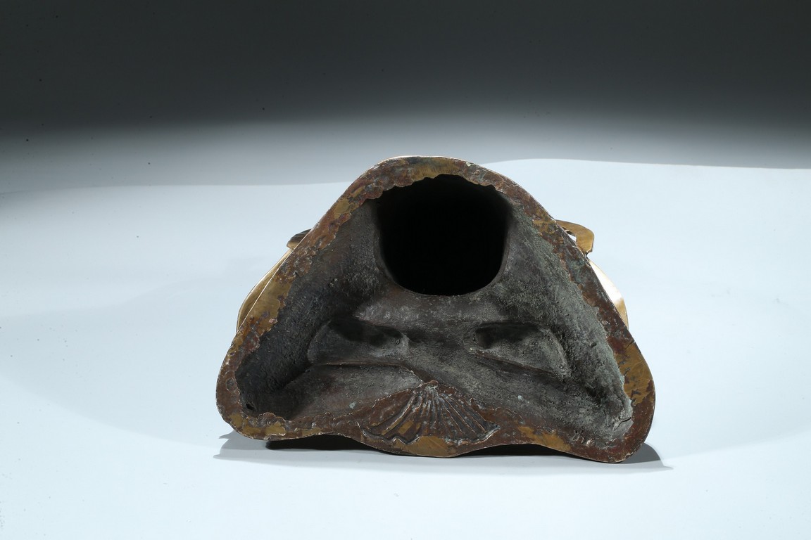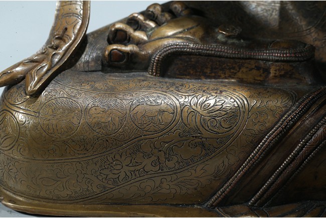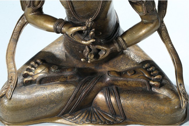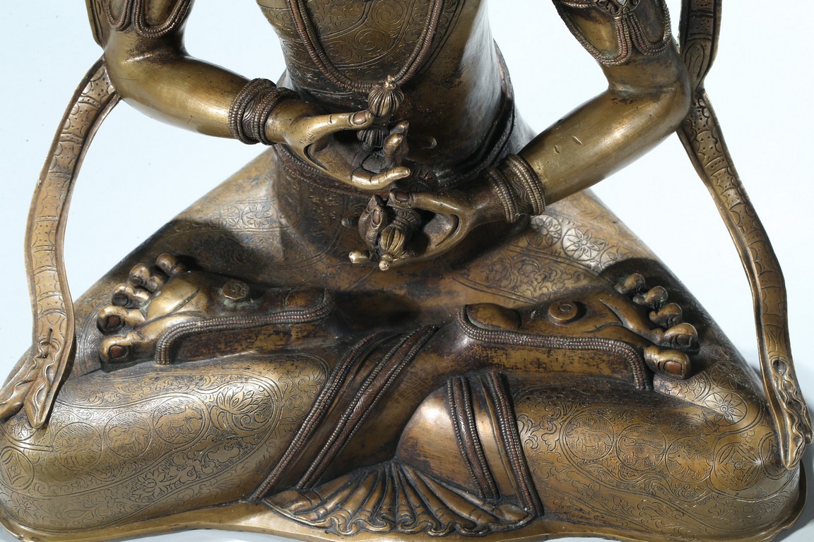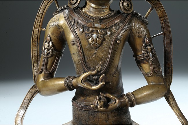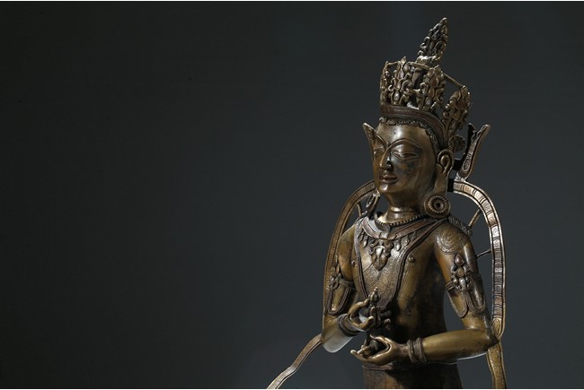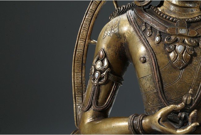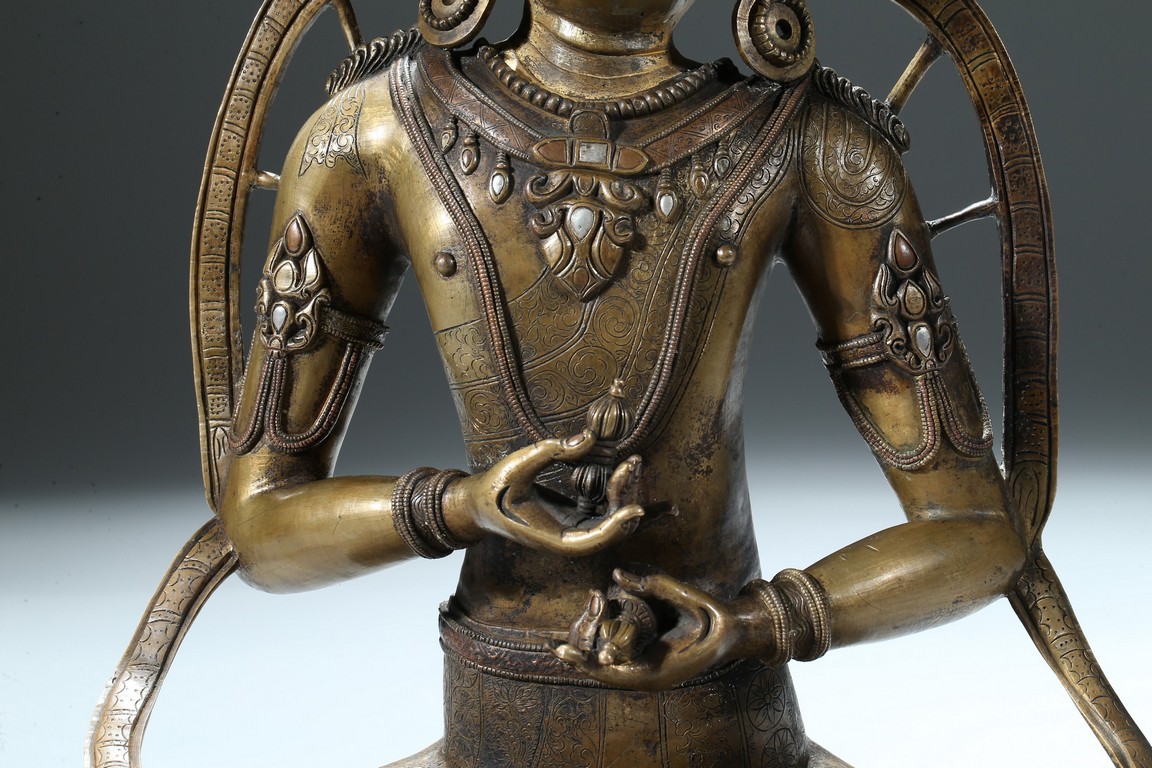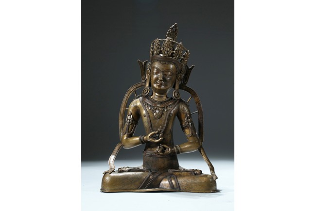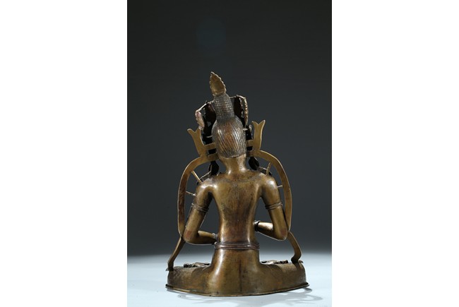 金剛薩埵源自印度,大乘佛教中,金剛薩埵意為“金剛心”或“雷電心”,是密宗佛教儀軌中最重要的法器和象徵——金剛杵的化現,代表著權力與堅不可催的開悟之心。金剛薩埵是本初佛金剛總持的內在形式,然而常以佩戴頭冠並且裝飾華麗的菩薩形象出現在藝術作品中。在尼泊爾地區,金剛薩埵還擁有獨立的神龕。本尊金剛薩埵上身微微左傾,而胯部向右施力,不失平衡而又極盡優雅之姿態。此尊金剛薩埵頭頂髮髻格外高聳,五葉寶冠葉冠間以小銅柱連接,天衣飄帶也以小銅柱與主尊相連,彷彿迎風擺動,增加了整尊造像的動勢。其中間髮冠鑲嵌銀,與合金的光芒相互輝映。長耳垂掛耳飾,穗尾垂落雙肩搖晃,耳邊彷彿傳來清脆的碰撞聲。其眼簾微垂,目光柔和而堅定,雙眉細長直入高鼻,嘴角微升,面容沉靜安詳。其右手持金剛杵於胸前,左手握金剛鈴於腰間,比例協調,動勢婀娜,整體典雅高貴。來源:波士頓藏家多年收藏 家族於1960年代購於法國 Provenance: Private collection, Boston, acquired in France in 1960s.