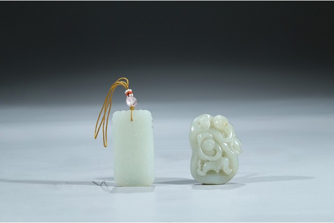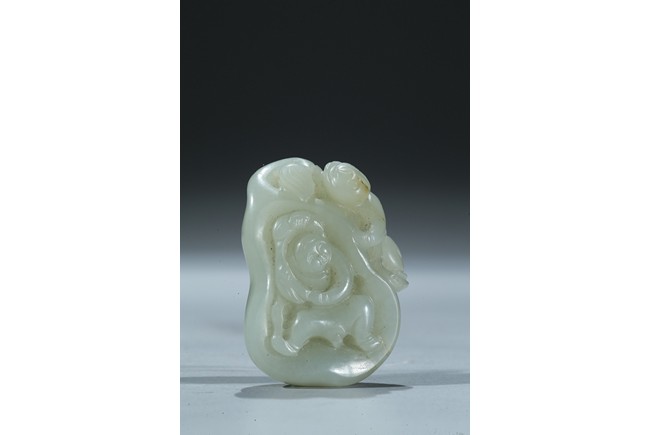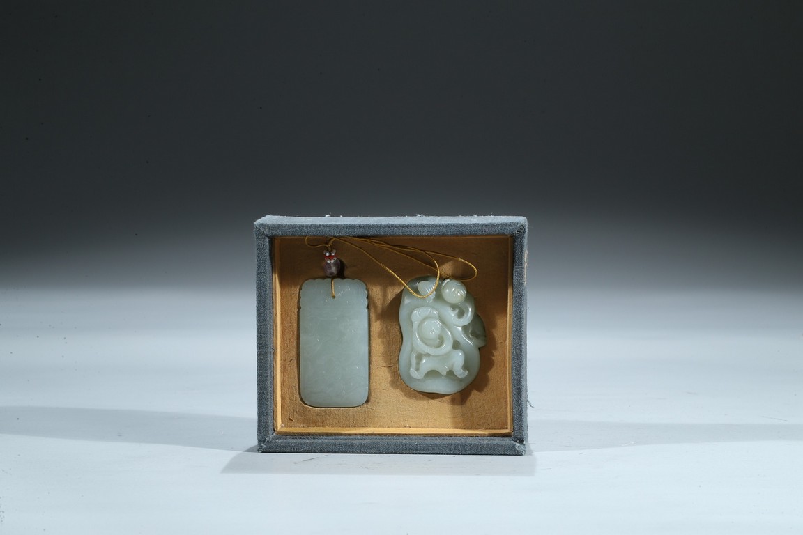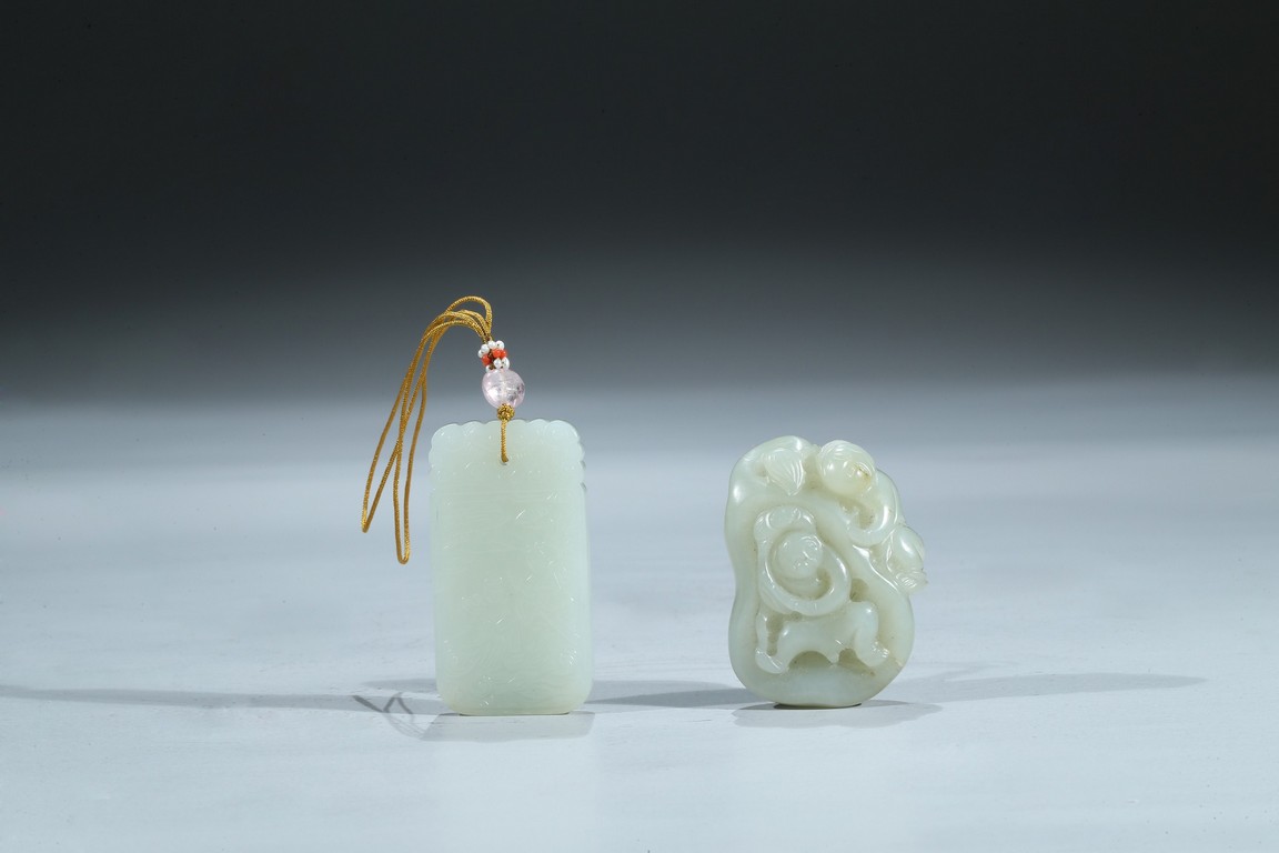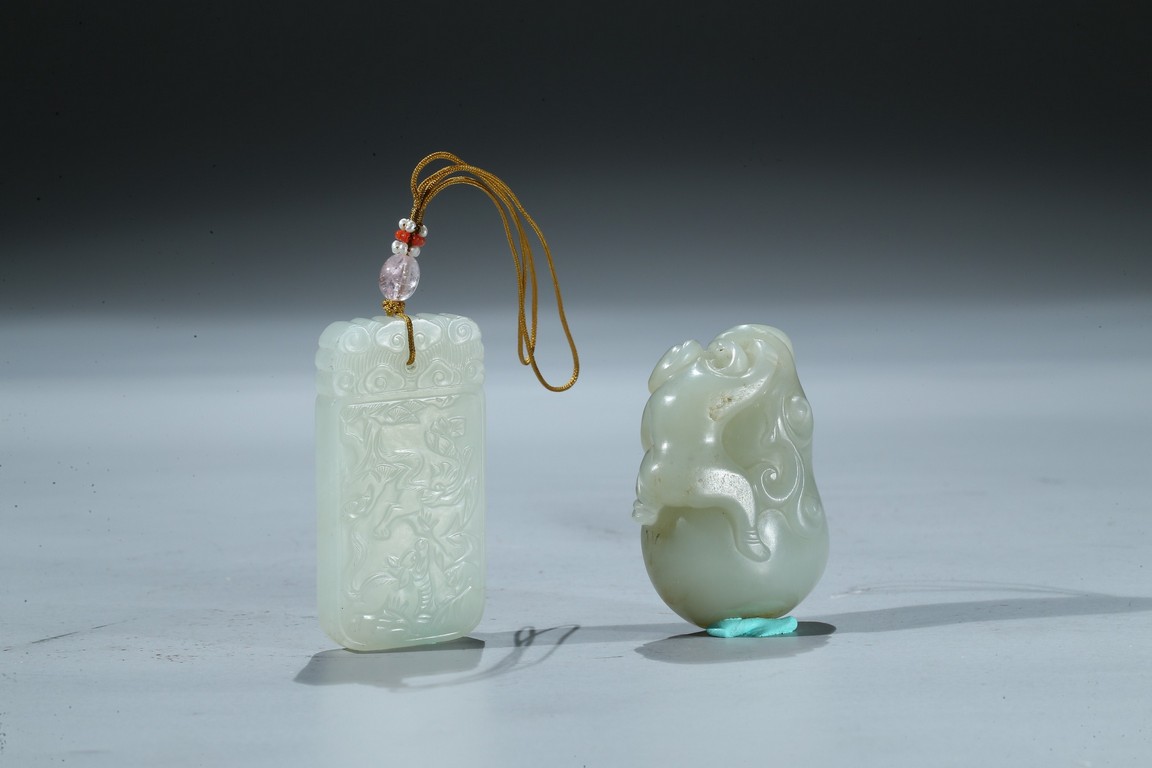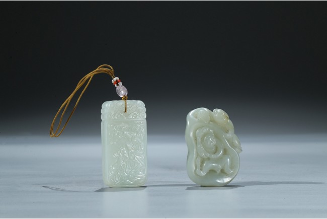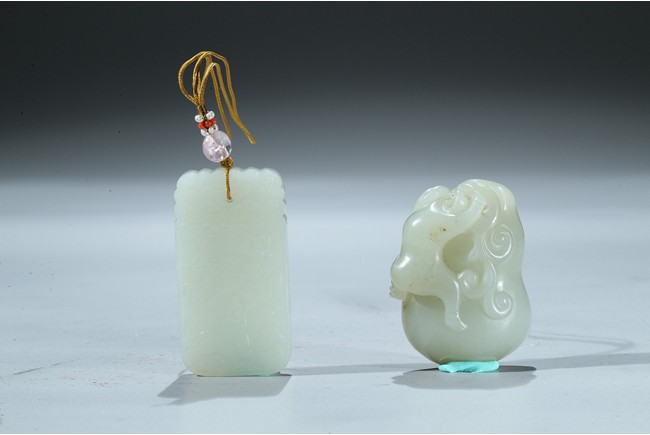 Including a rectangular plaque finely carved to depict two mythical beasts on one side and two immortals on the other side; and a jade figural group of two boys playing on a tree. Qing Dynasty period.