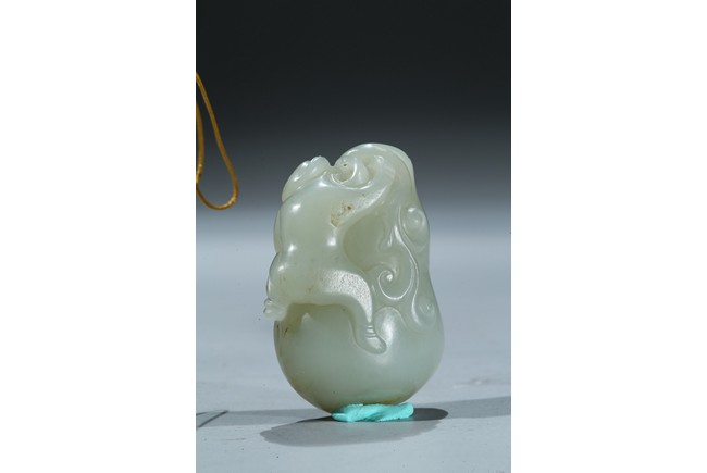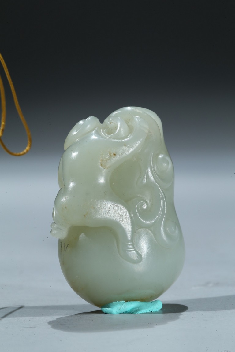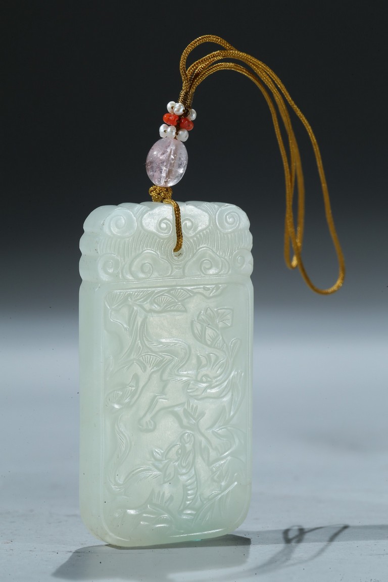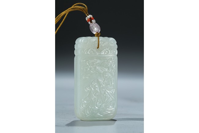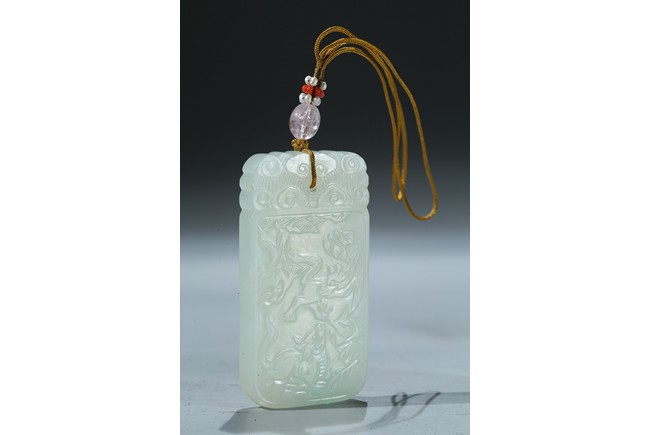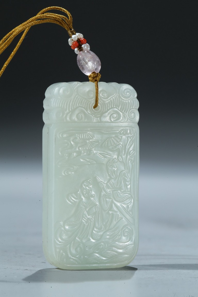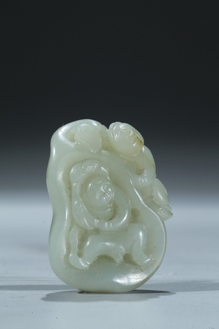 Including a rectangular plaque finely carved to depict two mythical beasts on one side and two immortals on the other side; and a jade figural group of two boys playing on a tree. Qing Dynasty period.