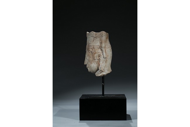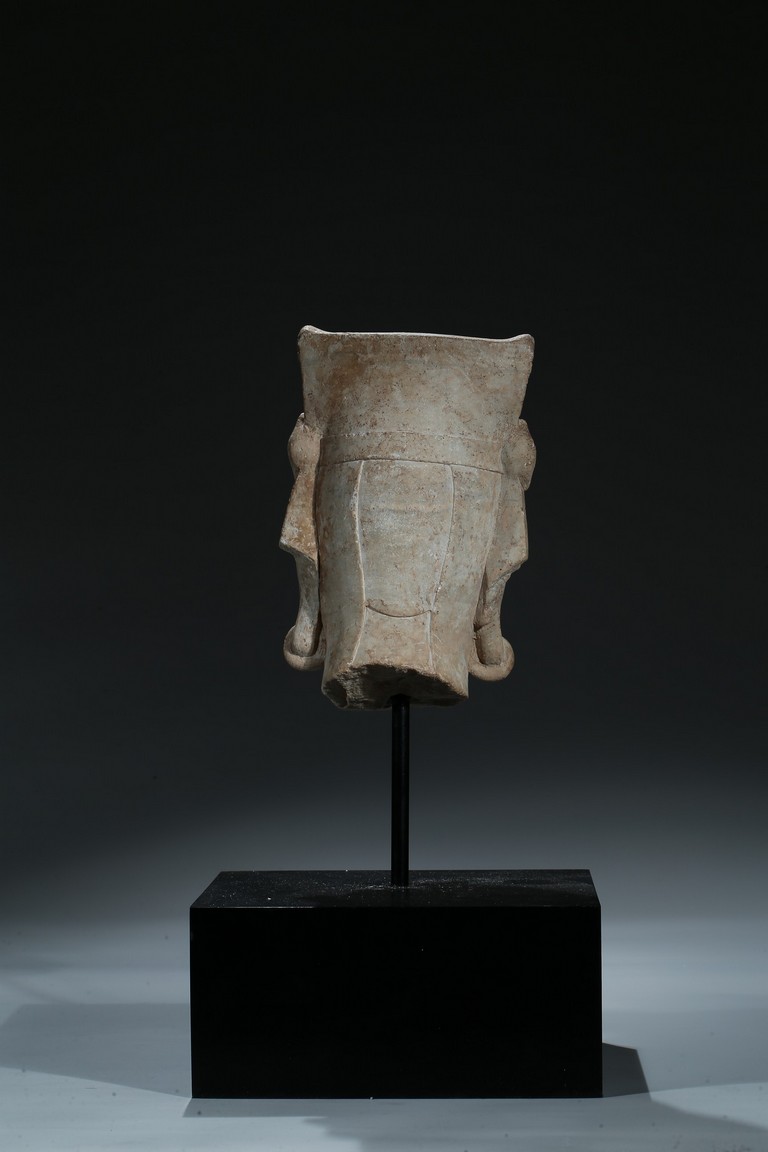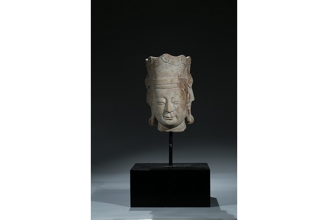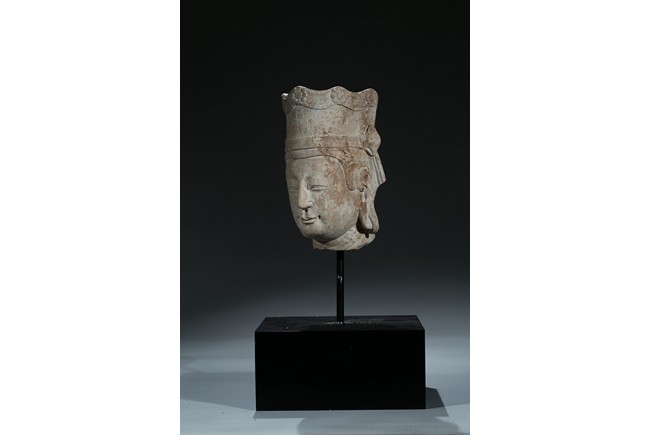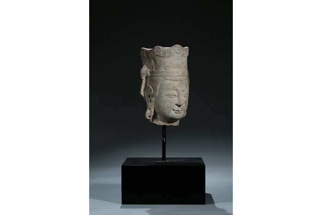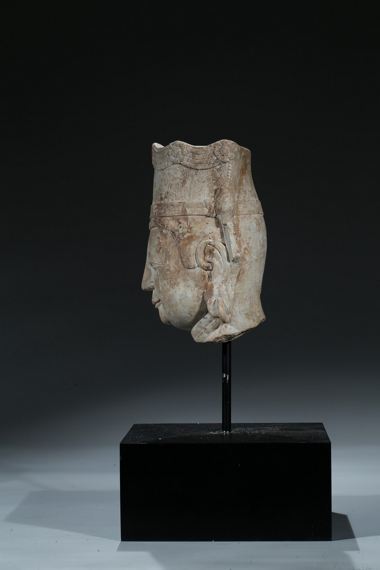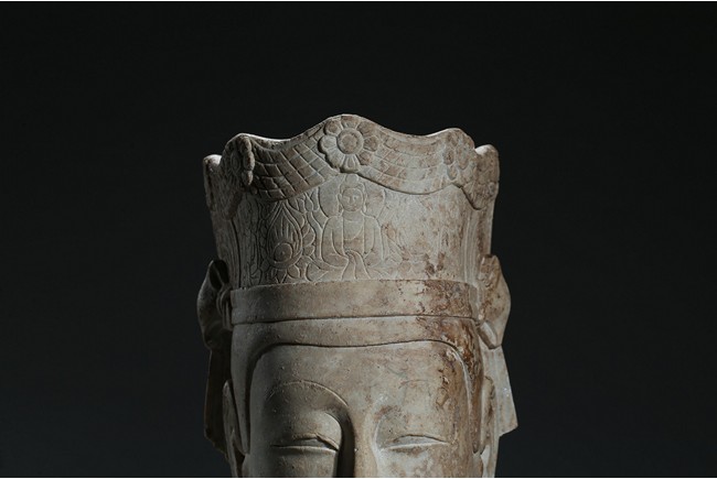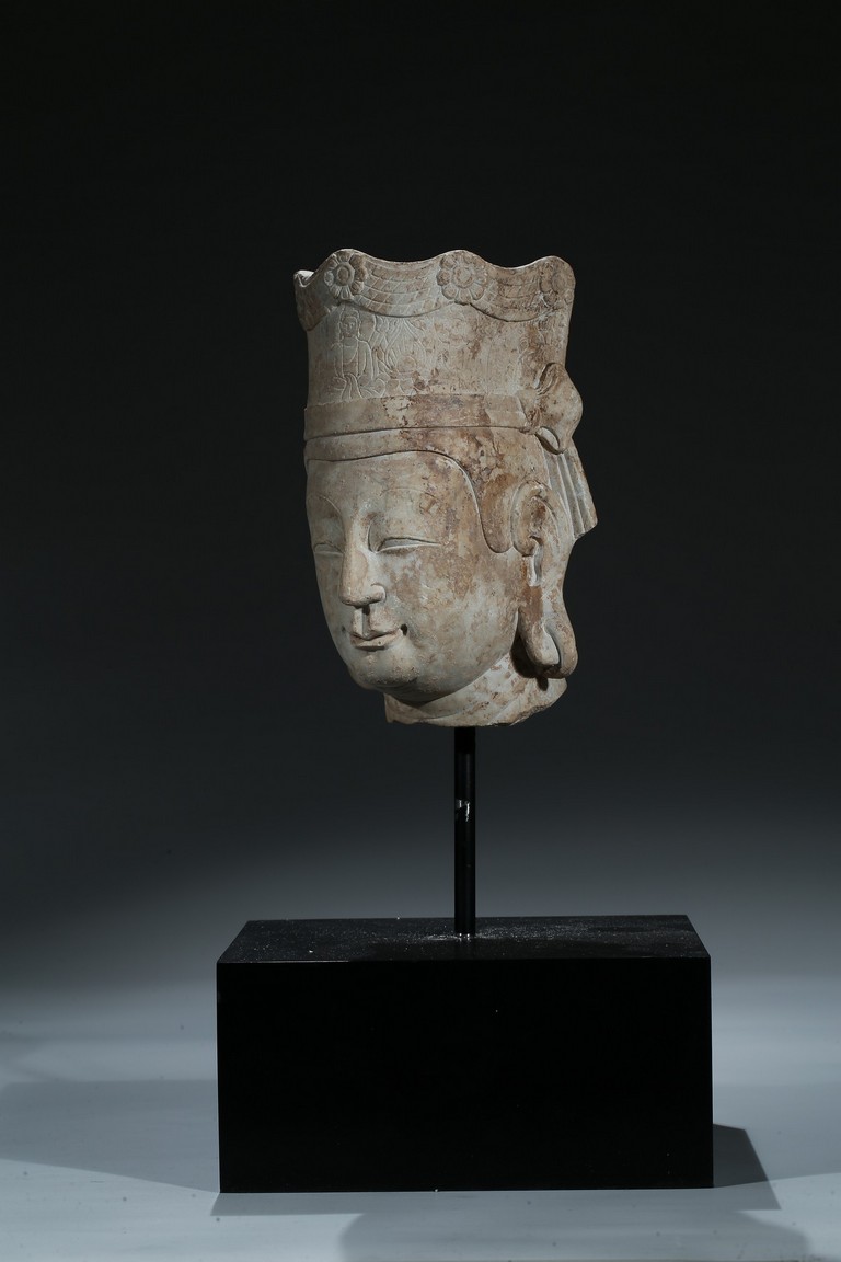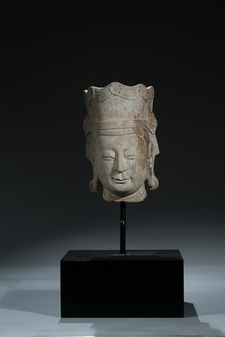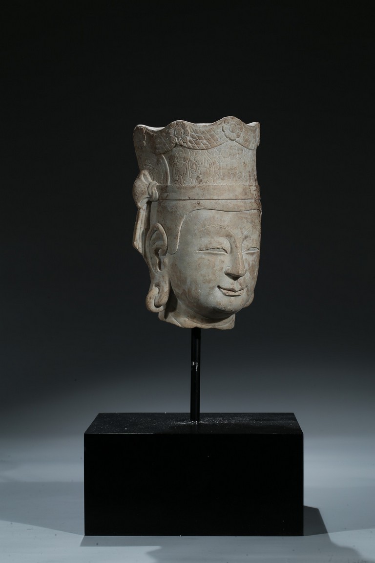 With crescent down-cast eyes in serene contemplation, framed by the high arched brows, tapering nose and the pursed full lips, and long pendulous earlobes, wearing a crown incised with a bodhisattva to the center flanked by lotus flower. Northern Wei Dynasty period.