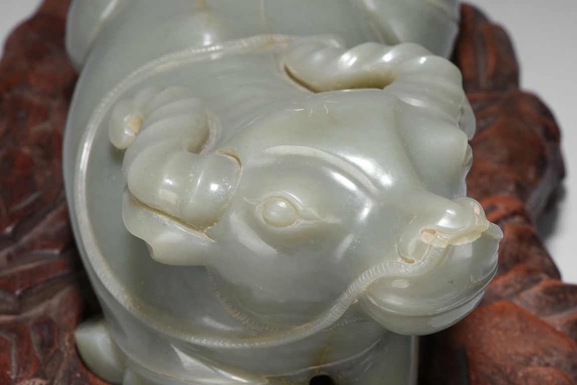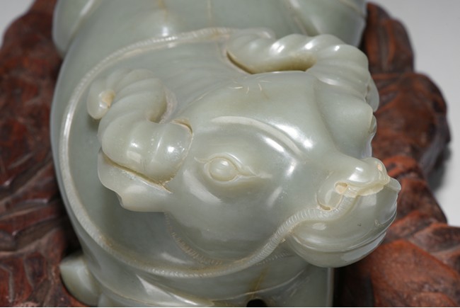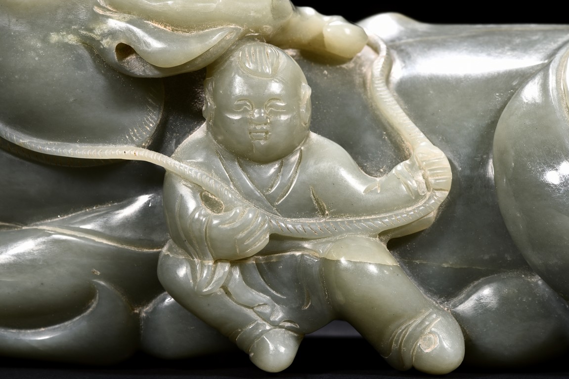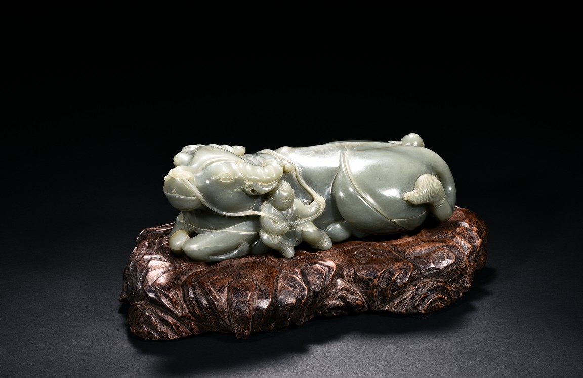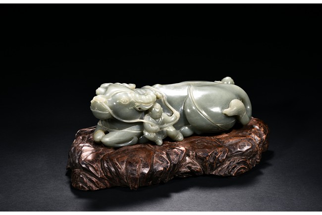 The recumbent buffalo is carved with four feet tucked underneath body,the head slightly raised and tail swept to the left,with a boy sitting beside holding a rope tied through its nostril and over its back,and the other side with a boy holding a large lingzhi. The stone is of even celadon tone with minor russet veins. Accompanied with hardwood carved base imitating the rocky ground. Qing Dynasty period.