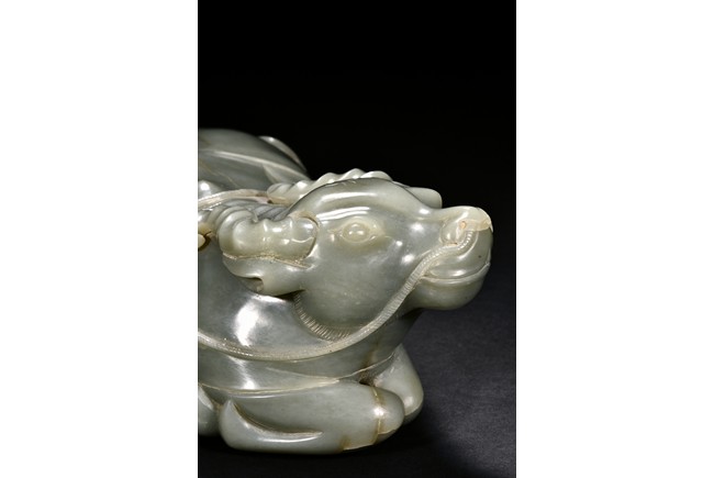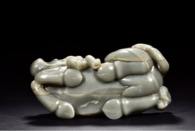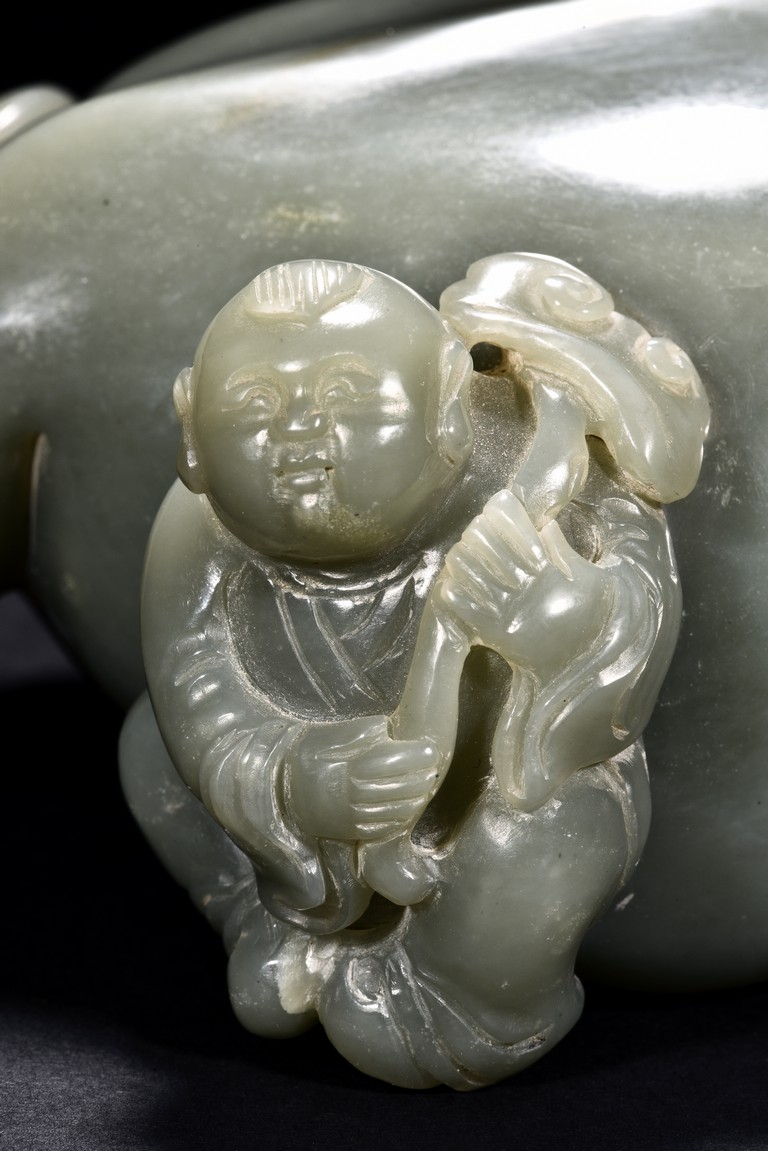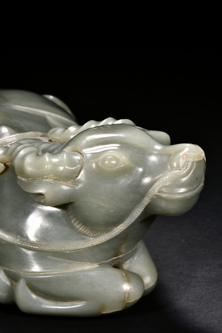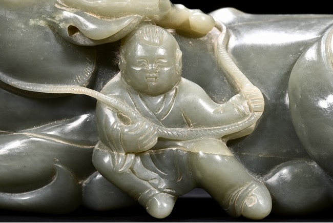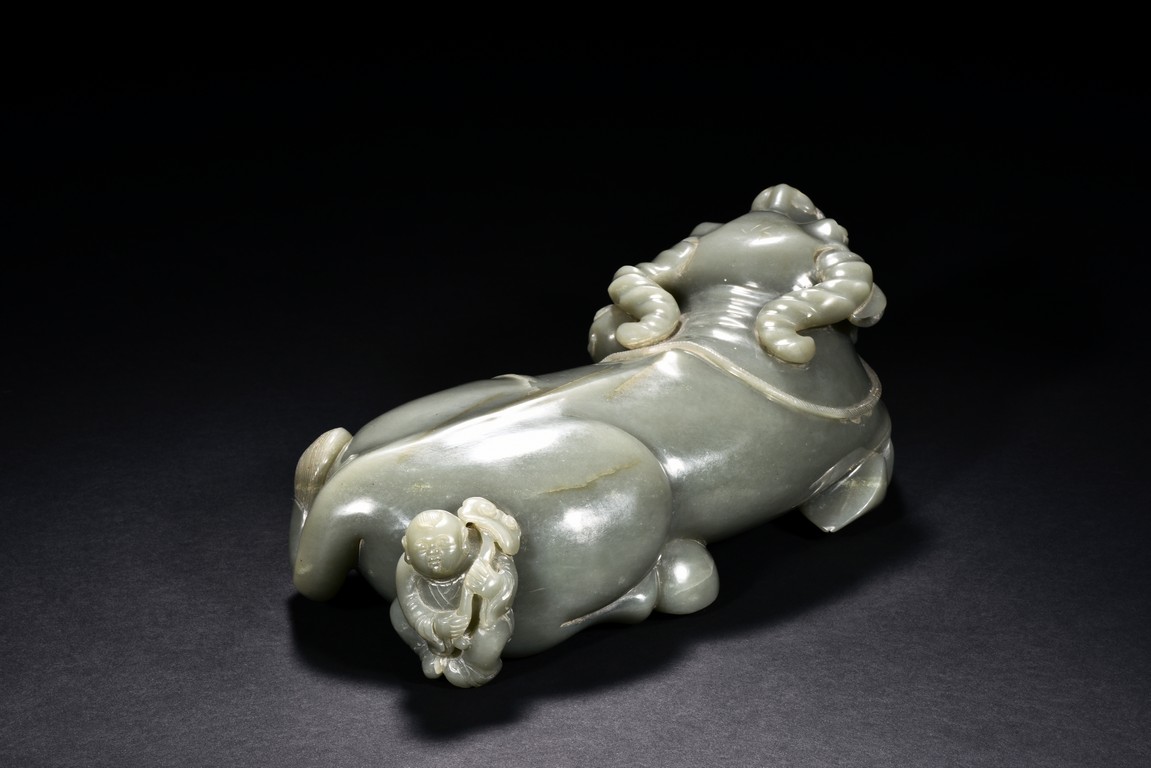 The recumbent buffalo is carved with four feet tucked underneath body,the head slightly raised and tail swept to the left,with a boy sitting beside holding a rope tied through its nostril and over its back,and the other side with a boy holding a large lingzhi. The stone is of even celadon tone with minor russet veins. Accompanied with hardwood carved base imitating the rocky ground. Qing Dynasty period.