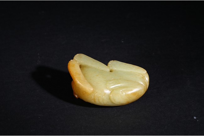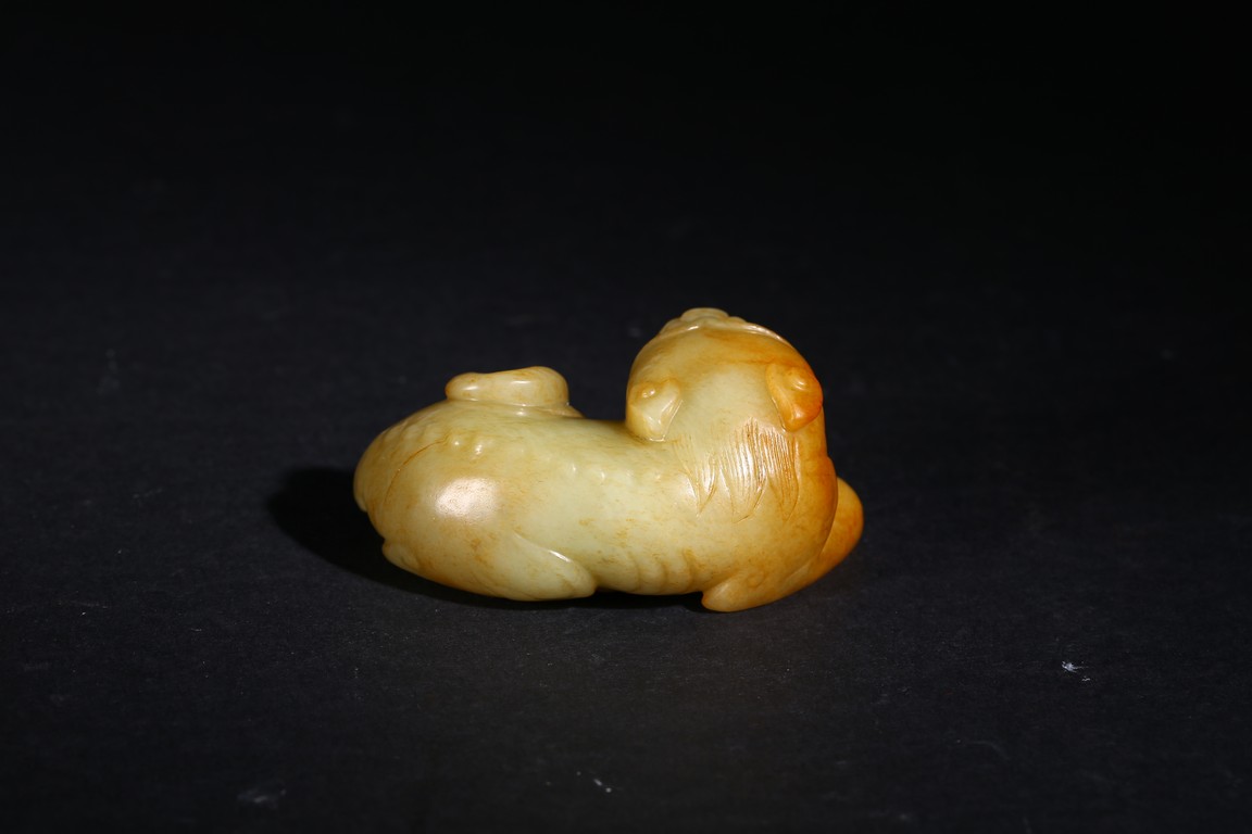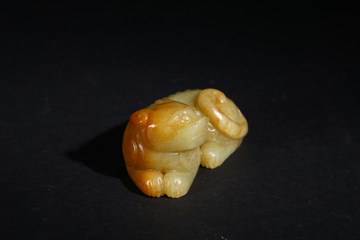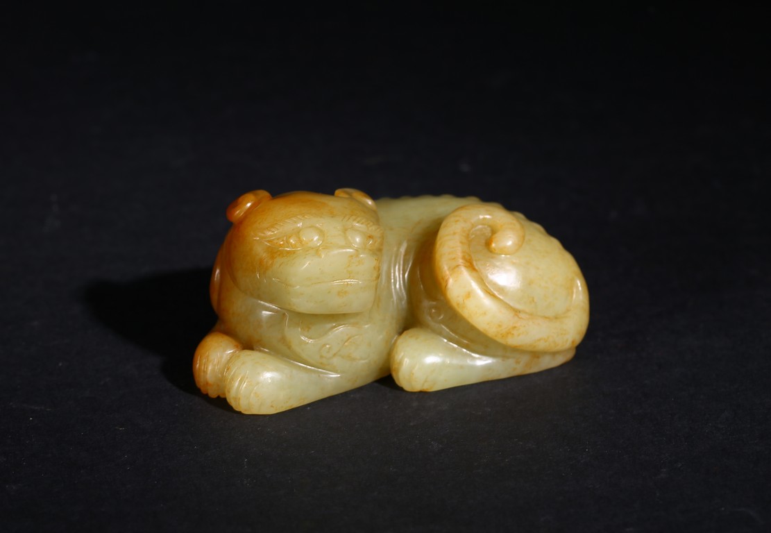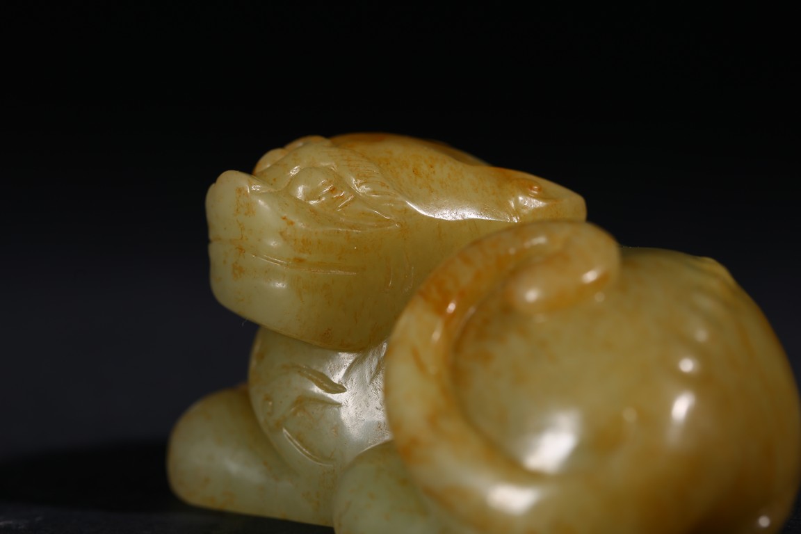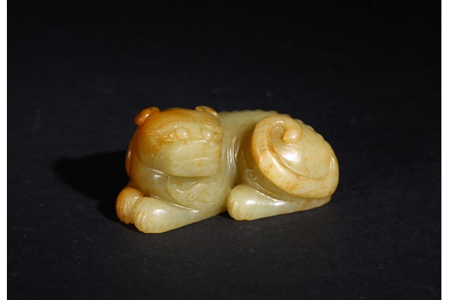 Depicted recumbent with the head turned to its left and resting on its front paws,the mythical beast portrayed with bulging eyes and an wide snout,its back rendered with a prominent spinal column terminating in a long tail swept against its haunches,the pebble of a warm yellow colour attractively highlighted with extensive russet patches. Qing Dynasty period.