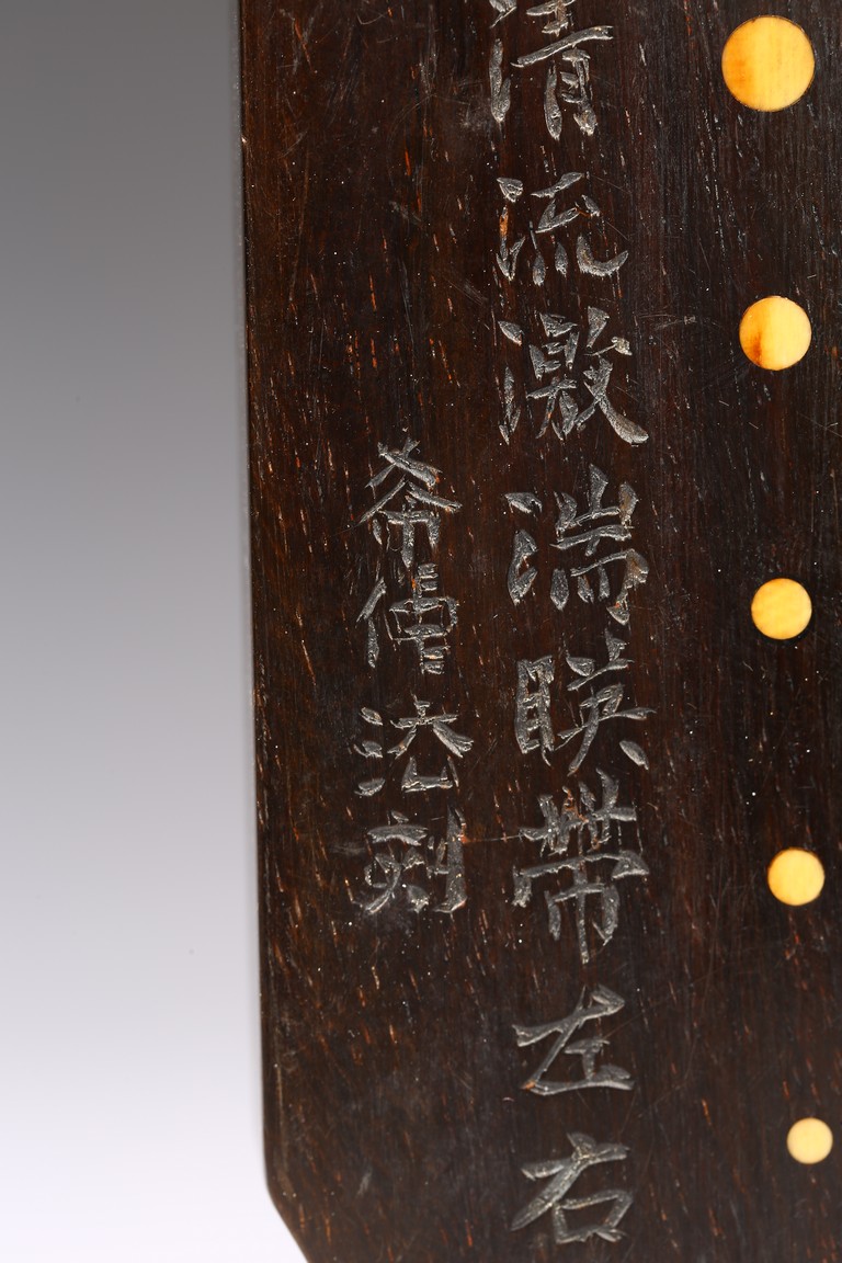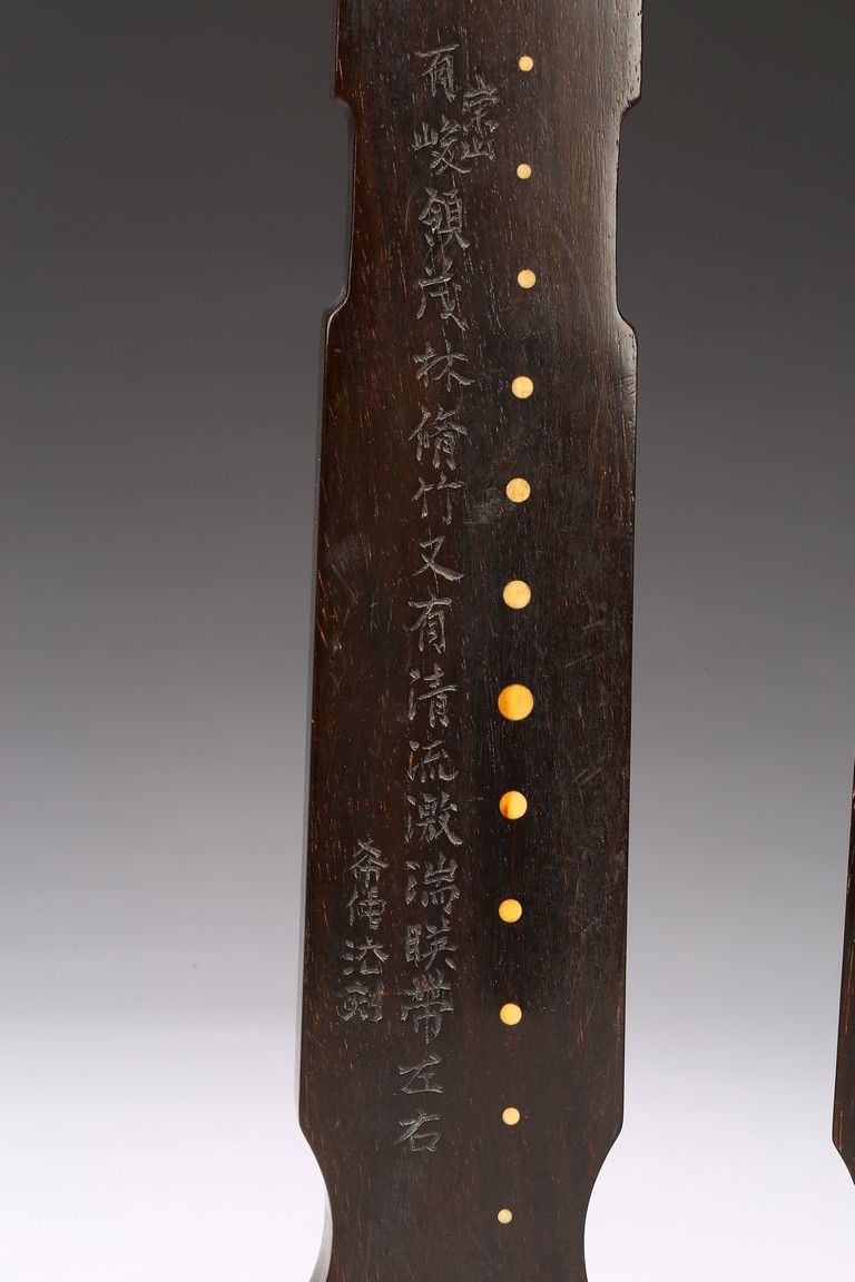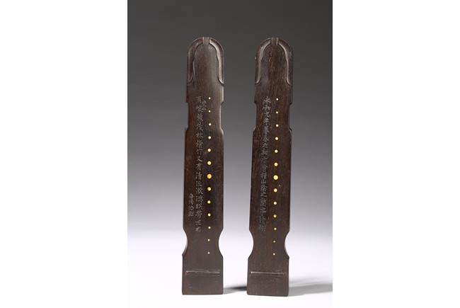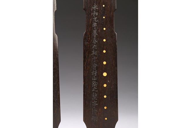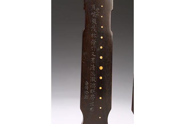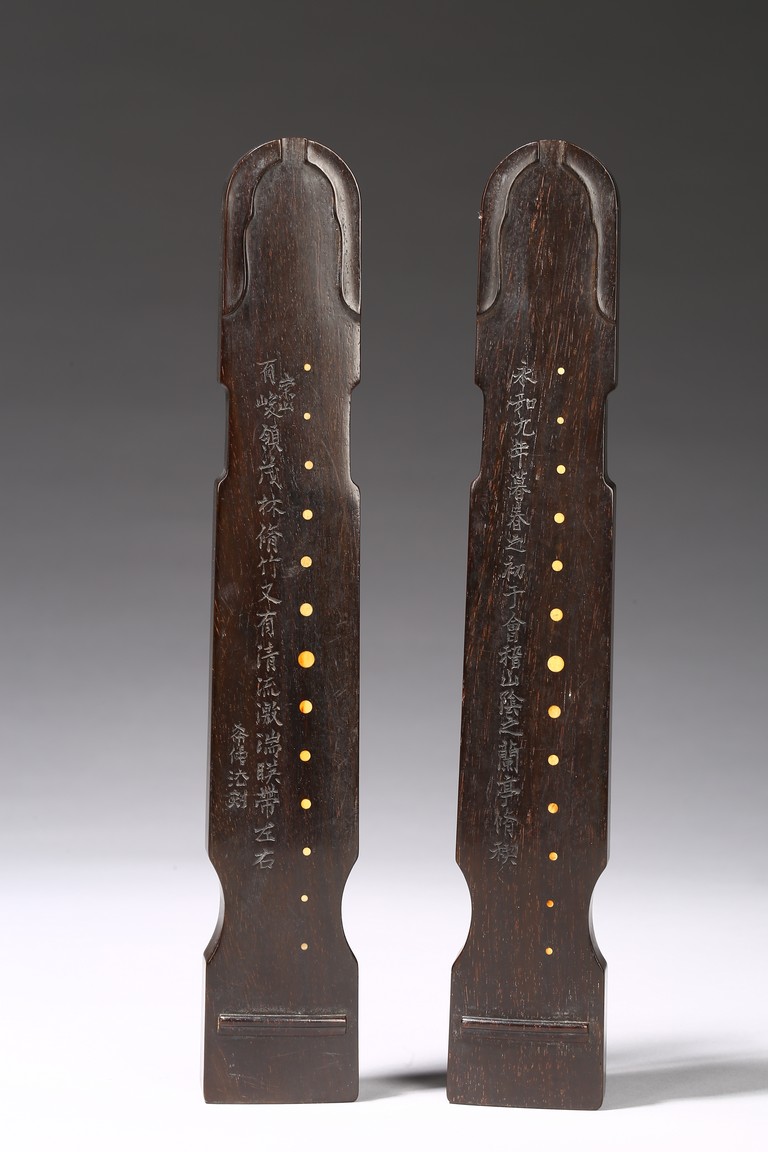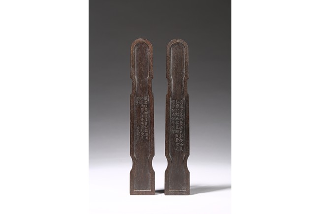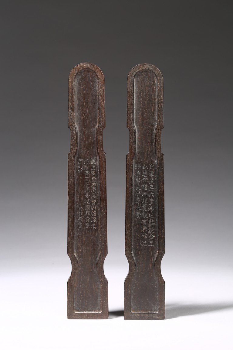 Modelled in the form of qin instrument, each top inscribed in running script with Wang Xizhi's essay Lantingji Xu, signed Xi Zhong; the reverse is finely inscribed in clerical script with excerpts from classical essay by Han Dynasty political theorist Zhong Changtong, the wood is patinated to an attractive dark brown tone. Qing Dynasty period.