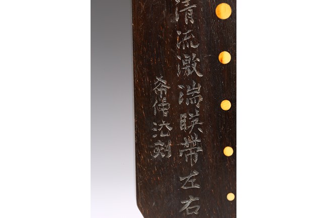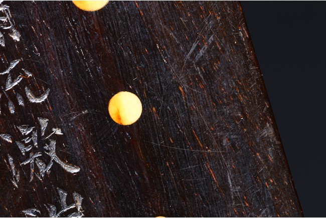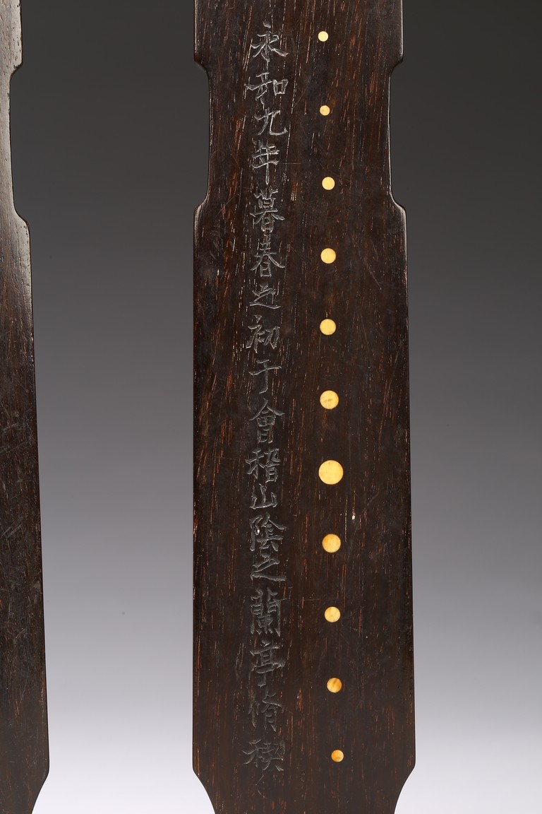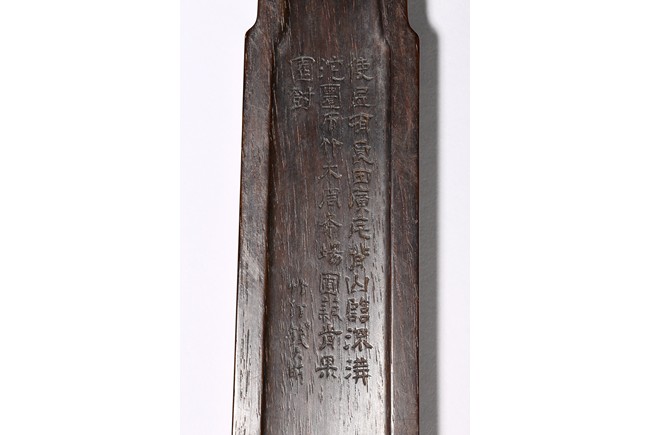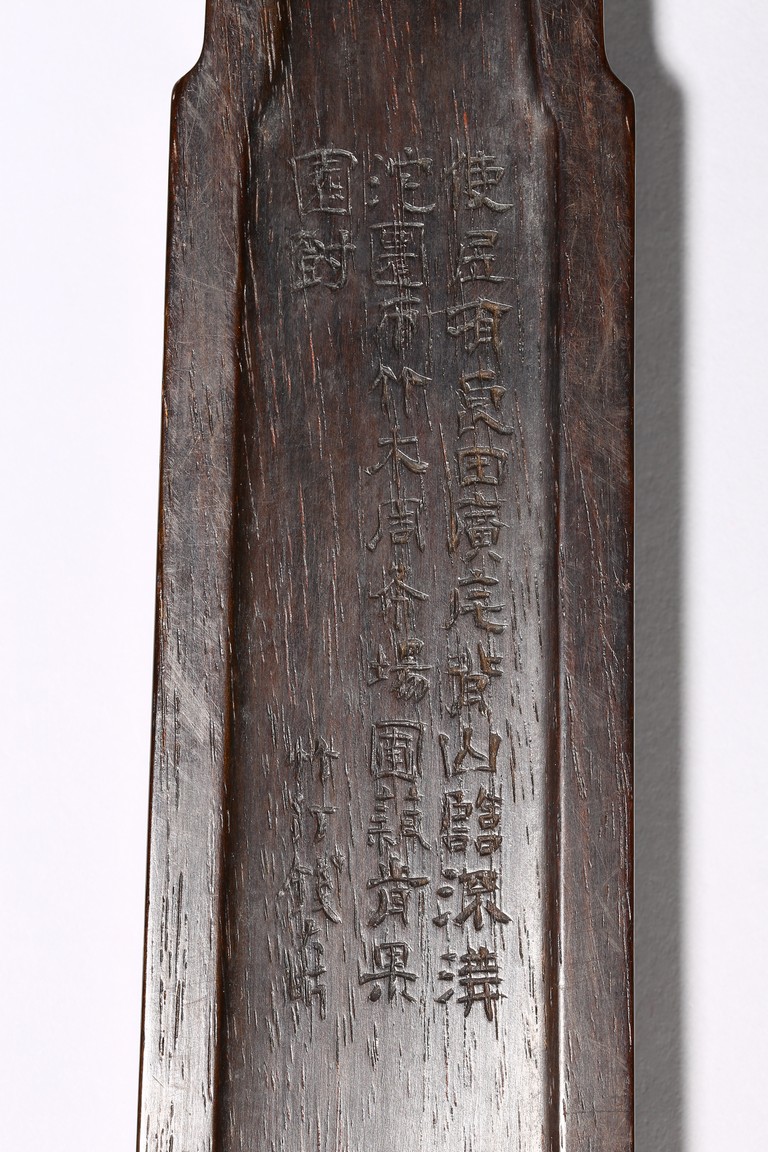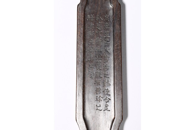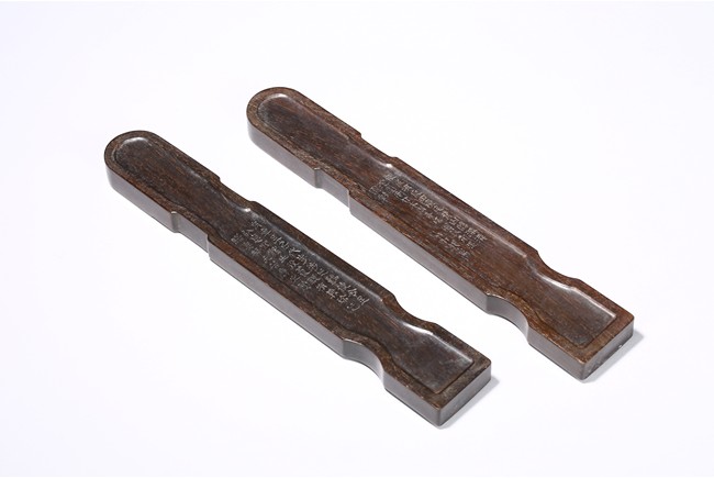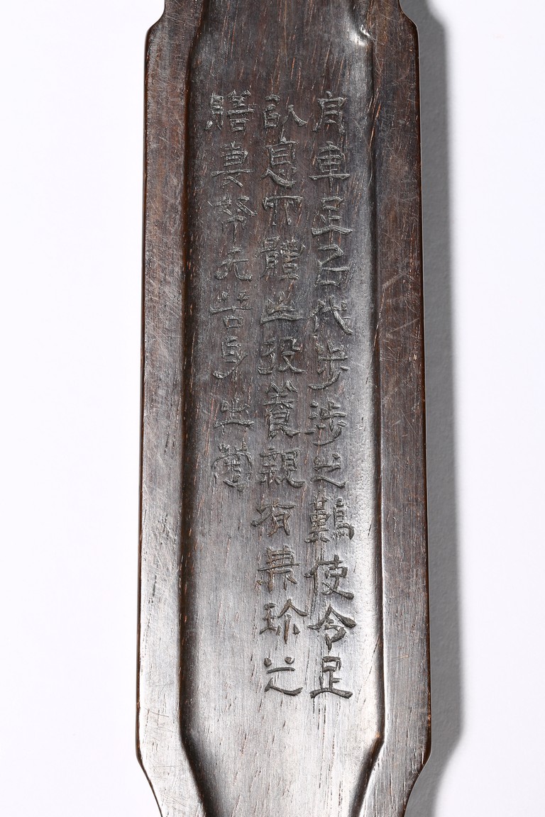 Modelled in the form of qin instrument, each top inscribed in running script with Wang Xizhi's essay Lantingji Xu, signed Xi Zhong; the reverse is finely inscribed in clerical script with excerpts from classical essay by Han Dynasty political theorist Zhong Changtong, the wood is patinated to an attractive dark brown tone. Qing Dynasty period.