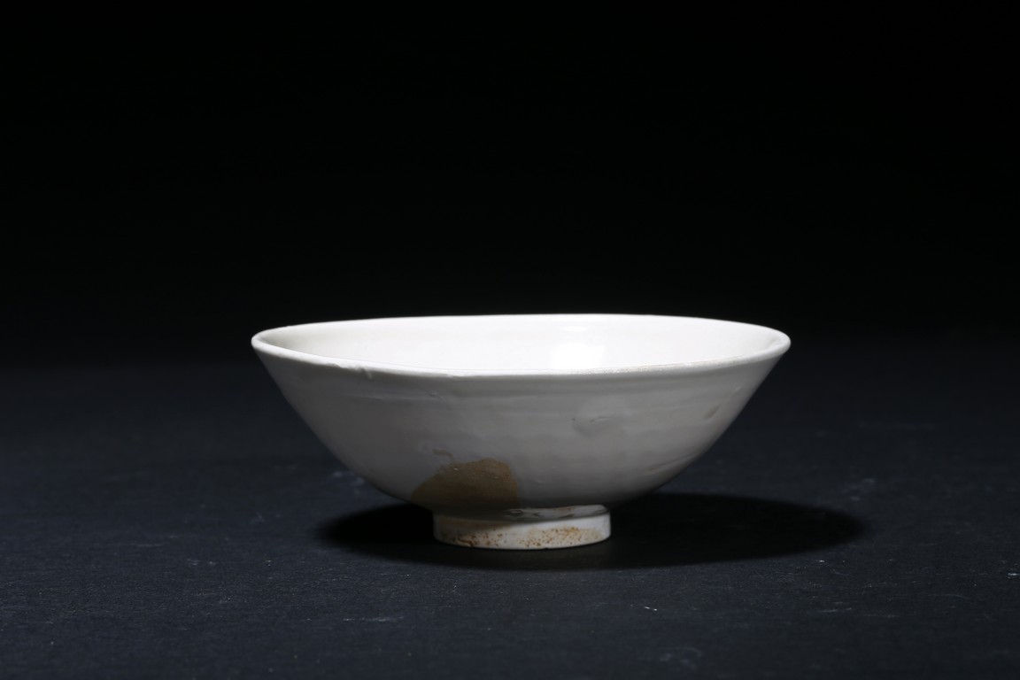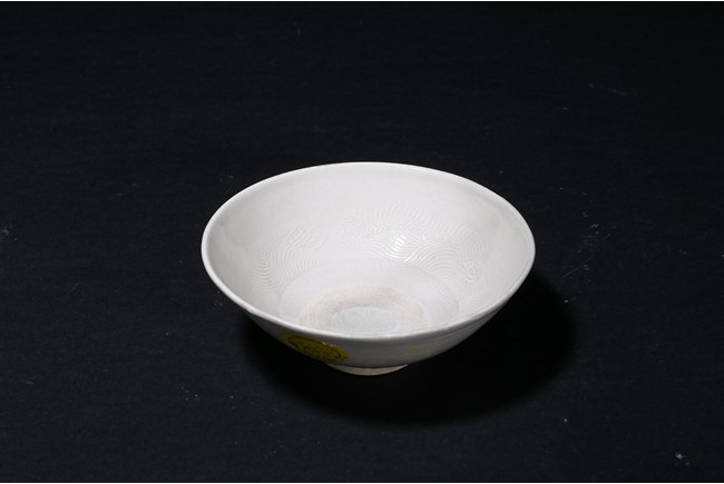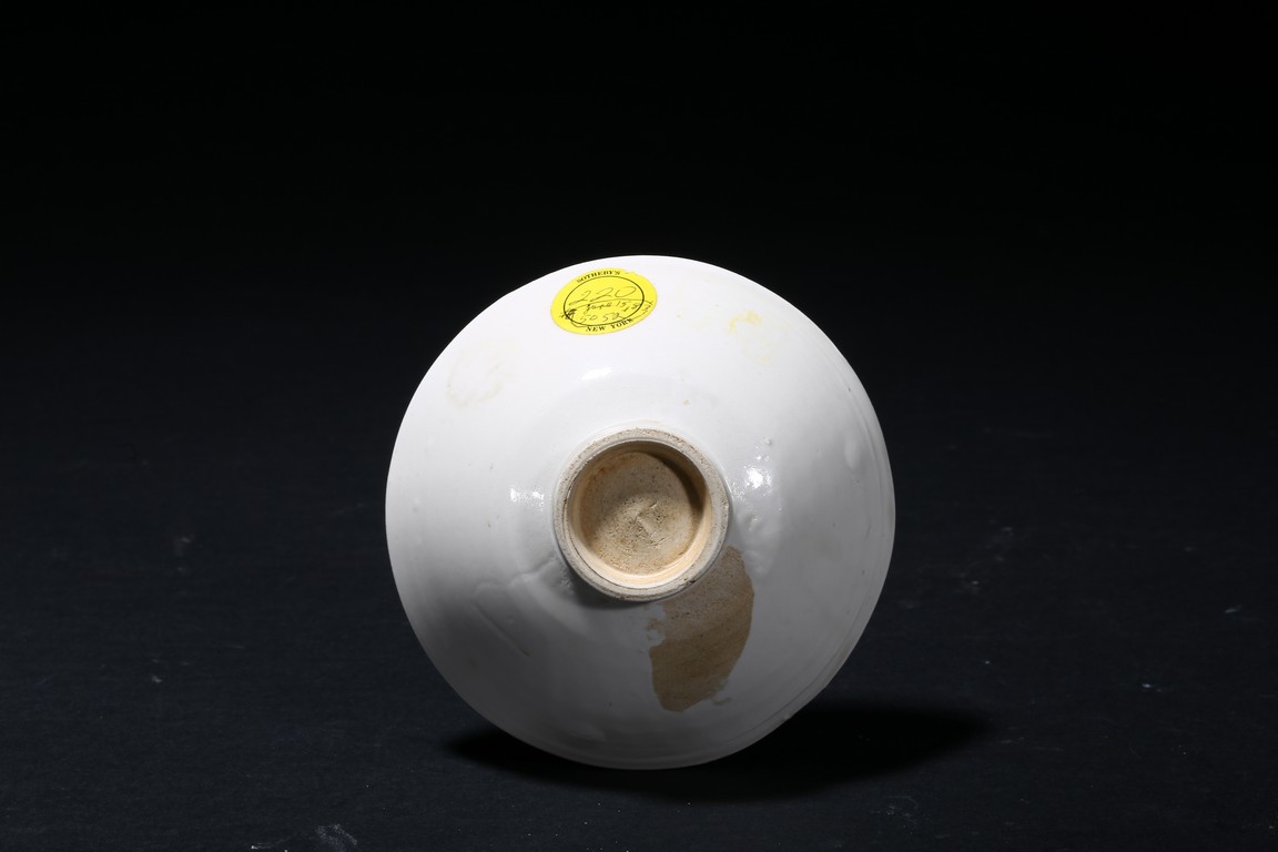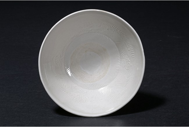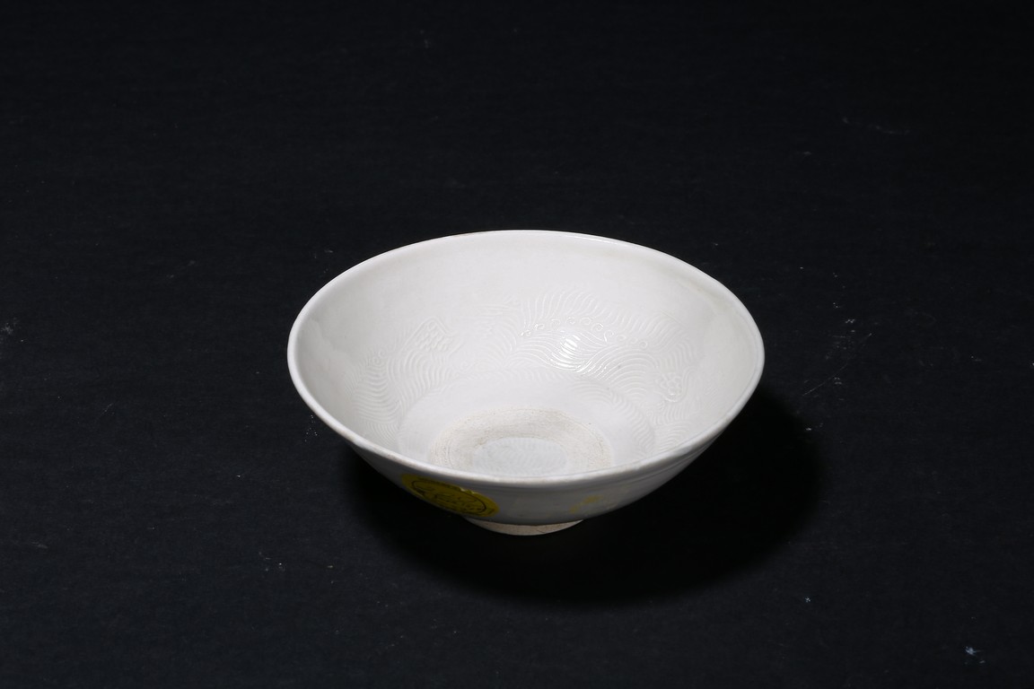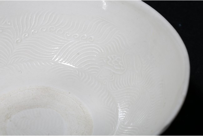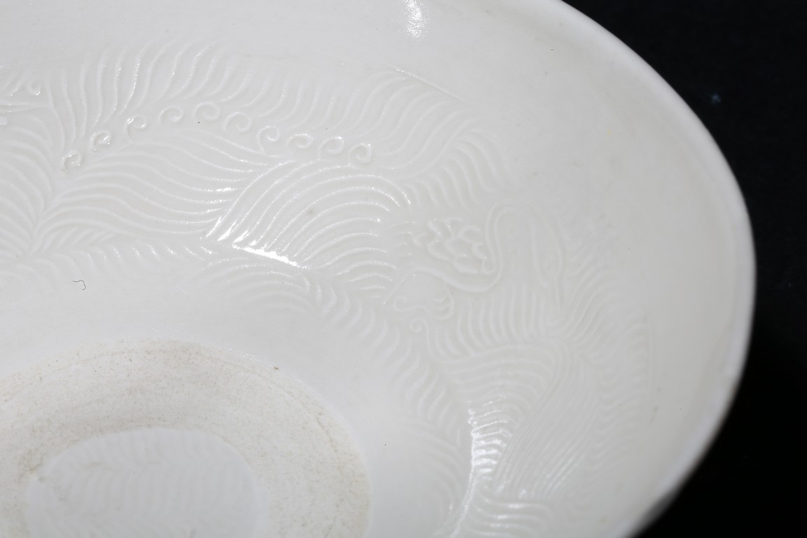 Of Ding type,the dish interior is crisply molded with four waterfowl amid swirling waves encircling an unglazed ring,the glaze of milky white color failing short of the neatly finished foot with one unglazed patch on the plain exterior. Song Dynasty period.