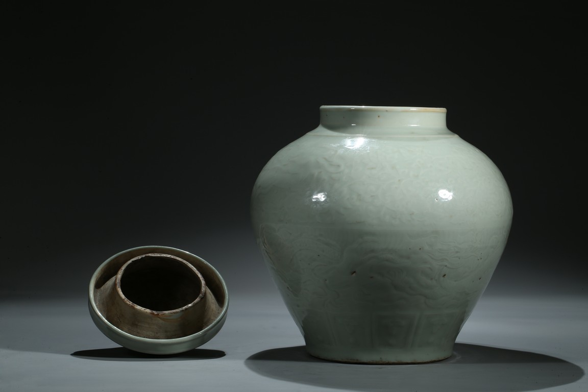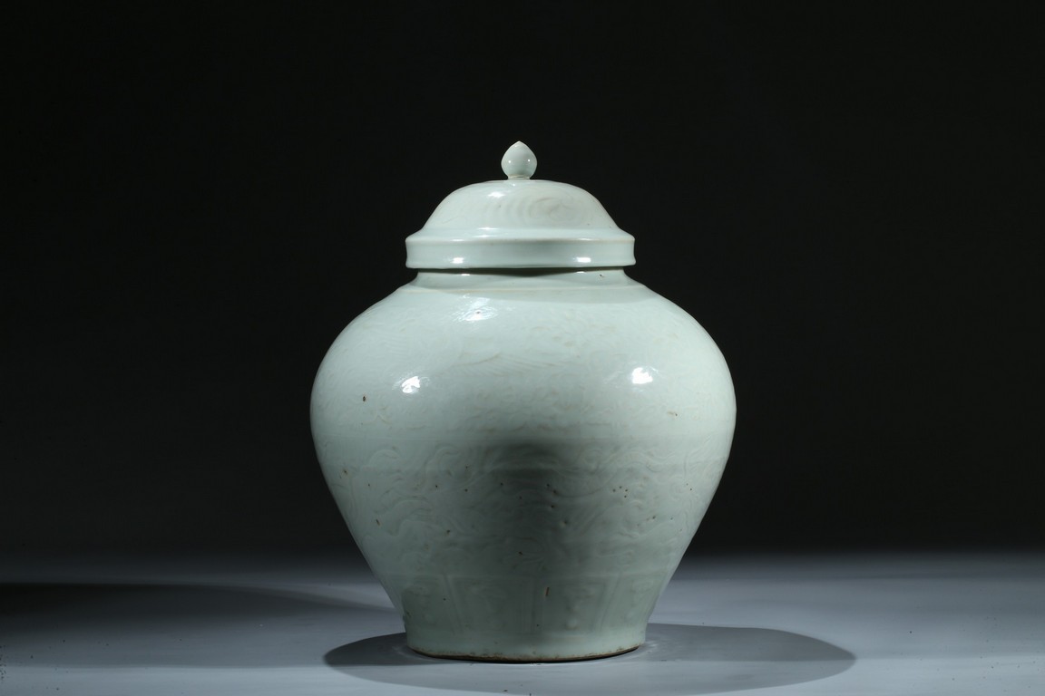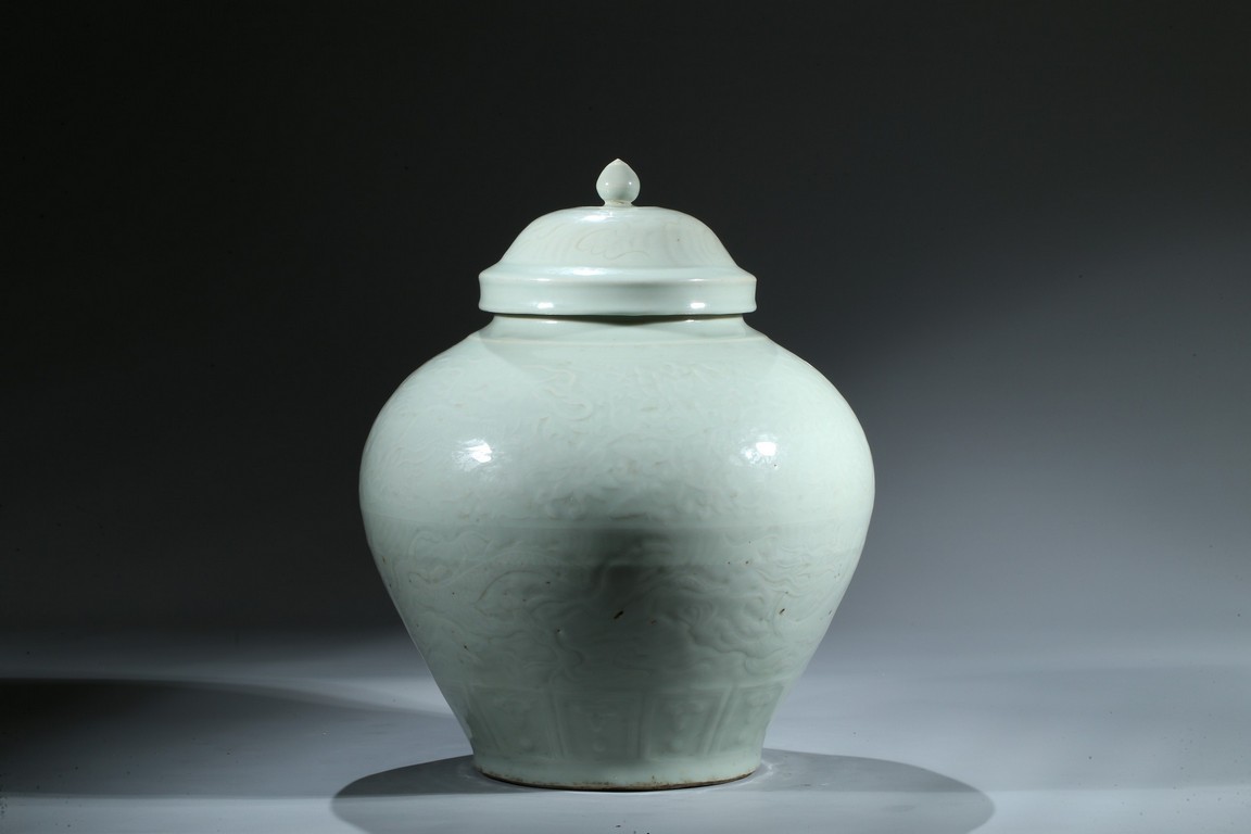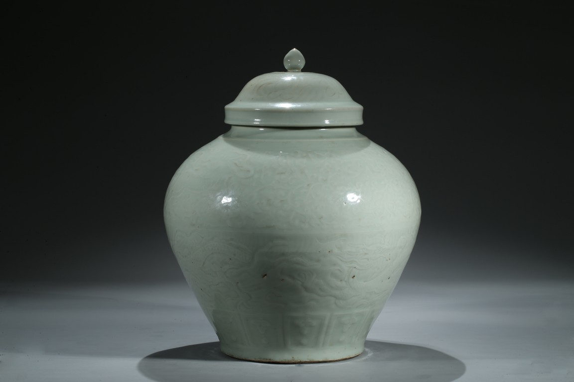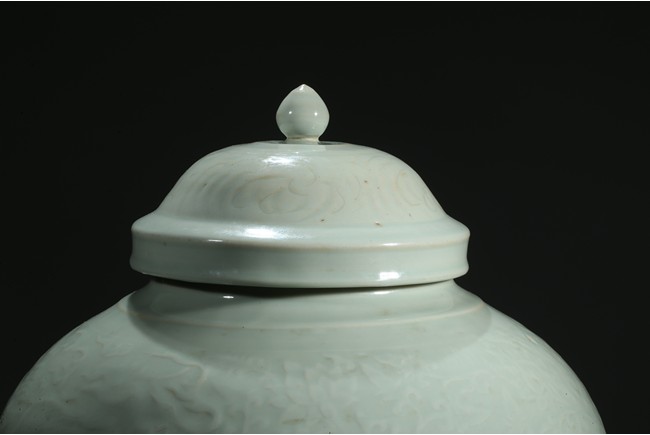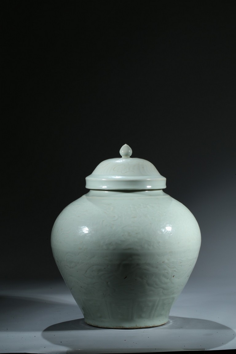 “樞府釉”是一種卵白釉,由青白瓷發展而來。元代沿襲宋代舊制,設樞密院作為最高軍事機關,它和管理文官的中書省並稱“二府”。樞府瓷是元代景德鎮的著名產品。其釉色白微泛青,恰似鴨蛋色澤,故又稱“卵白釉”。樞府釉瓷器一部分是宮廷訂燒器,一部分為外銷瓷和民用瓷。本品胎骨堅細厚重,造型碩大敦實,通體盡施樞府釉,外壁及蓋運用剔刻技法裝飾纏枝蓮紋,紋樣清晰,質感強烈,外壁釉下模印飾纏枝蓮紋及雲龍紋,蓋刻蓮花紋,線條俐落,流暢如畫。全器工藝精湛,文化藝術內涵豐富,製作工藝精湛,是非常難得的元代遺珍。來源:紐約藏家提供, 其家族1970年前購於Sydney L Moss Ltd Provenance: Private collection, New York, acquired from Sydney L Moss Ltd before 1970 by repute