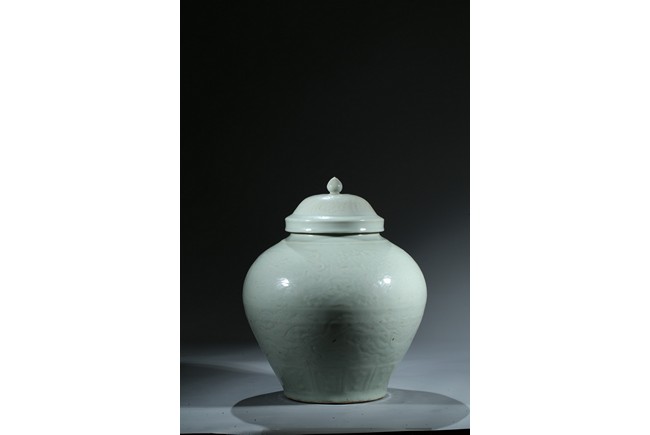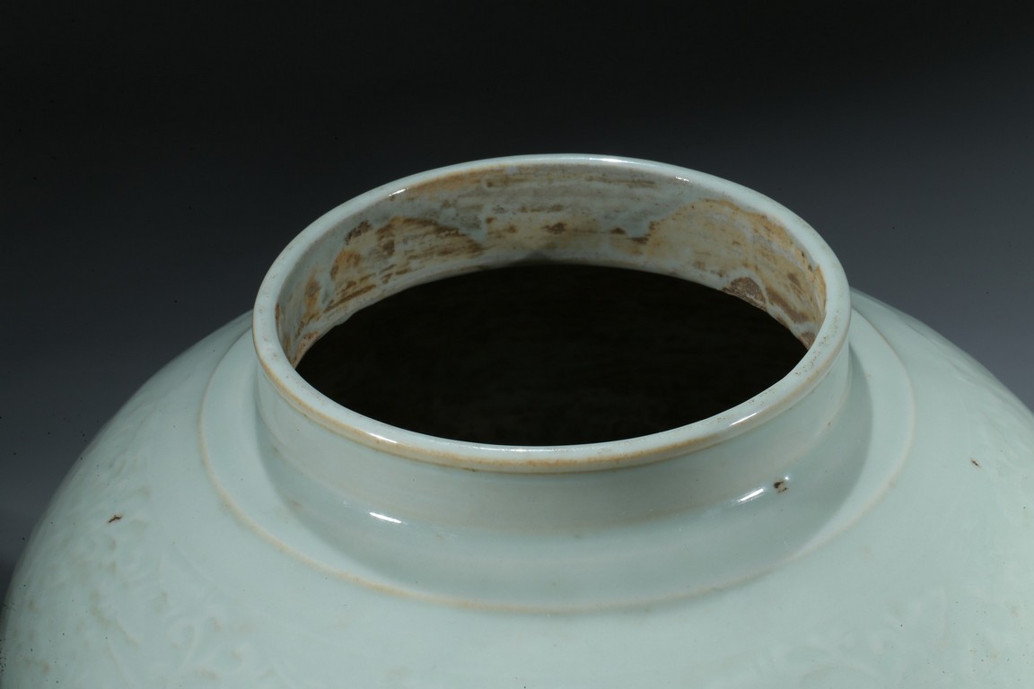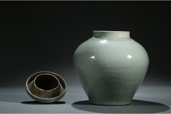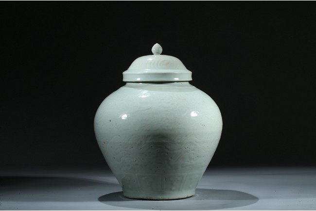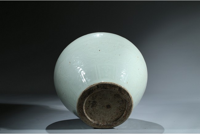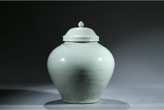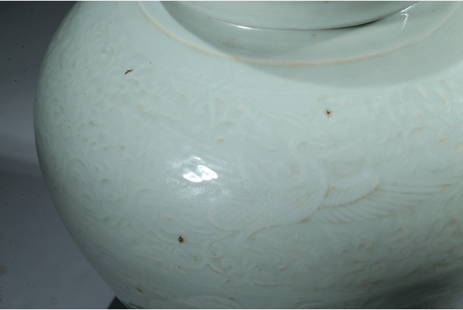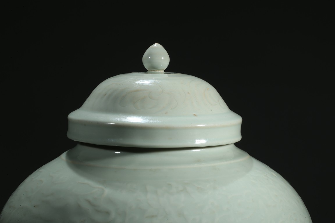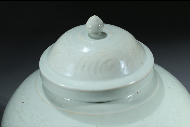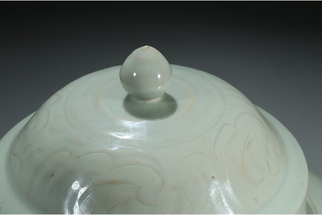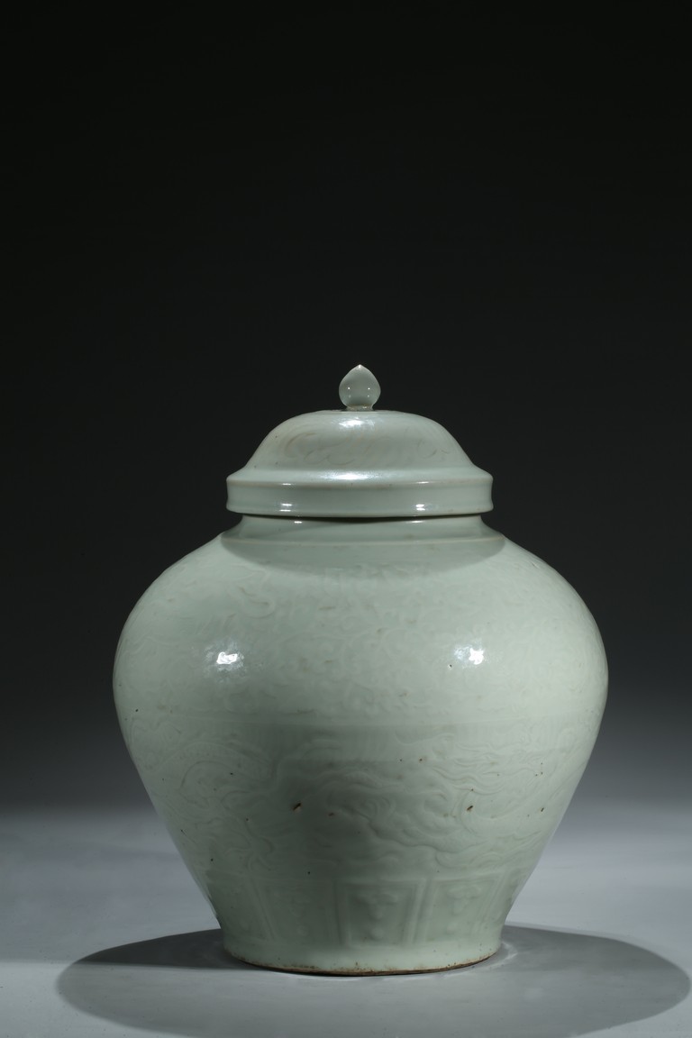“樞府釉”是一種卵白釉,由青白瓷發展而來。元代沿襲宋代舊制,設樞密院作為最高軍事機關,它和管理文官的中書省並稱“二府”。樞府瓷是元代景德鎮的著名產品。其釉色白微泛青,恰似鴨蛋色澤,故又稱“卵白釉”。樞府釉瓷器一部分是宮廷訂燒器,一部分為外銷瓷和民用瓷。本品胎骨堅細厚重,造型碩大敦實,通體盡施樞府釉,外壁及蓋運用剔刻技法裝飾纏枝蓮紋,紋樣清晰,質感強烈,外壁釉下模印飾纏枝蓮紋及雲龍紋,蓋刻蓮花紋,線條俐落,流暢如畫。全器工藝精湛,文化藝術內涵豐富,製作工藝精湛,是非常難得的元代遺珍。來源:紐約藏家提供, 其家族1970年前購於Sydney L Moss Ltd Provenance: Private collection, New York, acquired from Sydney L Moss Ltd before 1970 by repute
