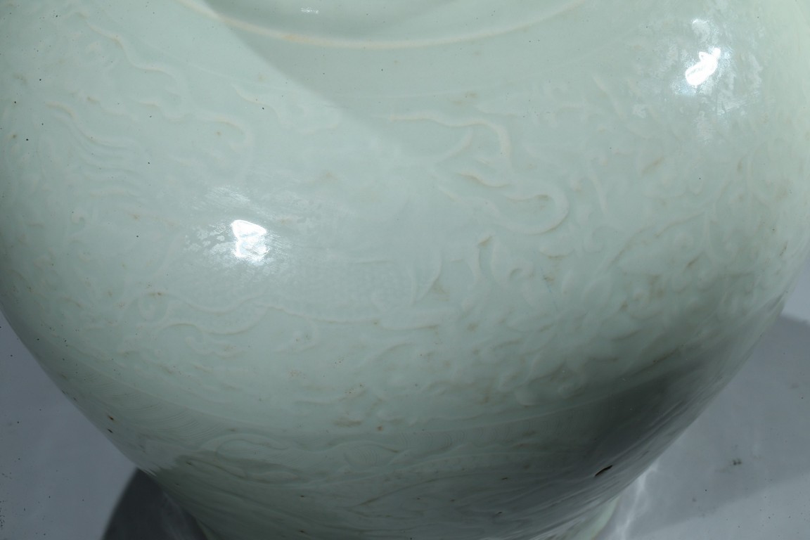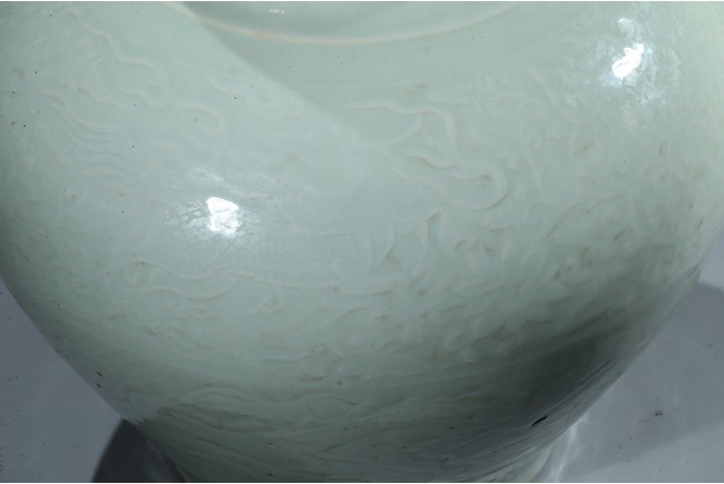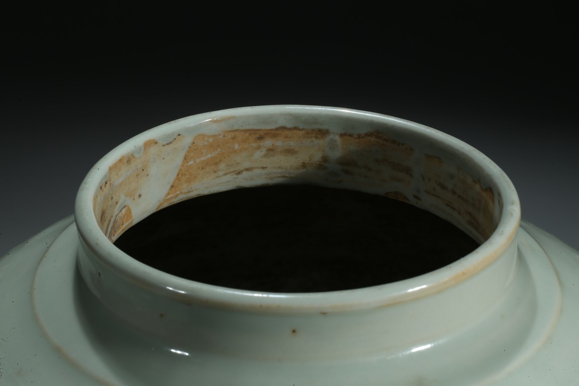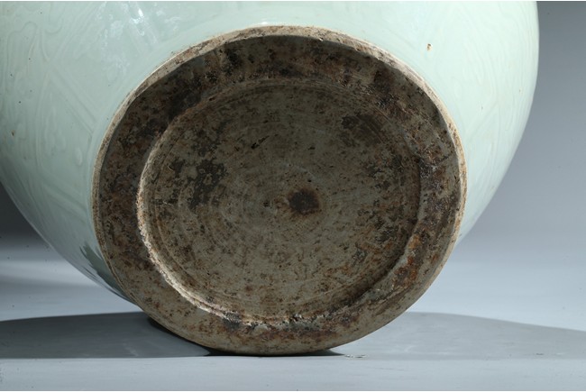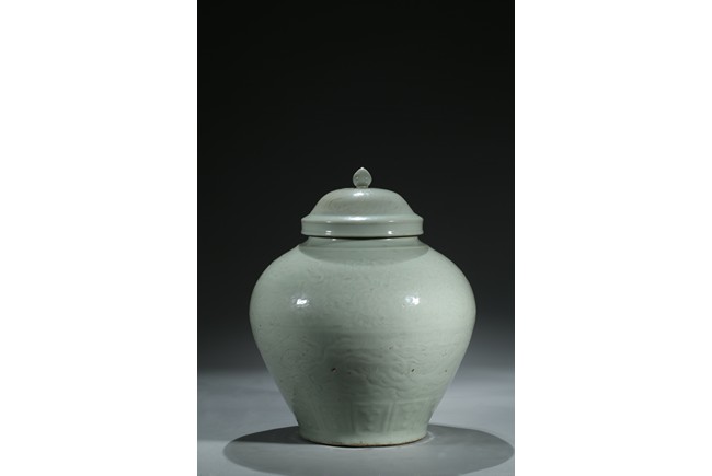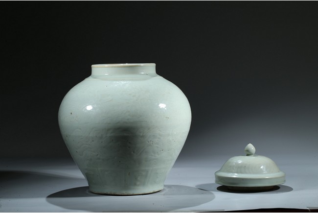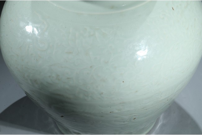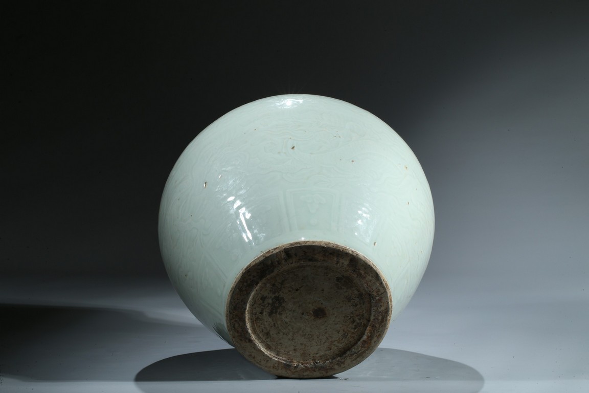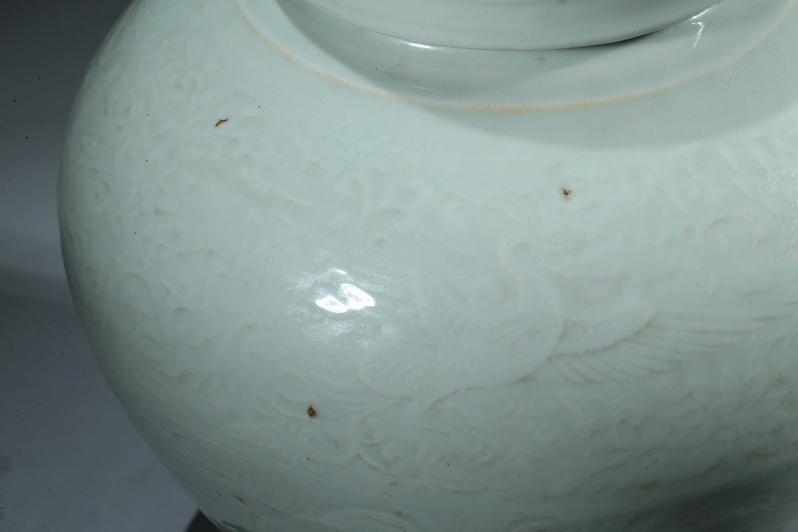 “樞府釉”是一種卵白釉,由青白瓷發展而來。元代沿襲宋代舊制,設樞密院作為最高軍事機關,它和管理文官的中書省並稱“二府”。樞府瓷是元代景德鎮的著名產品。其釉色白微泛青,恰似鴨蛋色澤,故又稱“卵白釉”。樞府釉瓷器一部分是宮廷訂燒器,一部分為外銷瓷和民用瓷。本品胎骨堅細厚重,造型碩大敦實,通體盡施樞府釉,外壁及蓋運用剔刻技法裝飾纏枝蓮紋,紋樣清晰,質感強烈,外壁釉下模印飾纏枝蓮紋及雲龍紋,蓋刻蓮花紋,線條俐落,流暢如畫。全器工藝精湛,文化藝術內涵豐富,製作工藝精湛,是非常難得的元代遺珍。來源:紐約藏家提供, 其家族1970年前購於Sydney L Moss Ltd Provenance: Private collection, New York, acquired from Sydney L Moss Ltd before 1970 by repute