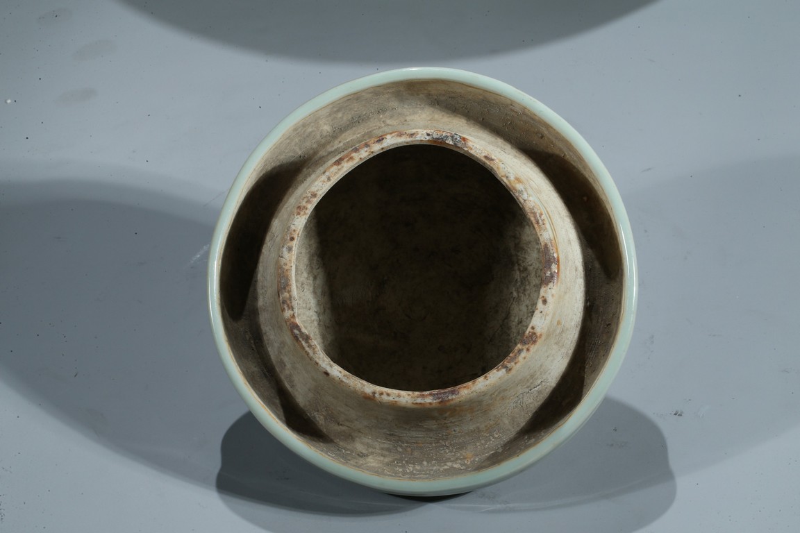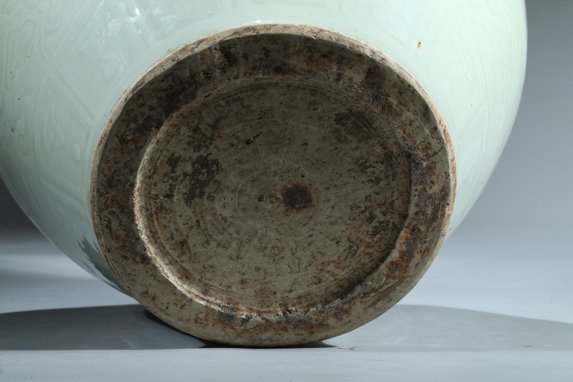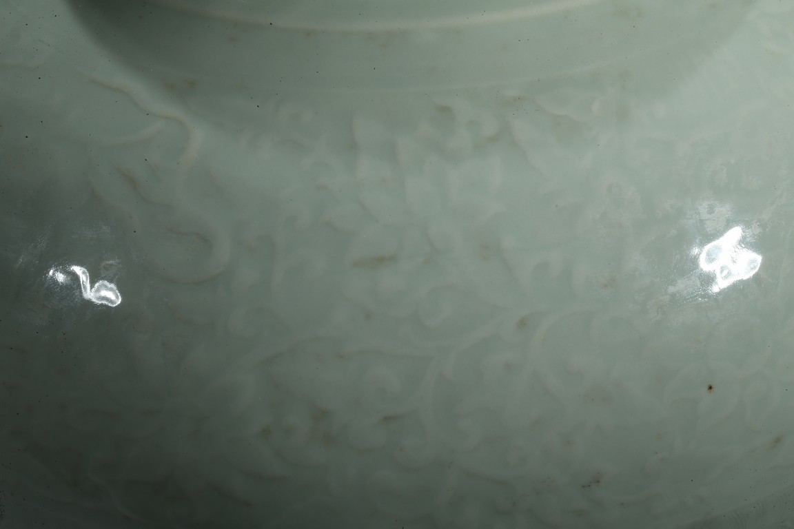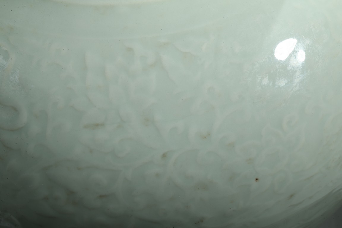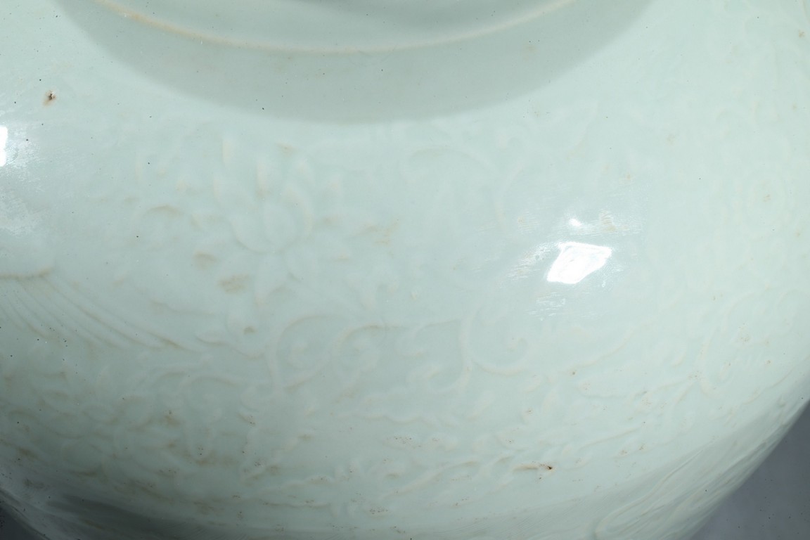 “樞府釉”是一種卵白釉,由青白瓷發展而來。元代沿襲宋代舊制,設樞密院作為最高軍事機關,它和管理文官的中書省並稱“二府”。樞府瓷是元代景德鎮的著名產品。其釉色白微泛青,恰似鴨蛋色澤,故又稱“卵白釉”。樞府釉瓷器一部分是宮廷訂燒器,一部分為外銷瓷和民用瓷。本品胎骨堅細厚重,造型碩大敦實,通體盡施樞府釉,外壁及蓋運用剔刻技法裝飾纏枝蓮紋,紋樣清晰,質感強烈,外壁釉下模印飾纏枝蓮紋及雲龍紋,蓋刻蓮花紋,線條俐落,流暢如畫。全器工藝精湛,文化藝術內涵豐富,製作工藝精湛,是非常難得的元代遺珍。來源:紐約藏家提供, 其家族1970年前購於Sydney L Moss Ltd Provenance: Private collection, New York, acquired from Sydney L Moss Ltd before 1970 by repute