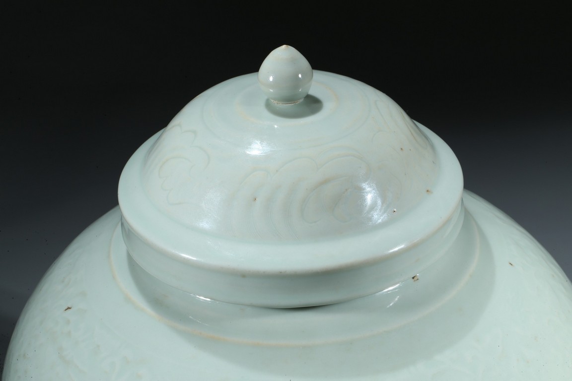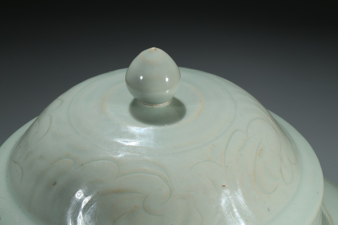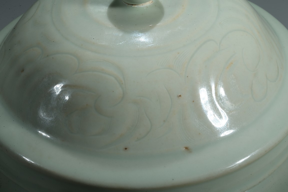 Finely potted with rounded sides to a high shoulder and short tapered rim, elegantly moulded around the exterior with three bands depicting sinuous dragons travelling through the clouds, below a large band of foliate scrolls and above a band of overlapping lotus lappets, the domed cover incised with stylized floral scrolls and surmounted with a lotus bud finial. Yuan Dynasty period.
