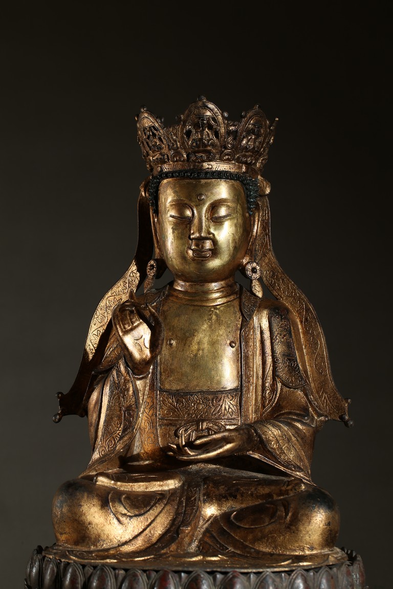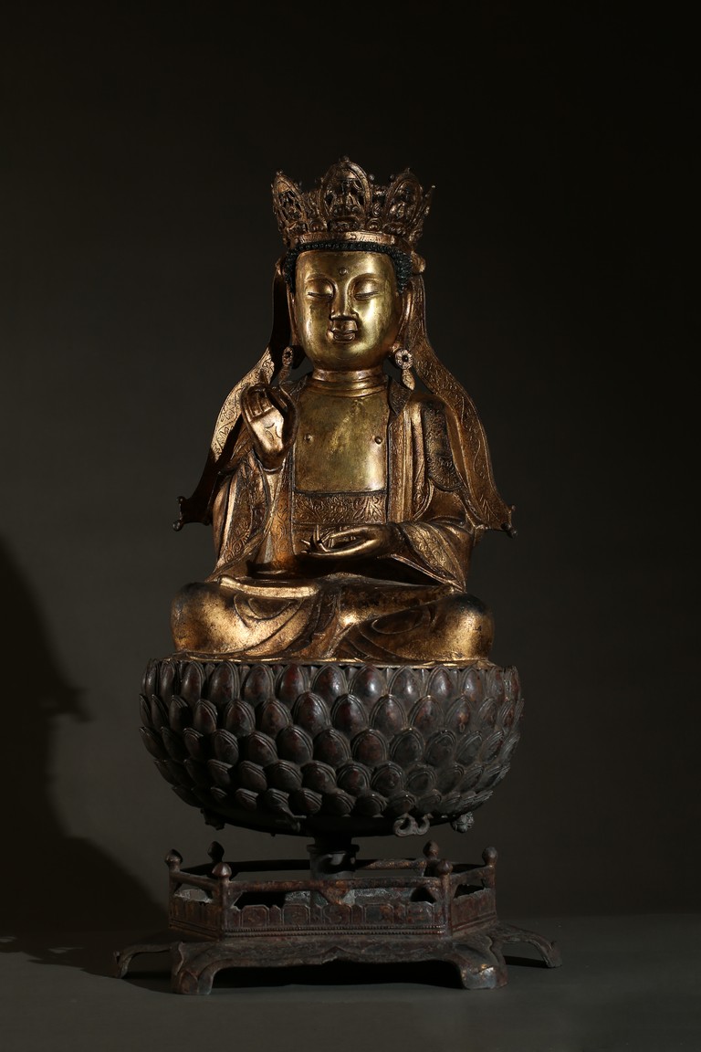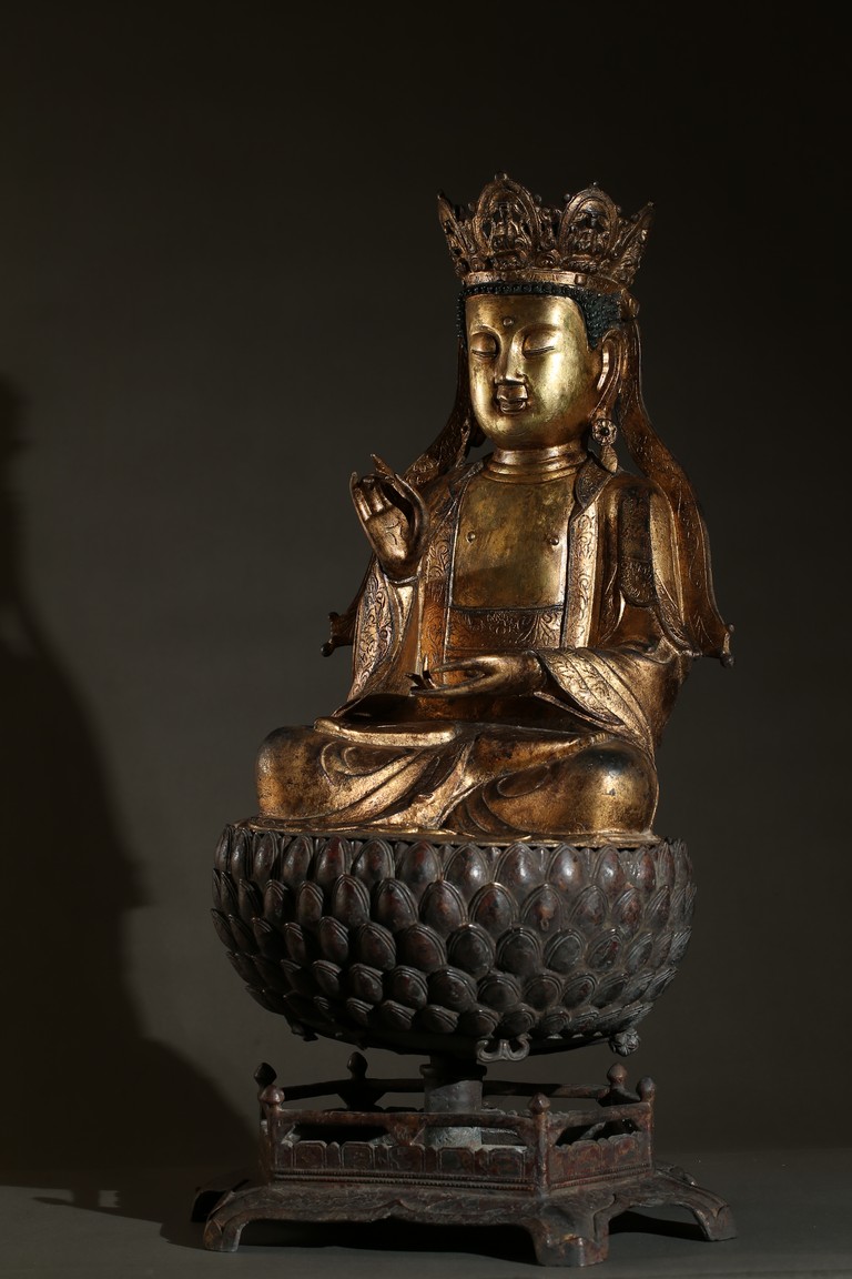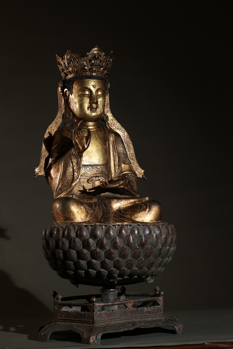 Cast seated in dhyanasana with the right hand holding a willow stem (missing),dressed in loose robes elaborately decorated with floral borders,the face with downcast eyes framed by elongated earlobes suspending pendant earrings,the hair dressed in a topknot,wearing a pointed tiara centered by a figure of Amitabha Buddha,with long flowing ribbon on both shoulders,all supported on an associated five-tier lotus flower base,above a hexagonal plinth cast with stylized waves,raised on six ruyi-form supports. Ming Dynasty period.