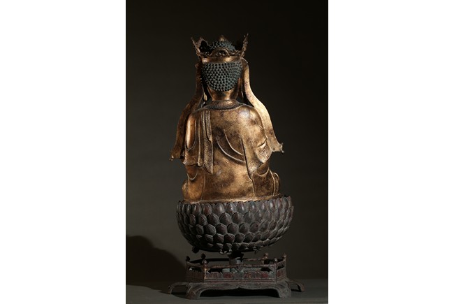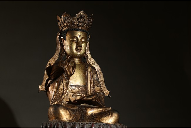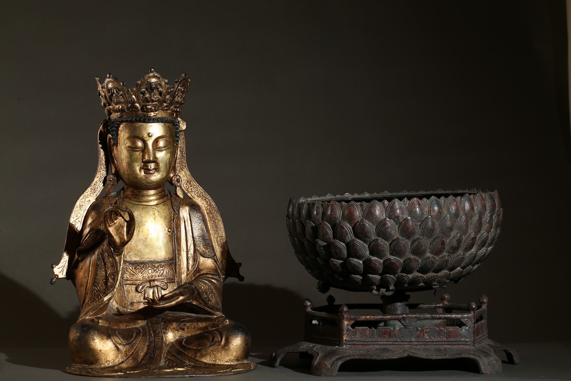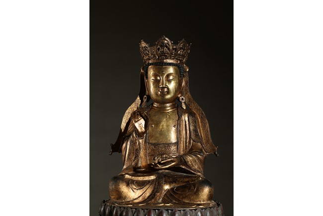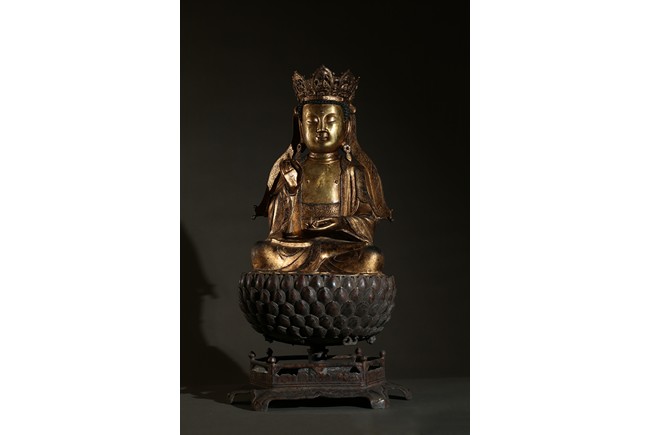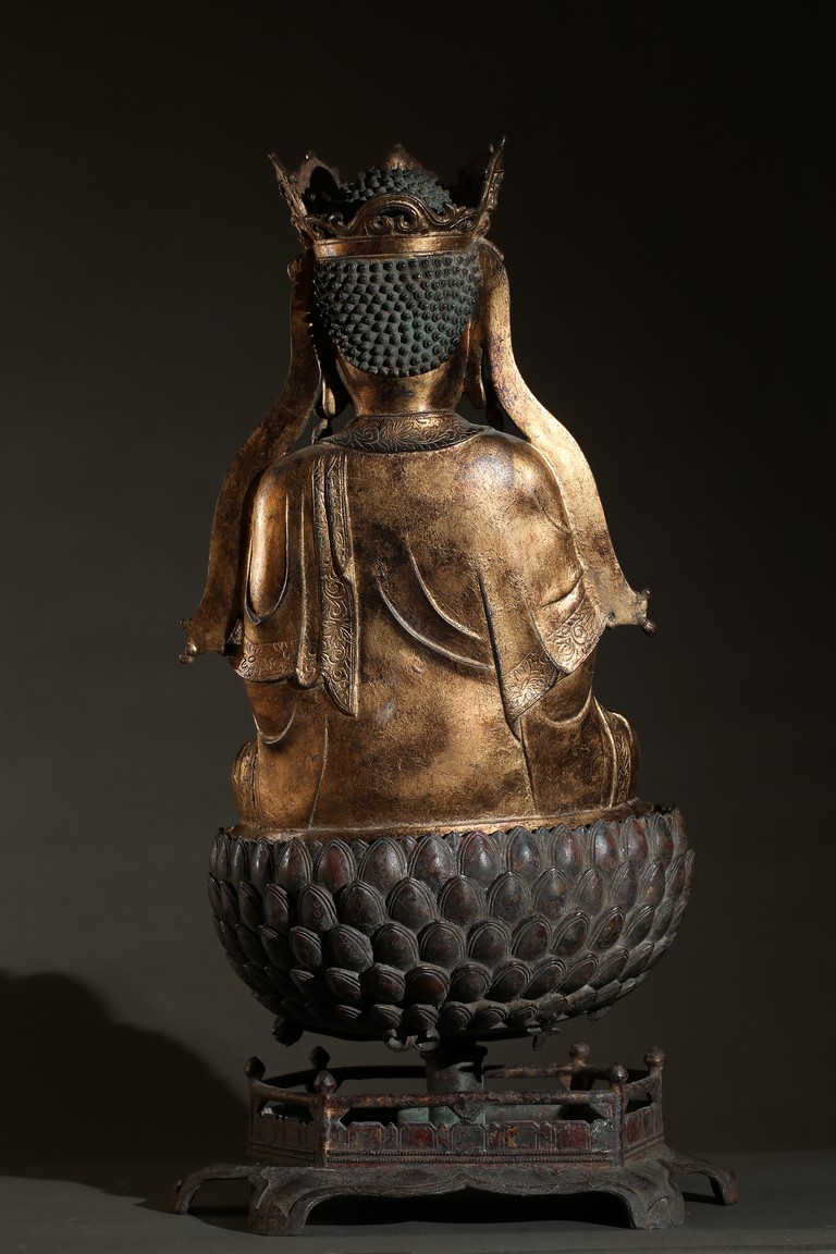 Cast seated in dhyanasana with the right hand holding a willow stem (missing),dressed in loose robes elaborately decorated with floral borders,the face with downcast eyes framed by elongated earlobes suspending pendant earrings,the hair dressed in a topknot,wearing a pointed tiara centered by a figure of Amitabha Buddha,with long flowing ribbon on both shoulders,all supported on an associated five-tier lotus flower base,above a hexagonal plinth cast with stylized waves,raised on six ruyi-form supports. Ming Dynasty period.