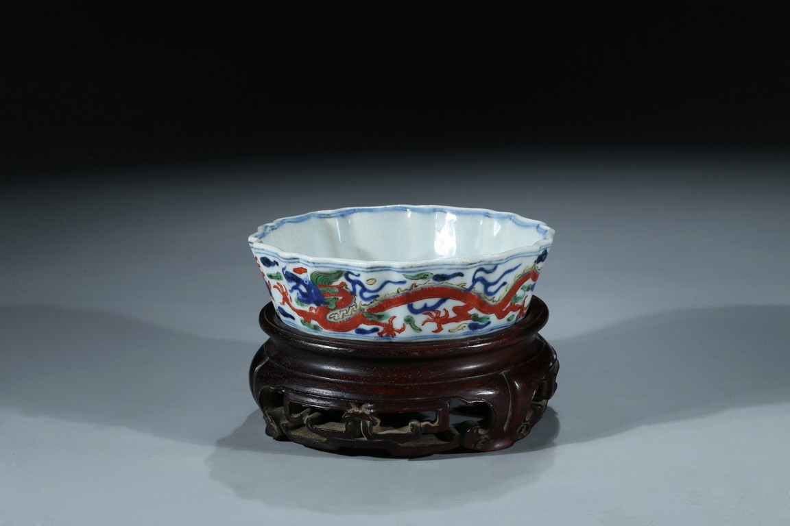 The brush washer is potted with ten lobes, each in the shape of a mallow petal, flaring from a slightly recessed base, the interior finely painted with dragon medallion, the side further painted with dragon in pursuit of the flaming pearl, the underside inscribed with six character Jiajing mark. Ming Dynasty period.