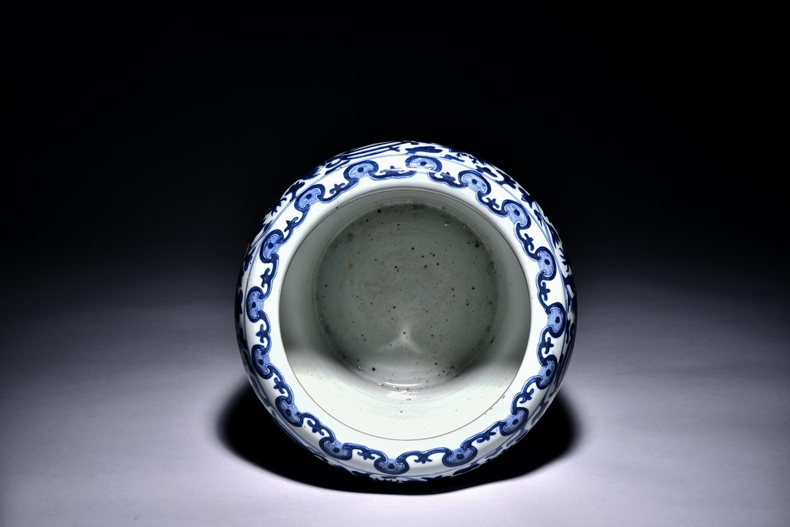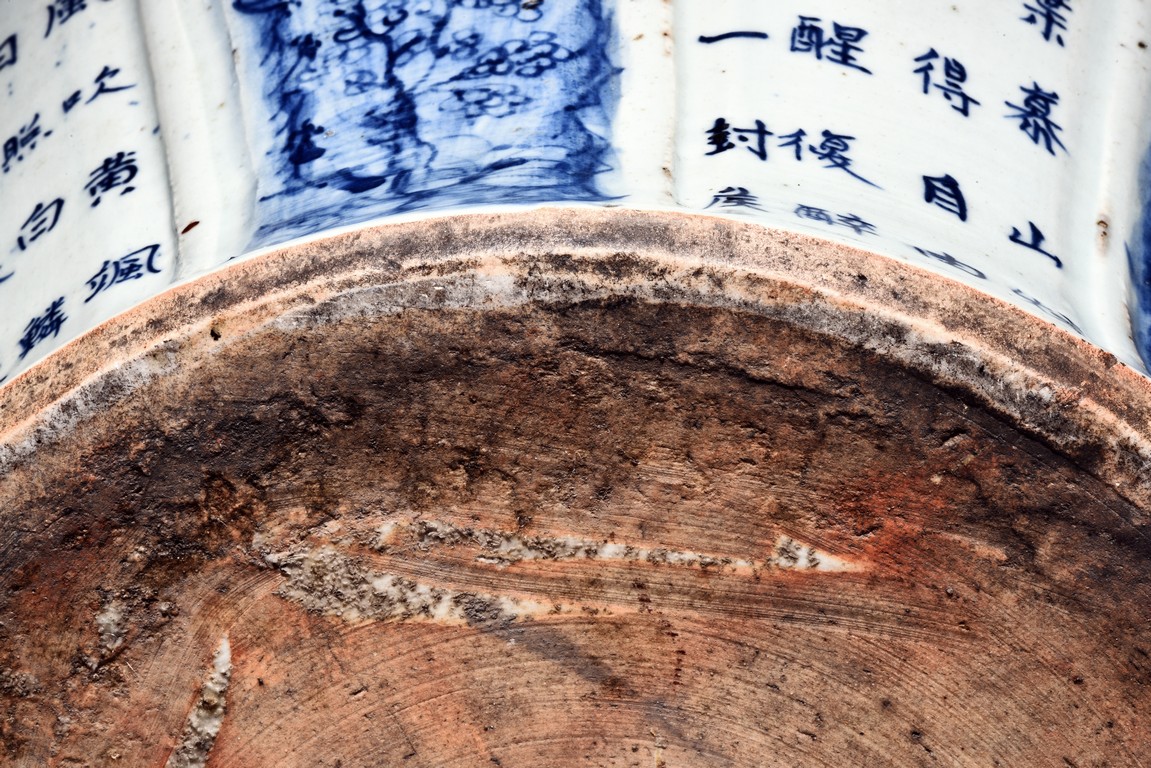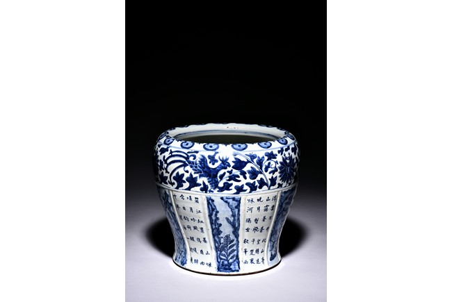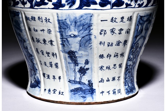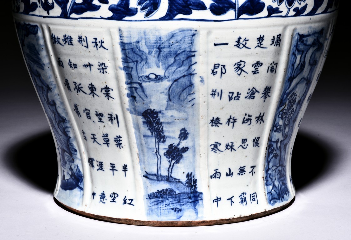 The exterior is finely painted with alternating panels of landscape and poem,with a band of phoenix and stylized scrolling floral pattern above,the inturned mouth rim decorated with a band of lingzhi pattern. Qing Dynasty period.