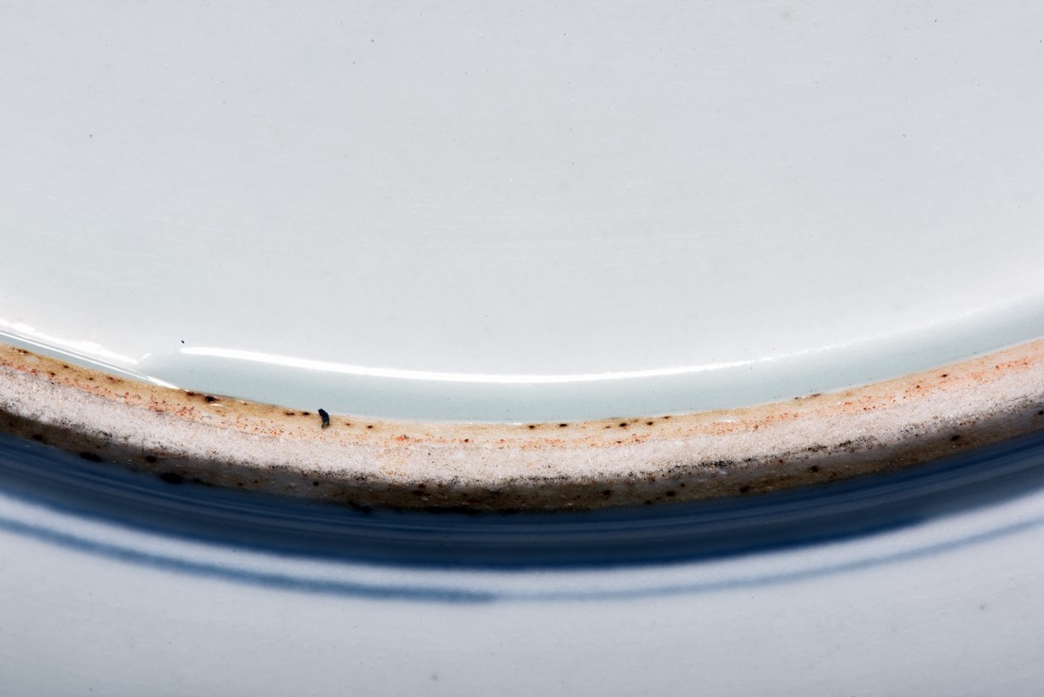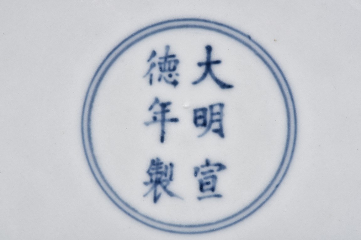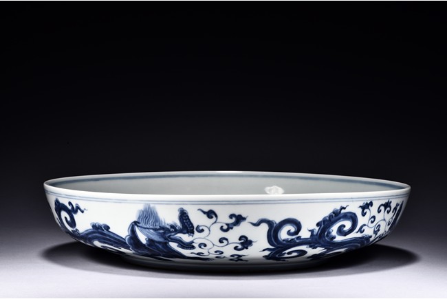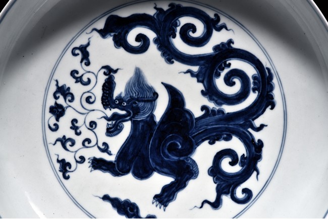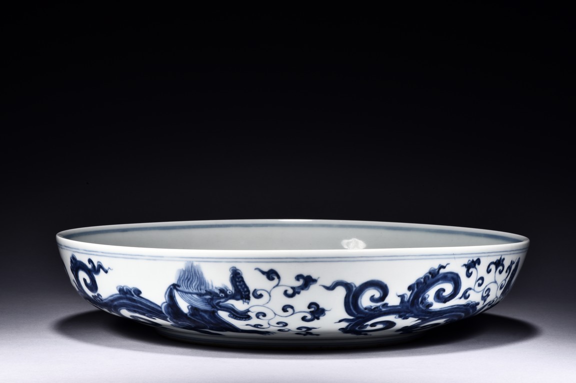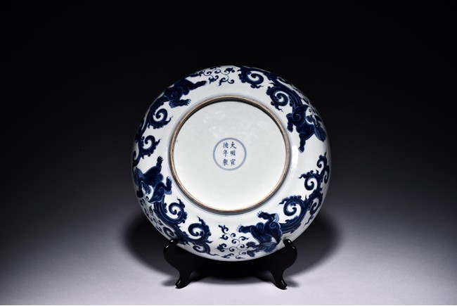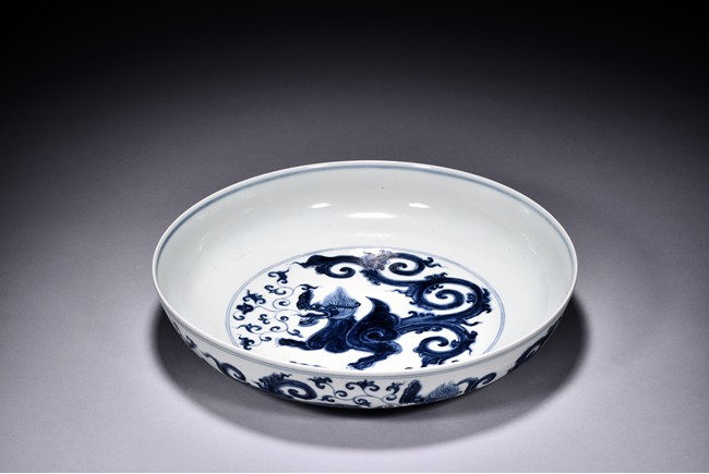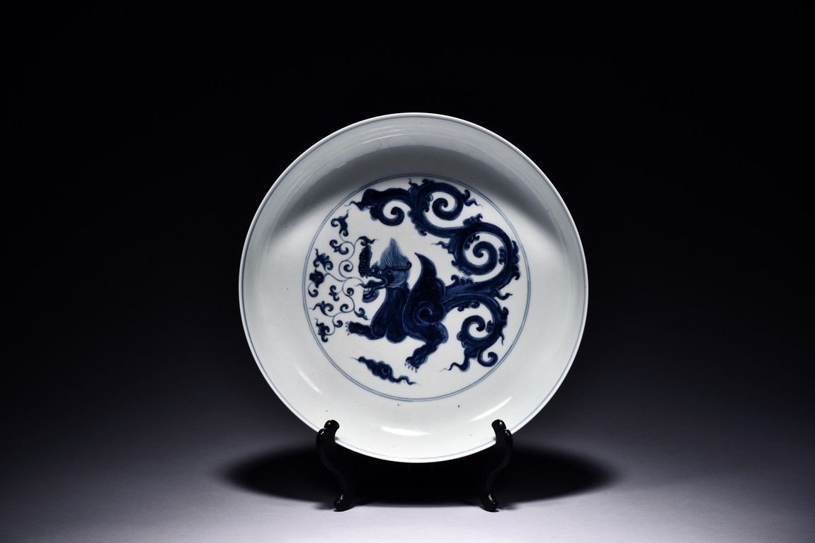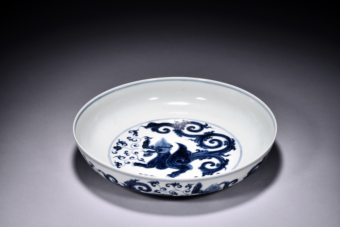 Rising from a circular foot ring and potted with shallow sides,the dish is painted to the interior center in cobalt blue to depict a powerful qilin with splitting tails and agape mouth,with foliate scroll issuing from mouth,all enclosed by double circle borders. The exterior is further decorated with a continuous scene of four similar qilin above the foot. The base bears a six character 'XUANDE' mark within double circle borders. Qing Dynasty period.