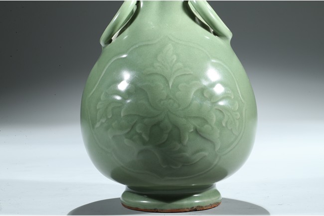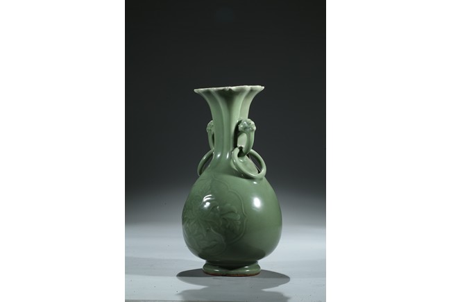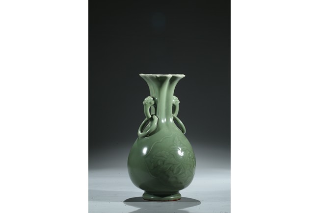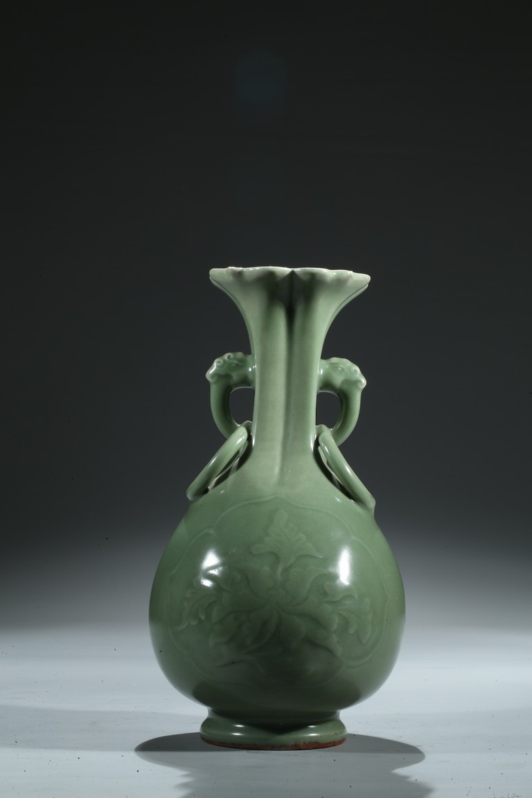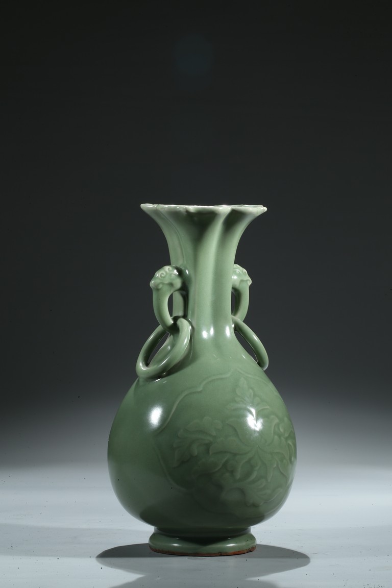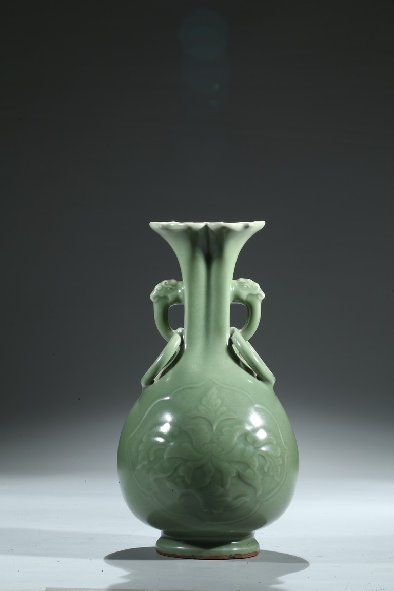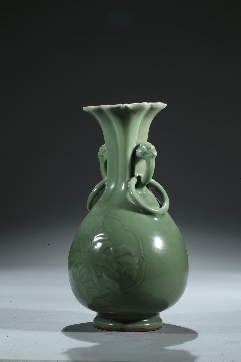 The bulbous body rising from a slightly splayed foot to a waisted neck and a lobed everted rim, set with two mythical beast handles suspending mock rings, deftly moulded on each side with a leafy peony flower enclosed in shaped border and applied overall with a thick celadon glaze, the unglazed footring fired to pale orange. Ming Dynasty period.