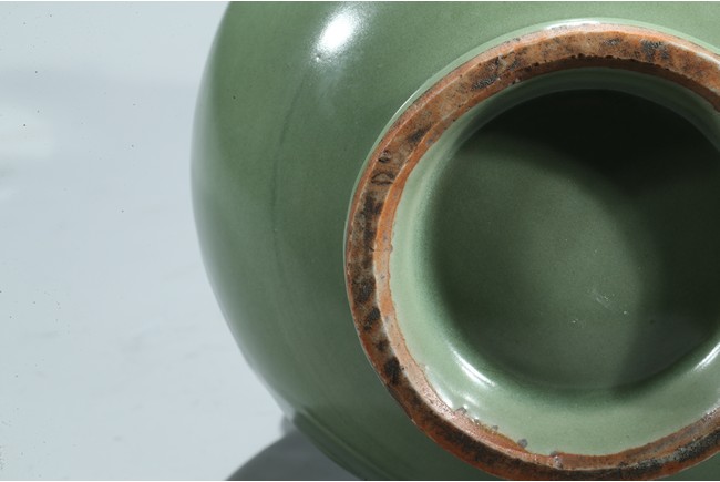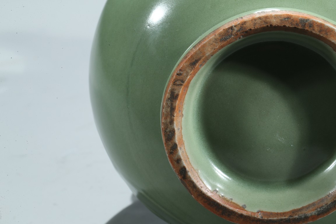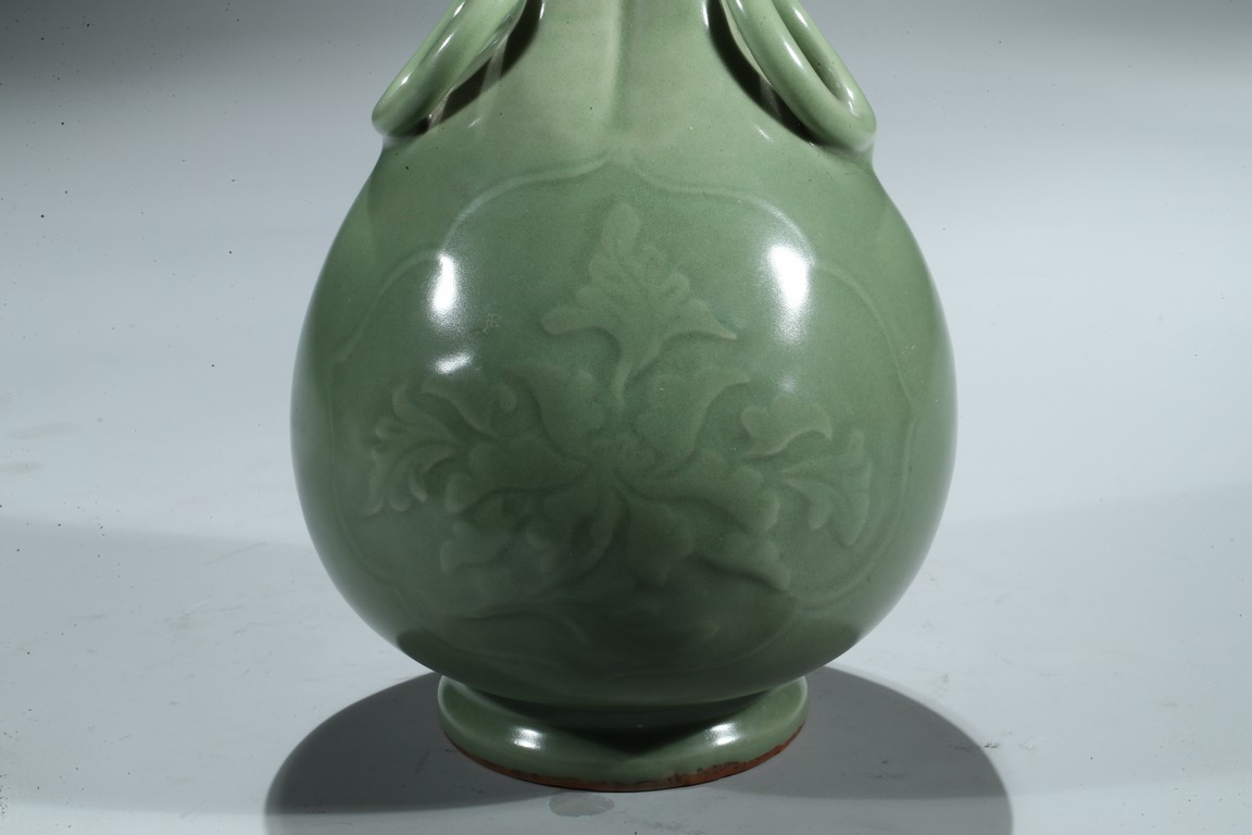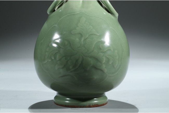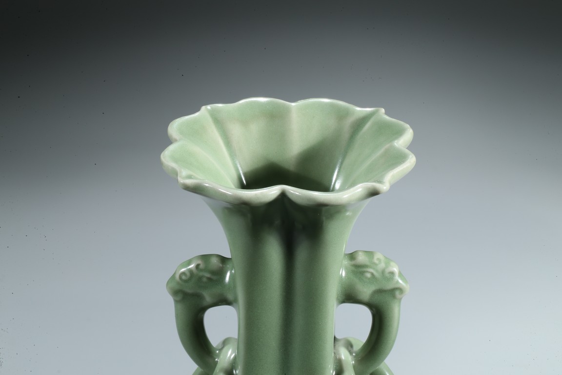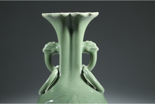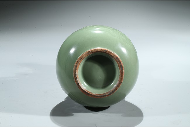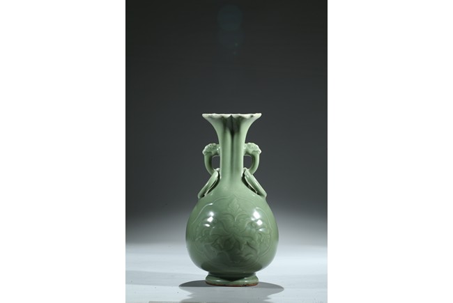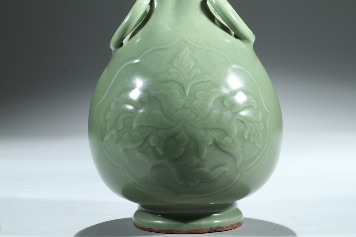 The bulbous body rising from a slightly splayed foot to a waisted neck and a lobed everted rim, set with two mythical beast handles suspending mock rings, deftly moulded on each side with a leafy peony flower enclosed in shaped border and applied overall with a thick celadon glaze, the unglazed footring fired to pale orange. Ming Dynasty period.