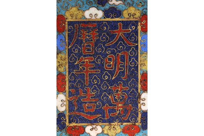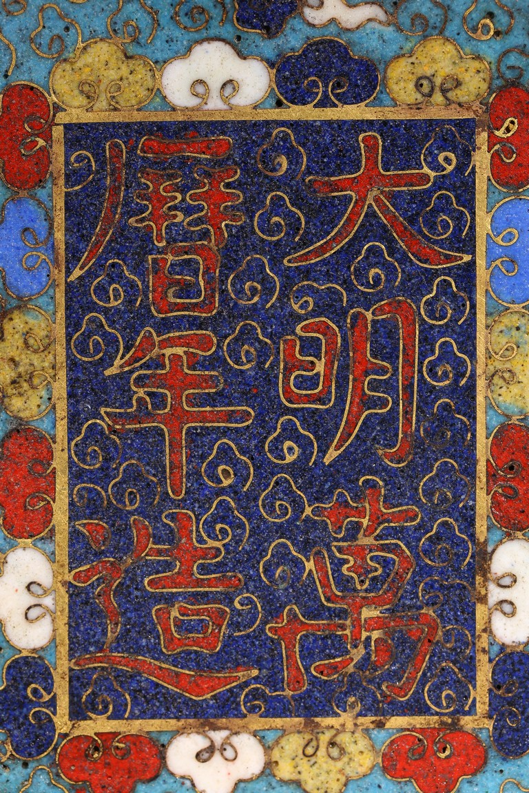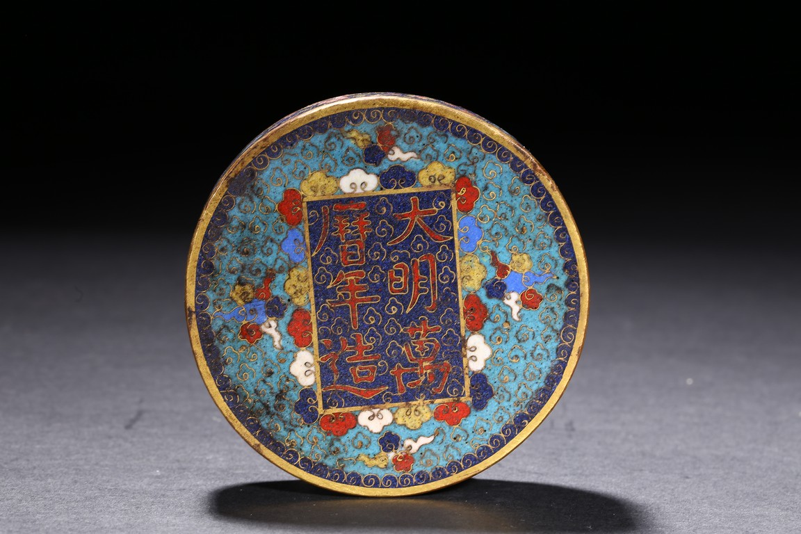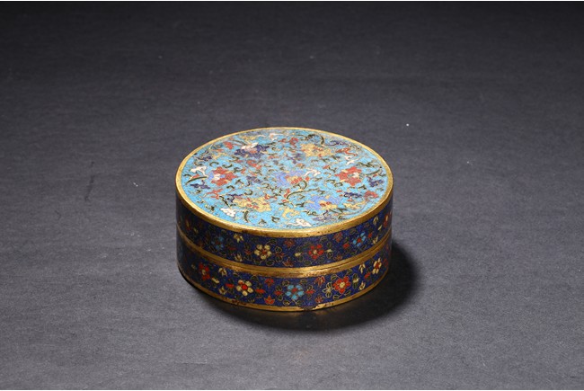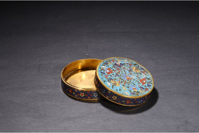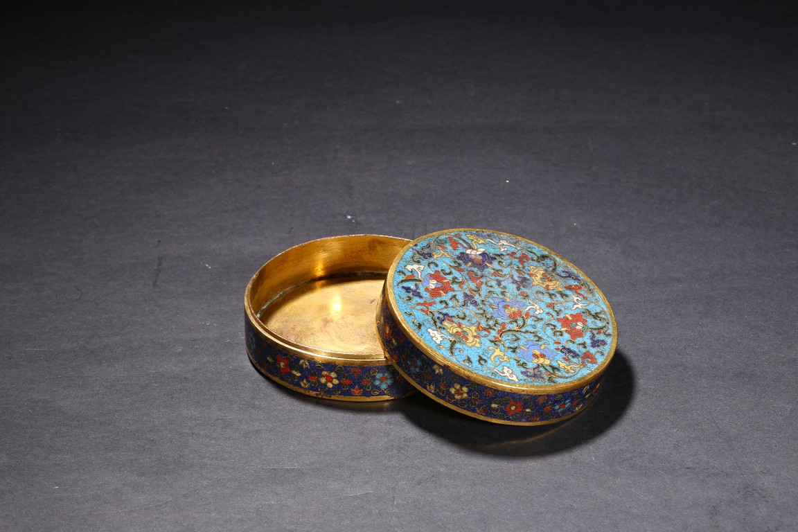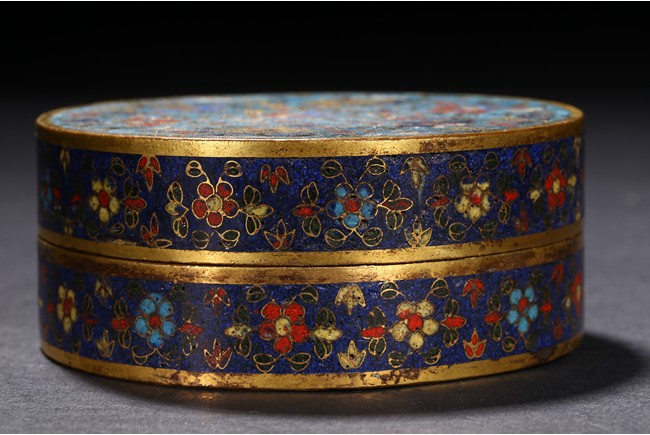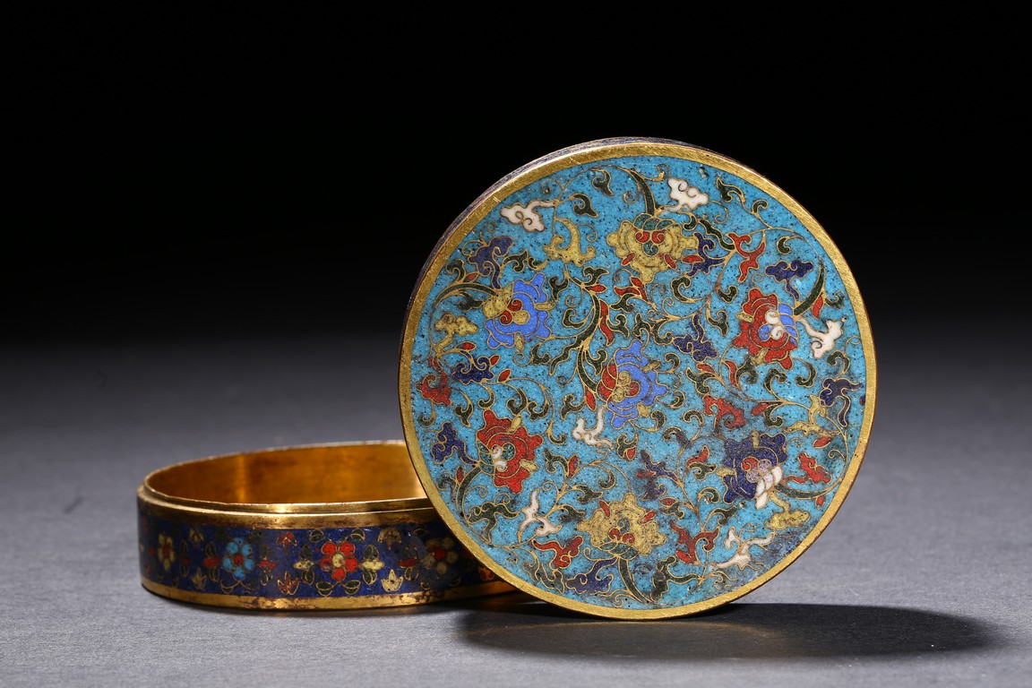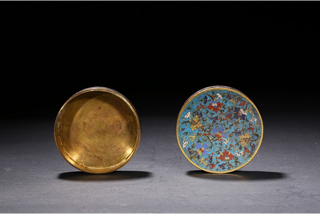 Of circular form, enamelled with a design of lotus in red, blue, and yellow on the cover, flanked by blossoming flowers and vines on side. Mouth rim and interior in gilt-bronze, the base with six characters 'DA MING' mark. Ming Dynasty period.