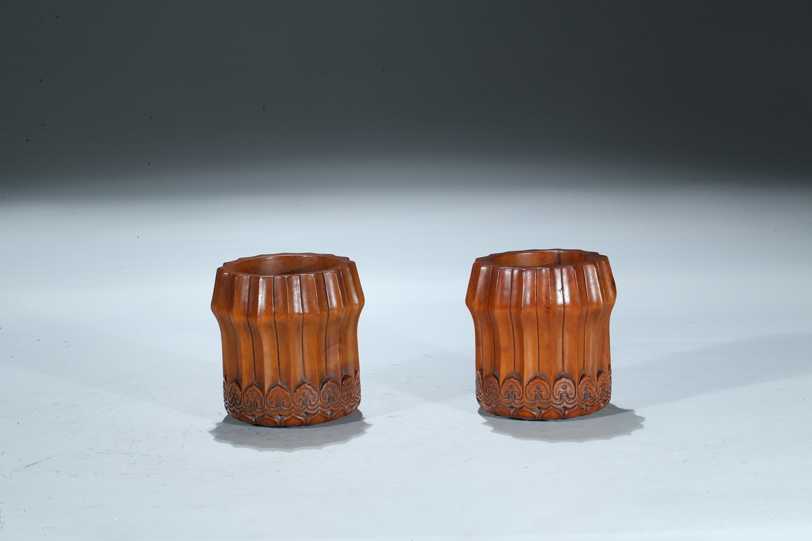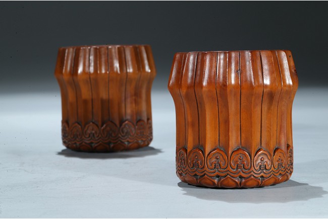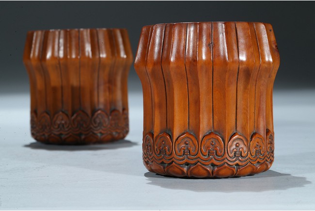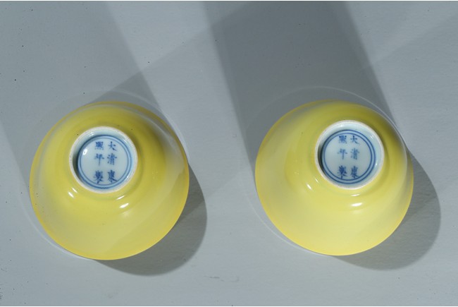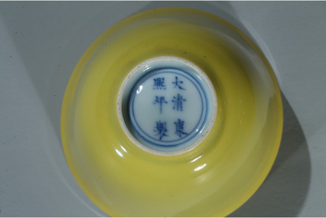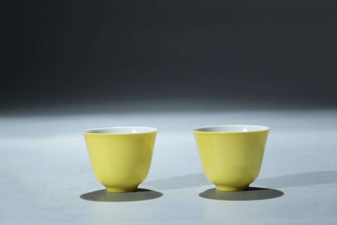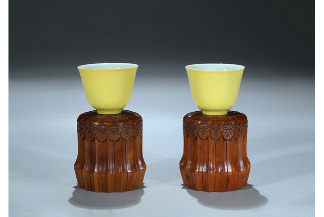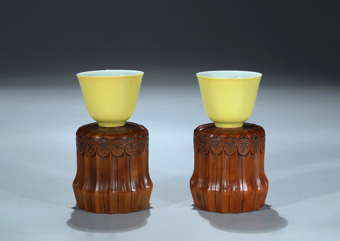 本品直口,深腹,圈足,杯形小巧俊秀,顯曲線流動之趣。內壁施白釉,外壁檸檬黃釉,純淨嬌嫩,明麗奪目,晶瑩透亮,與整器的輕盈靈透相得益彰。底部施白釉,堅細勻淨,並署“大清康熙年制”青花雙行楷書款,字體清秀工整,神韻雅緻俱存。本品胎釉精良,出色純粹勻淨,更為難得的是此杯能夠成對保存完整,亦帶原配黃楊木蓮瓣紋底座,黃楊木本身生長速度極其緩慢,有千年黃楊長一寸之說,《閒情偶寄》載“黃楊每歲一寸,不溢分毫,至閏年反縮一寸,是天限之命也。”是為傳世所見康熙朝檸檬黃釉瓷器之中品格至佳至美者。