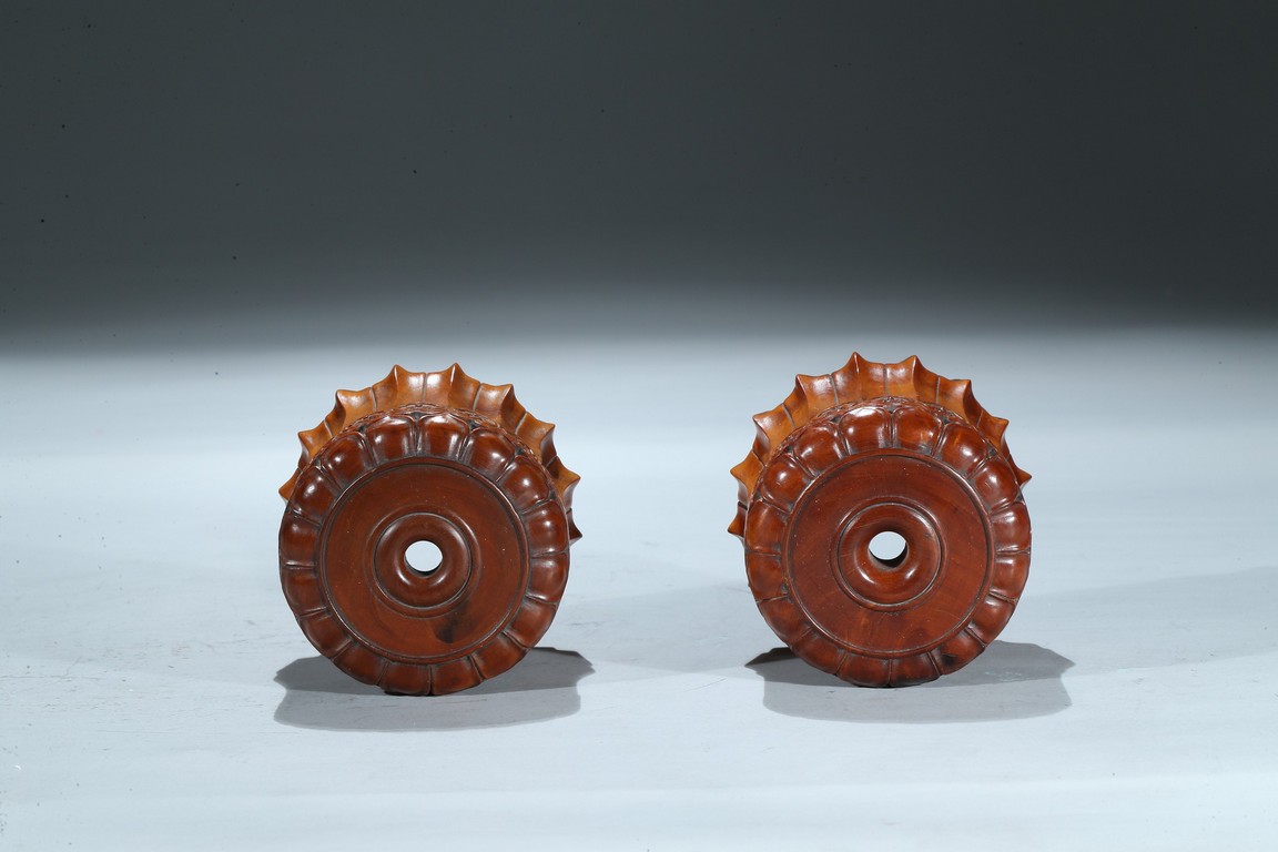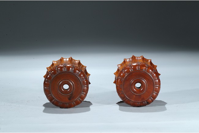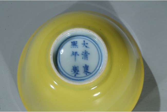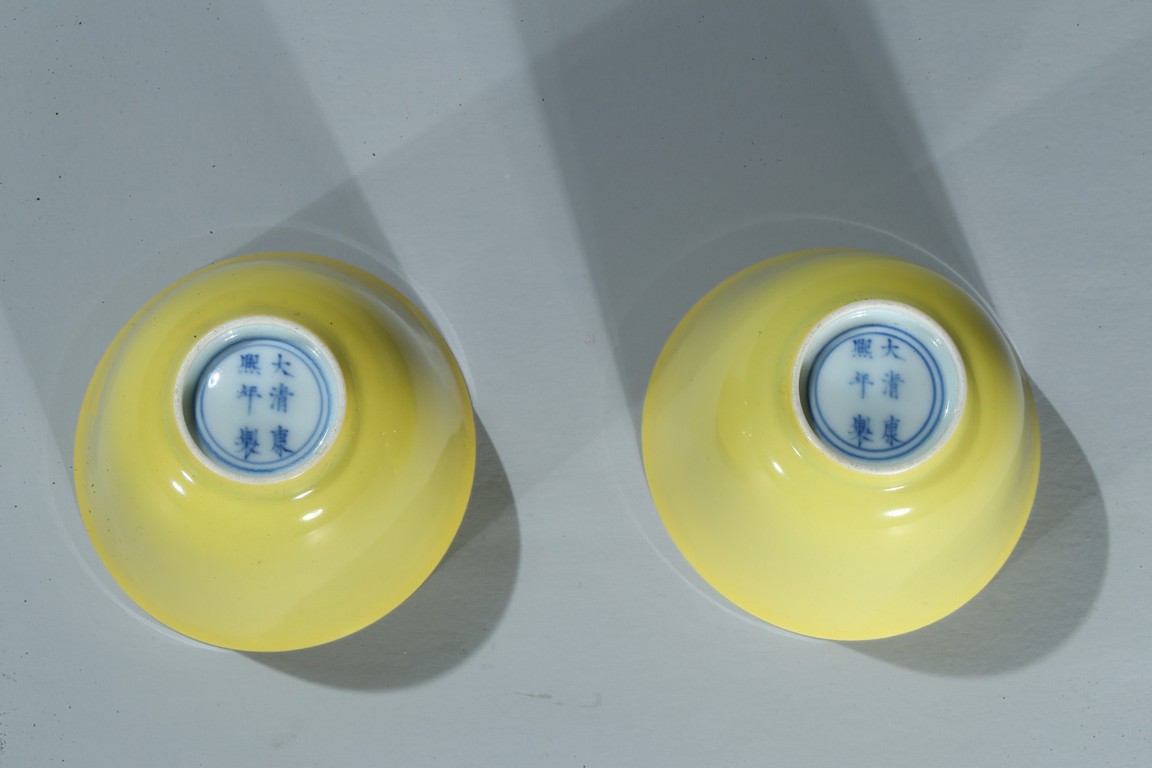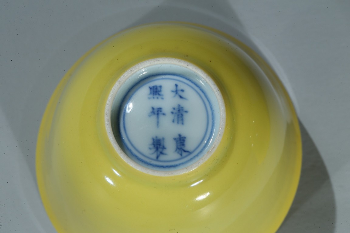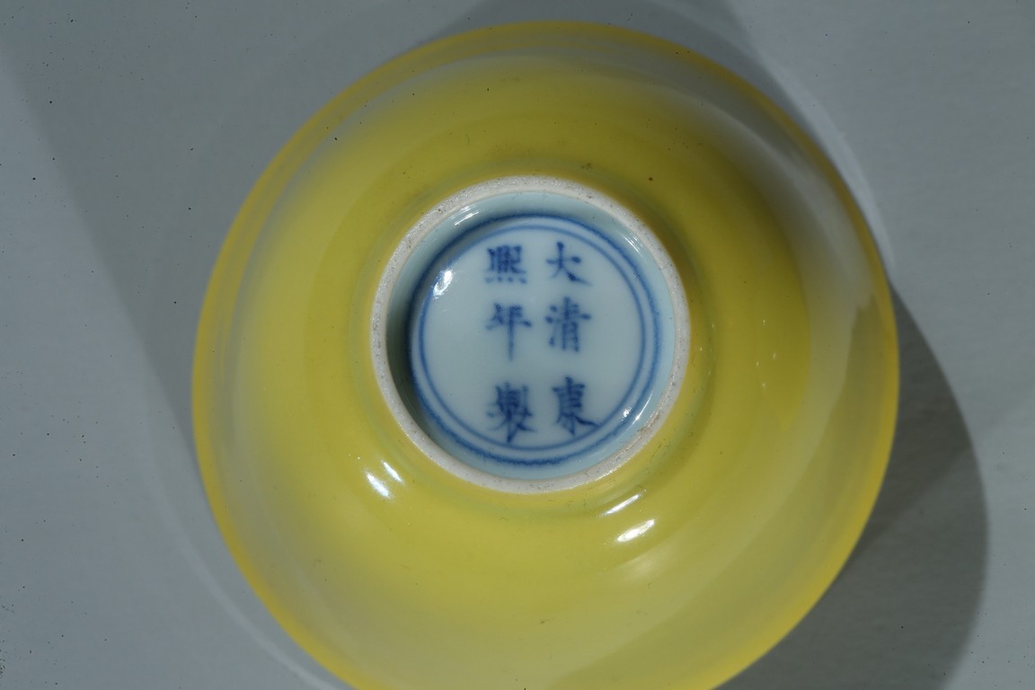 The rounded sides rising from a short straight foot to an everted rim, the exterior covered with an even bright yellow glaze stopping neatly at the foot, inscribed to the base with an underglaze-blue seal mark. Accompanied with two finely carved huangyang wood stands. Qing Dynasty Kangxi period.