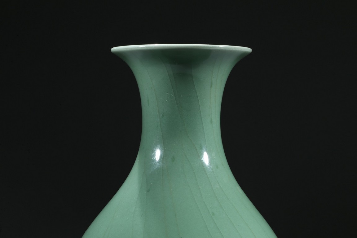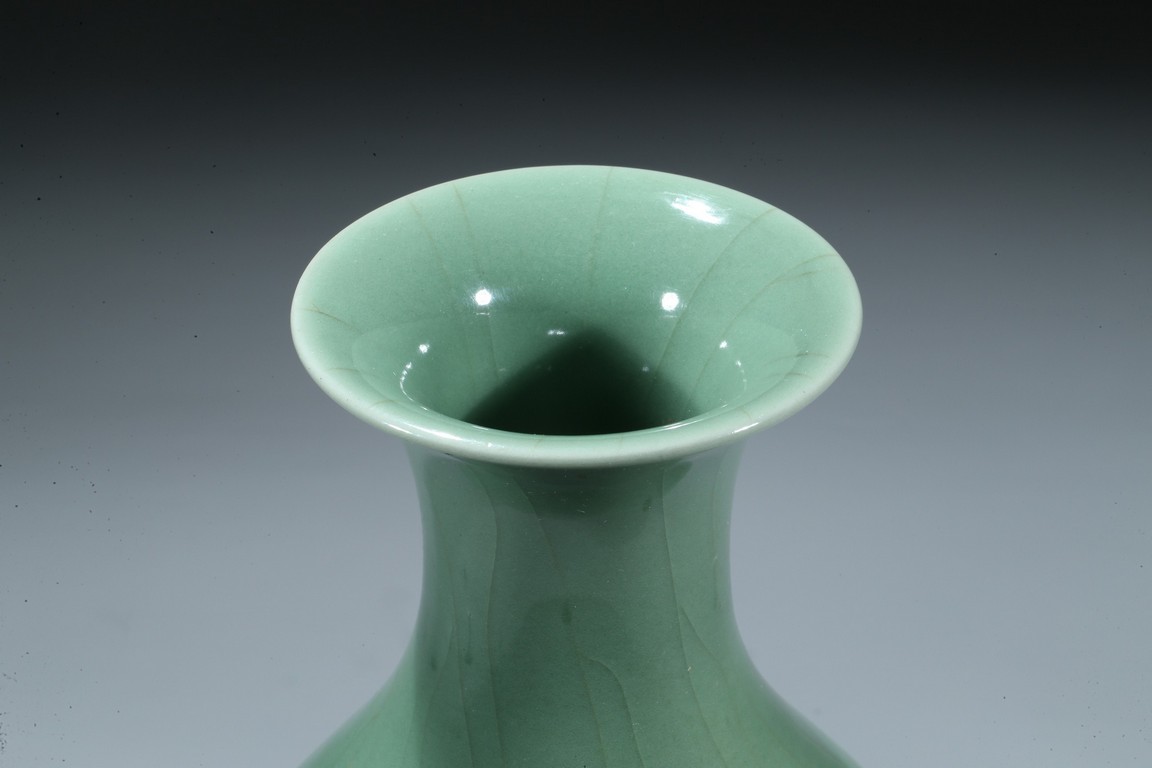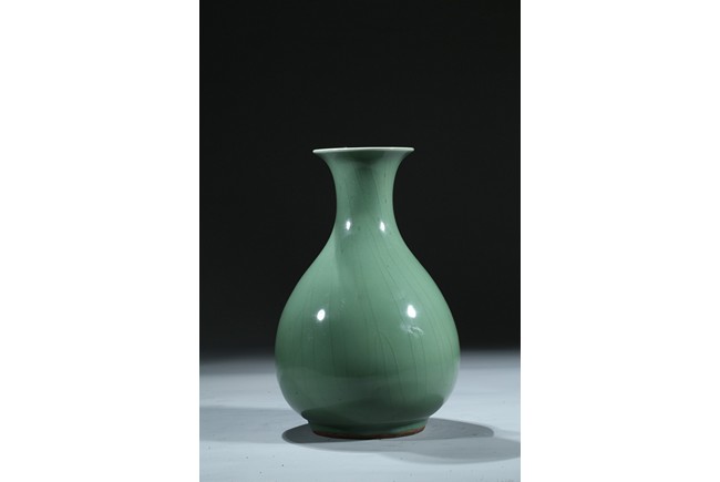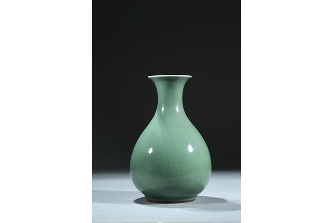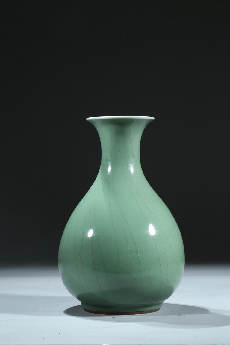 Of elegant yuhuchun form, the pear-shaped body rising from a spreading foot to a waisted neck, the exterior in an attractive olive green glaze with fine crackles. Ming Dynasty period.