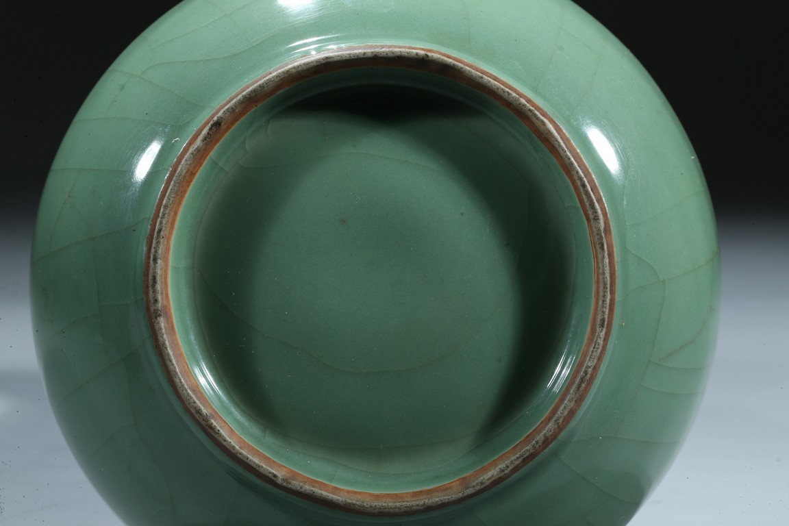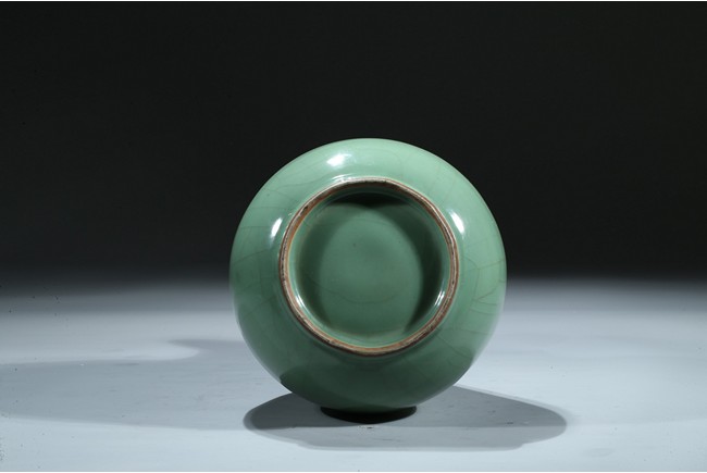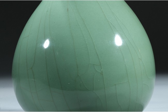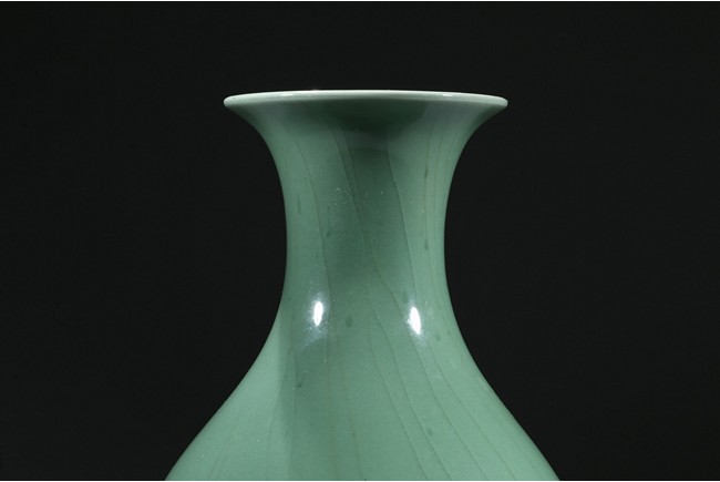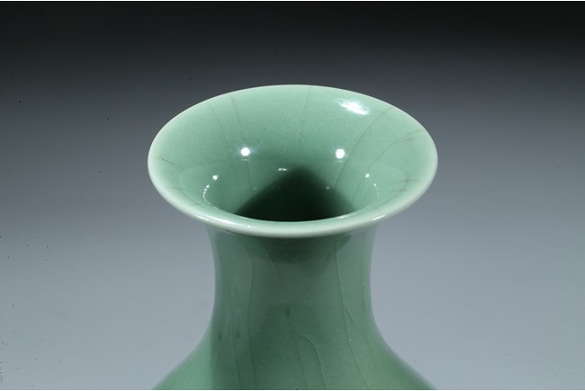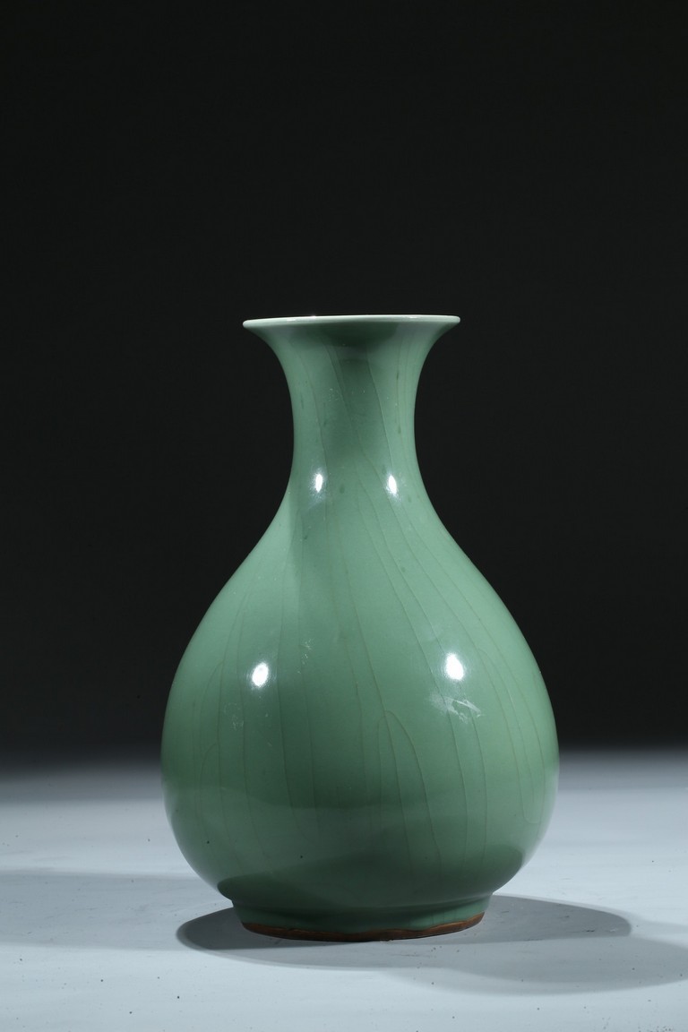 此瓶撇口圓唇,直頸,溜肩,垂鼓腹,底呈圈足;此瓶器形修長飽滿,秀美挺拔,曲線玲瓏,線條優美。加之胎質細膩,胎體較厚,全器施青釉,釉色清淡瑩潤,人稱“橄欖青”者,為元龍泉之佼佼者,釉肥潤,足削平外露胎胎質;在龍泉窯玉壺春瓶中也屬精品之作。此瓶製作考究,保存至今,品相全美,極為珍貴。龍泉窯是著名的青窯瓷場,窯址在今浙江省龍泉縣境內,宋元時期燒造盛極一時,明代在元代的基礎上繼續發展,龍泉窯相比前朝有過之而無不及,在明代重要的器皿中均有龍泉窯的遺蹟,《大明會典》記有洪武二十六年(1393年),“凡燒造供用器皿等物,須要定奪樣制……行移饒、處等府燒造”。即饒州府的景德鎮和處州府的龍泉窯燒造瓷器。