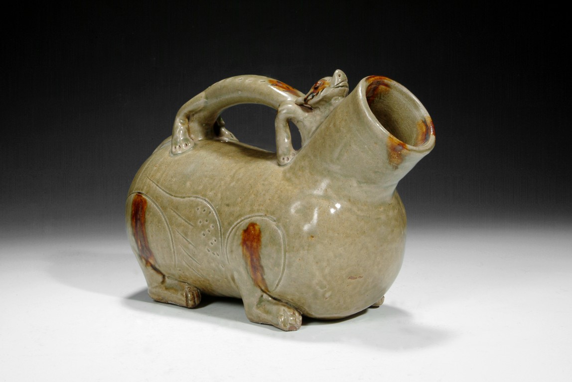 The tapered cylindrical body supported on four small feet,the handle formed by a slender chilong crouching behind the vessel's wide gaping mouth,all under a thin olive-green glaze. Western Jin Dynasty period.