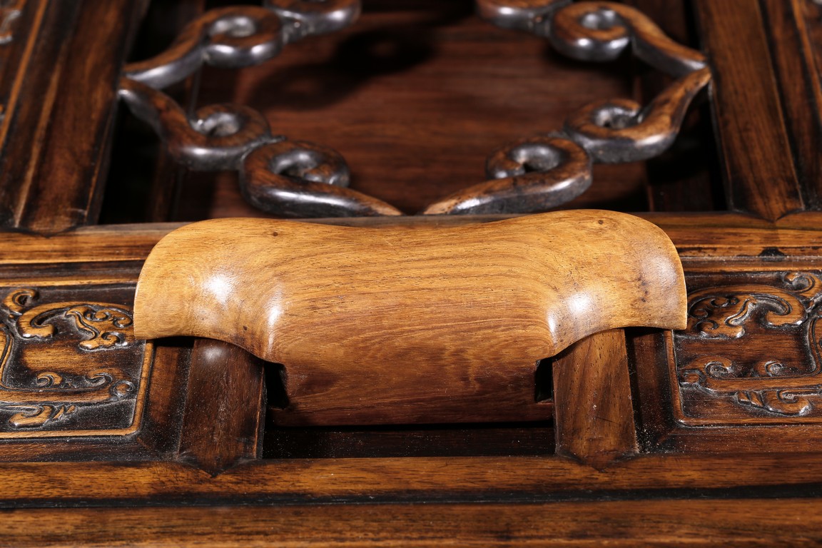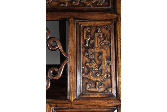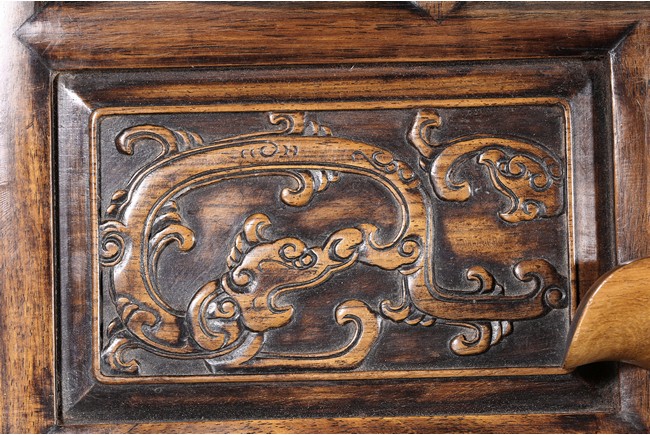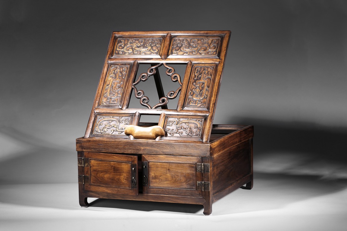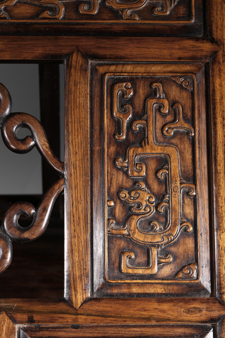 The mirror stand with a rectangular support frame enclosing six rectangular panels,each carved in relief with stylized chilong motif around a central aperture of barbed scrolled design,above a pair of well-figured panel doors fitted flush with the framework,the interior fitted with three zitan drawers,supported on legs of square section ending in hoof feet. Qing Dynasty period.