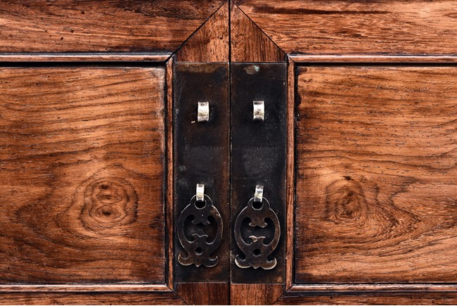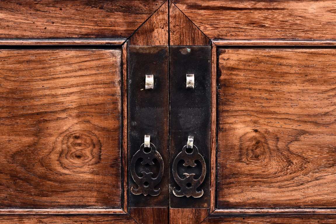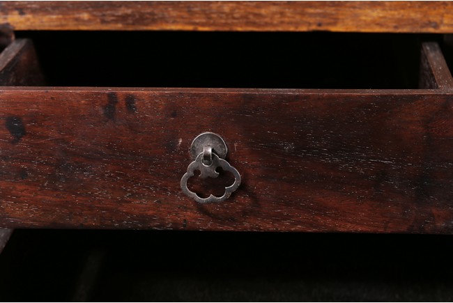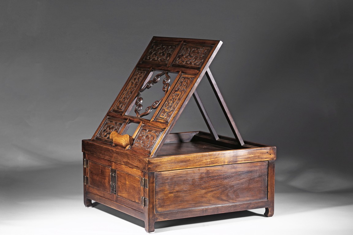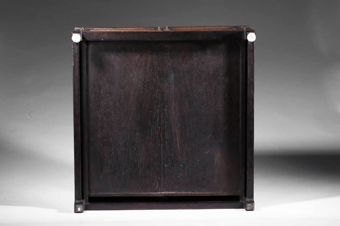 The mirror stand with a rectangular support frame enclosing six rectangular panels,each carved in relief with stylized chilong motif around a central aperture of barbed scrolled design,above a pair of well-figured panel doors fitted flush with the framework,the interior fitted with three zitan drawers,supported on legs of square section ending in hoof feet. Qing Dynasty period.