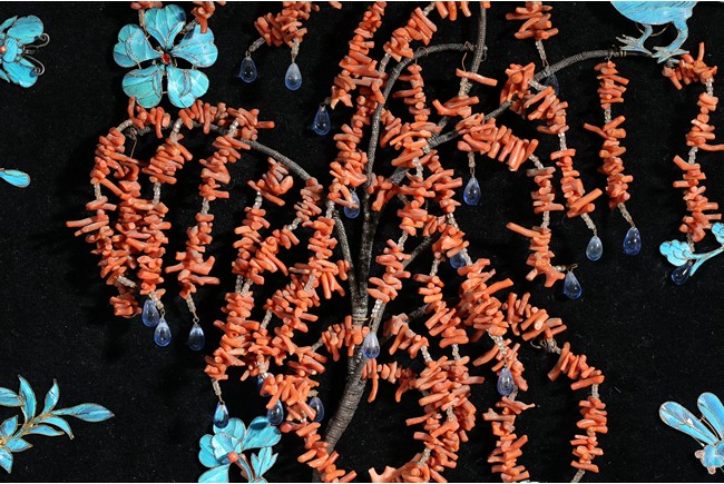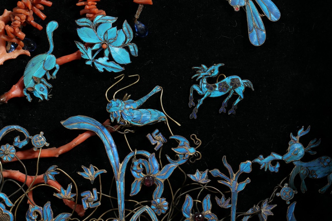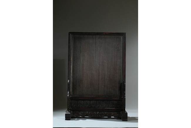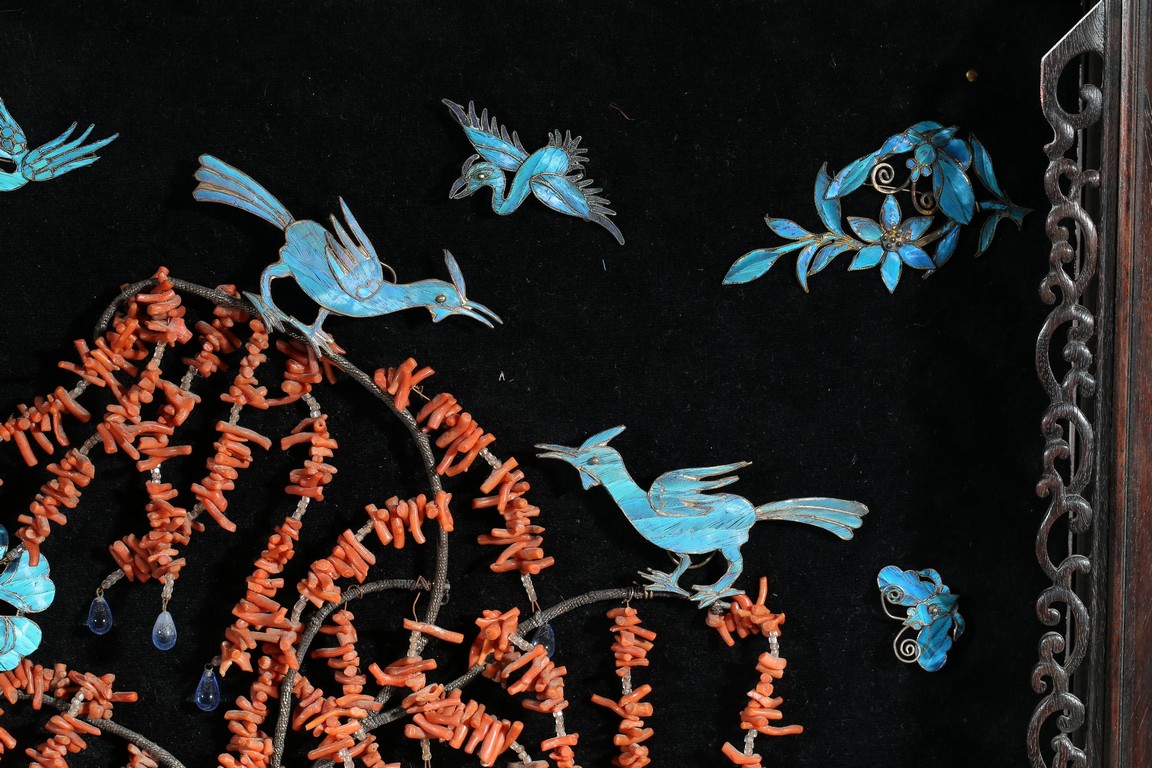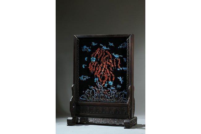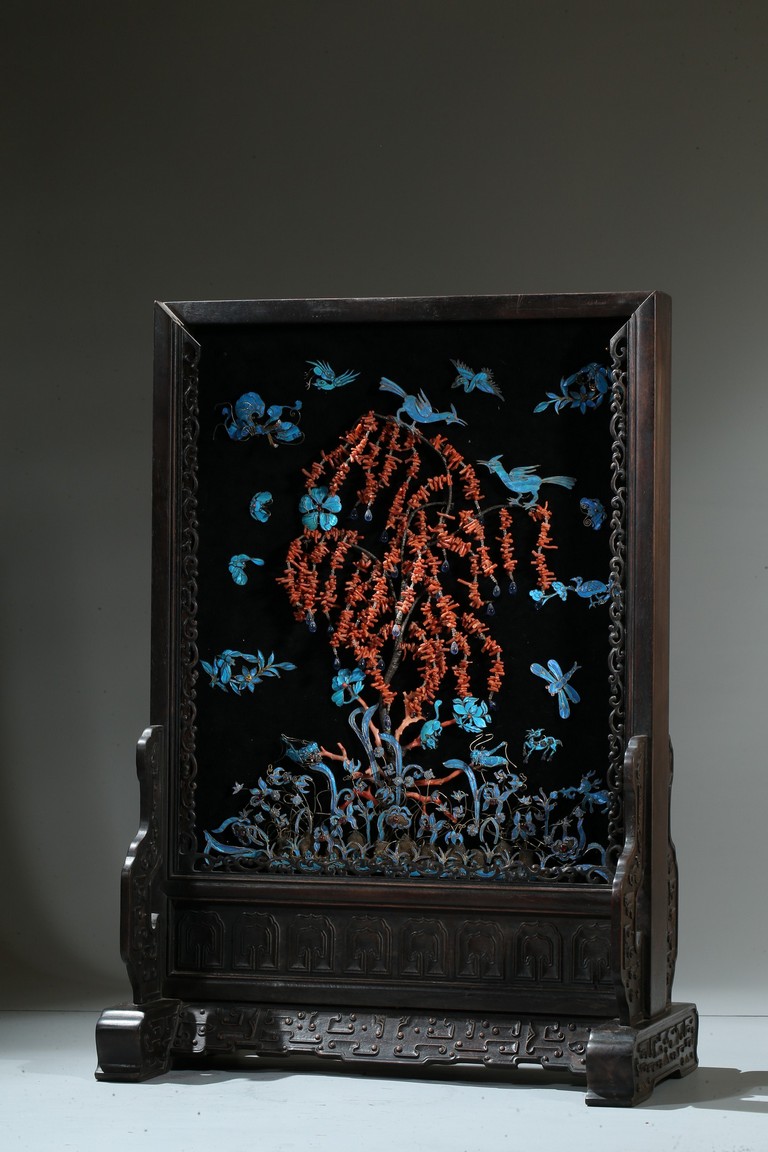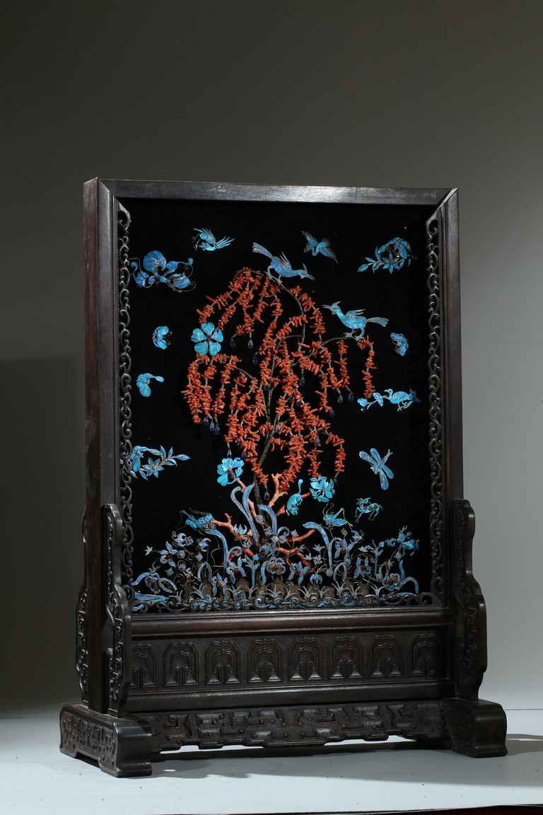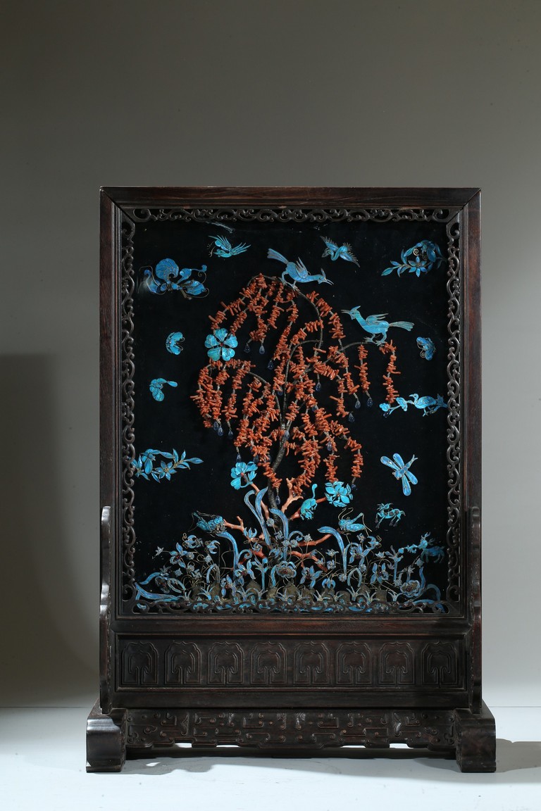 插屏為帶座屏風的一個種類,由底座和屏框兩部分組成。底座上出立柱,用兩道橫棖連接,立柱前後兩面立站牙,起支持穩定作用,內側挖出凹槽,屏框兩豎邊便由此插入。屏風在傢俱中主要起遮蔽的作用,小插屏則放置案上,以為陳設,因此在插屏的畫面上,更講究裝飾材料和表現內容。此件點翠珊瑚'喜鵲報春圖'插屏便是極盡富麗堂皇傾向的代表。屏框正面起混面雙邊線。屏心上掐絲鑲嵌珊瑚樹,並以大片點翠裝飾花鳥蝴蝶。點翠是用翠鳥的毛羽粘於屏上,以增加色彩效果,使之更加碧色醒目。從屏心的畫面內容看,花朵綻放隨風搖曳,楓葉飄落,鳥兒蝴蝶自由飛舞,畫面靜謚祥和,十分難得。來源:紐約私人藏家提供 Provenance: Private collection, New York