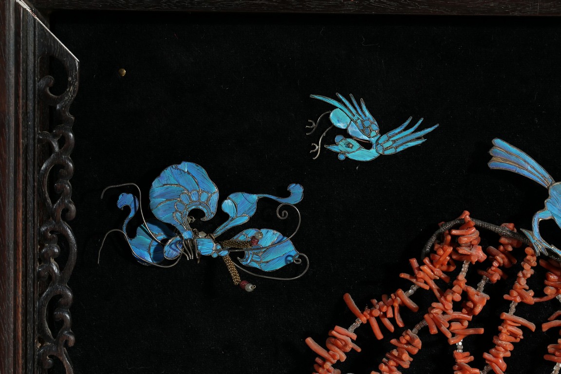 The rectangular panel decorated in brightly colored bird feathers and metal wire to depict magpies and butterflies in inflight in an outdoor garden setting, all surrounding a large coral embellished willow tree, with flowers and orchids down below, all set in a carved zitan frame mounted on a black cloth ground. Qing Dynasty period.